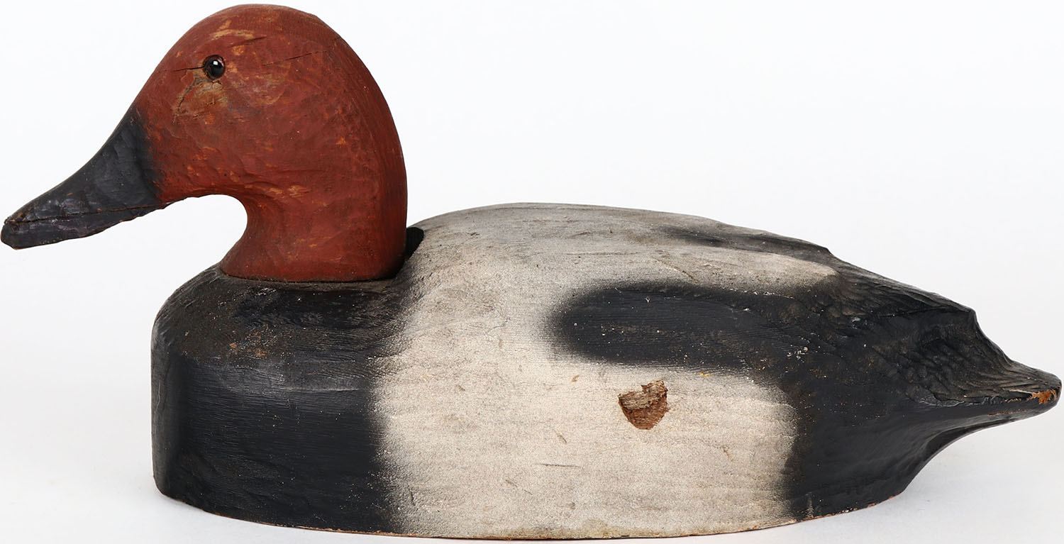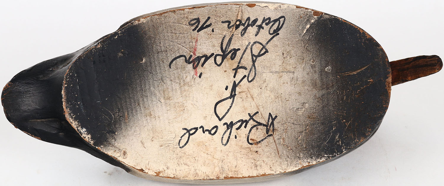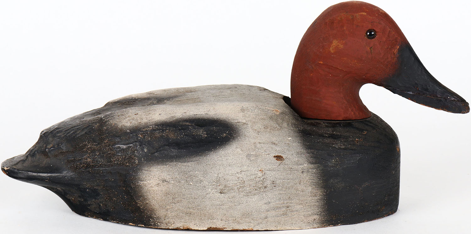Canvasback Drake by Herter's, Labeled by Richard P. Stepien, glass eyes, solid wood, structurally excellent, signed on bottom, original paint. Grade: Excellent - Value: 30 to 60