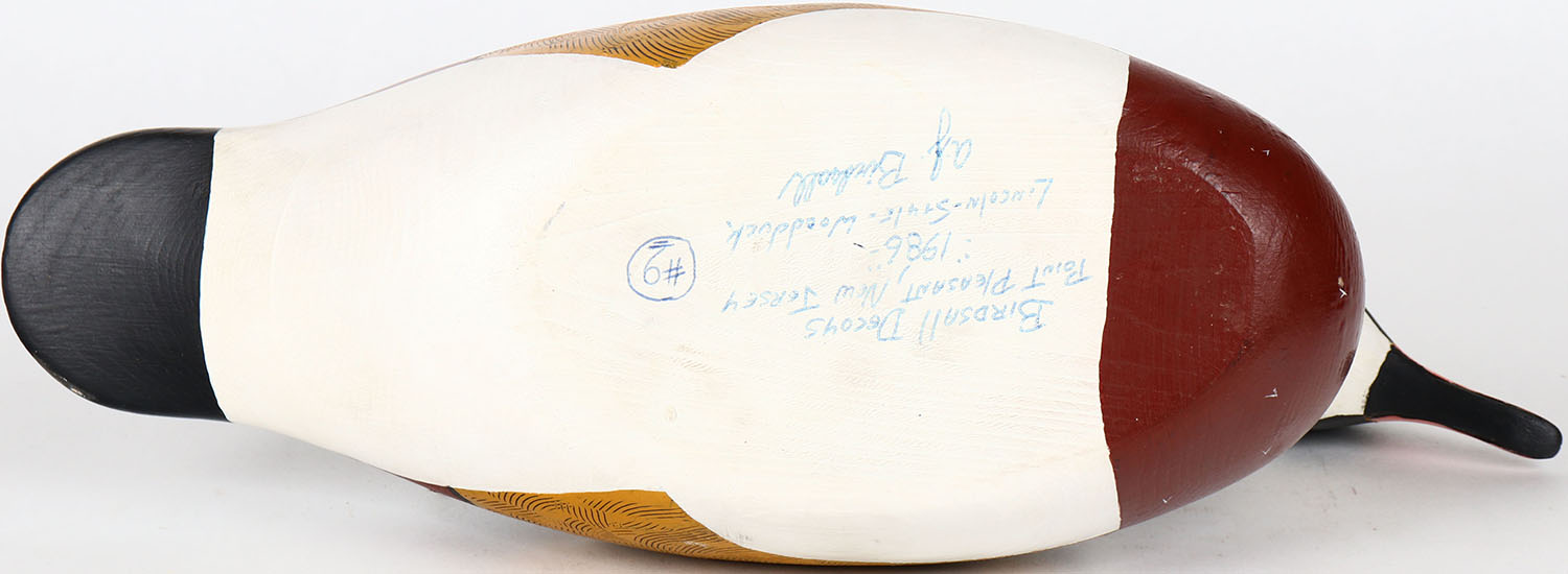 Wood Duck Drake by A.J. Birdsall. Birdsall Decoys, Point Pleasant, New Jersey, glass eyes, hollow wood, structurally excellent, signed on bottom, original paint. Grade: MINT - Value: 100 to 200