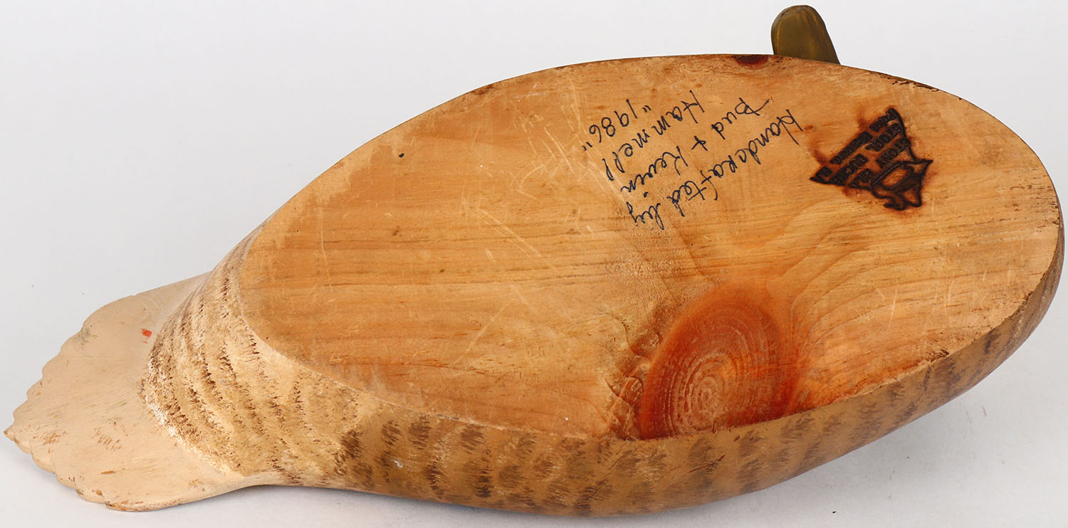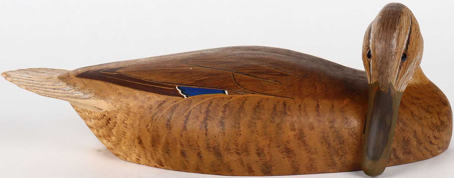 Preening Mallard Hen by Bud and Kevin Hammell, Stony Hill Stool Ducks, Point Pleasant, N.J. glass eyes, solid wood, structurally excellent, signed and branded on bottom, original paint. Grade: MINT - Value: 50 to 100