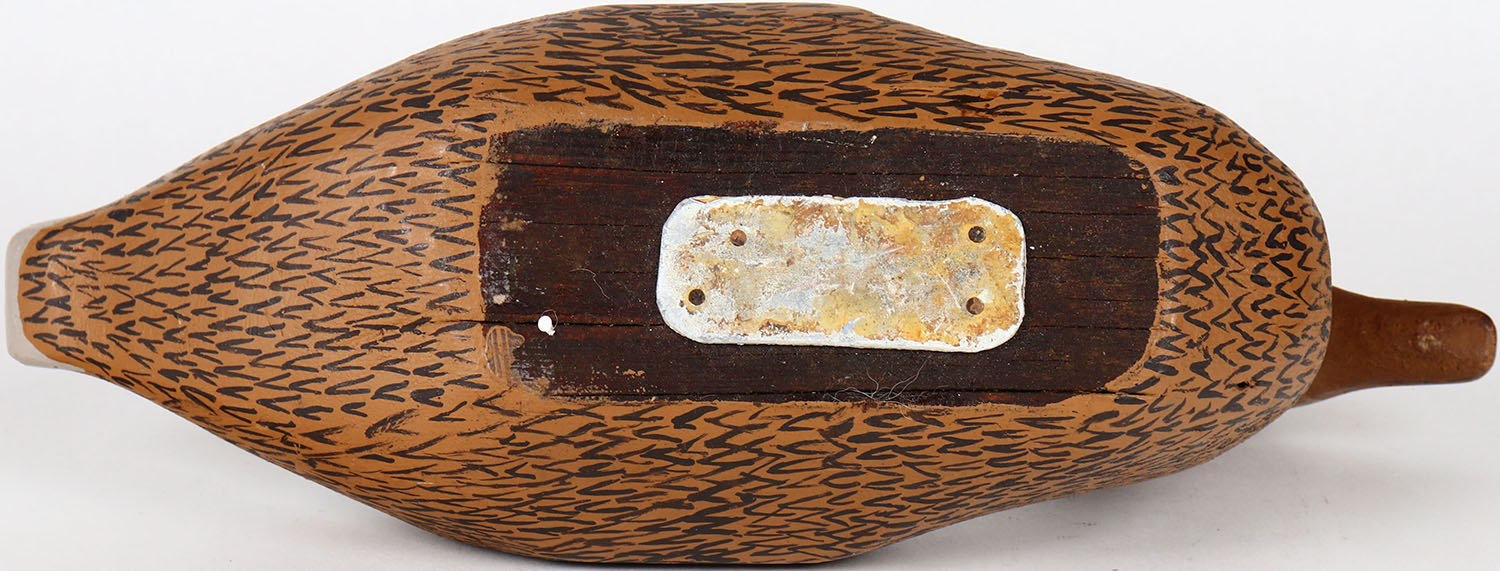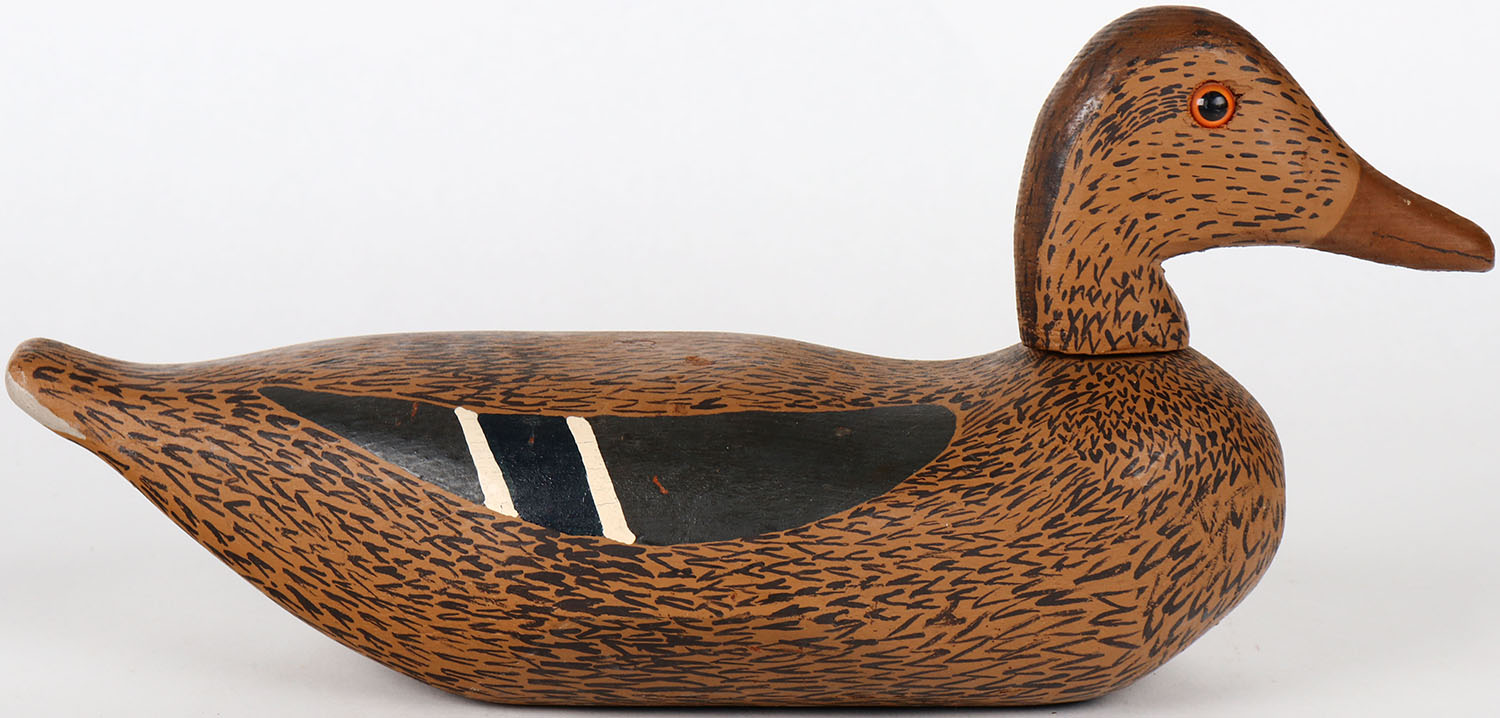 Mallard Hen by unknown maker, WI?, glass eyes, solid wood, head comes off, original paint. Grade: Excellent ++ - Value: 150 to 300
