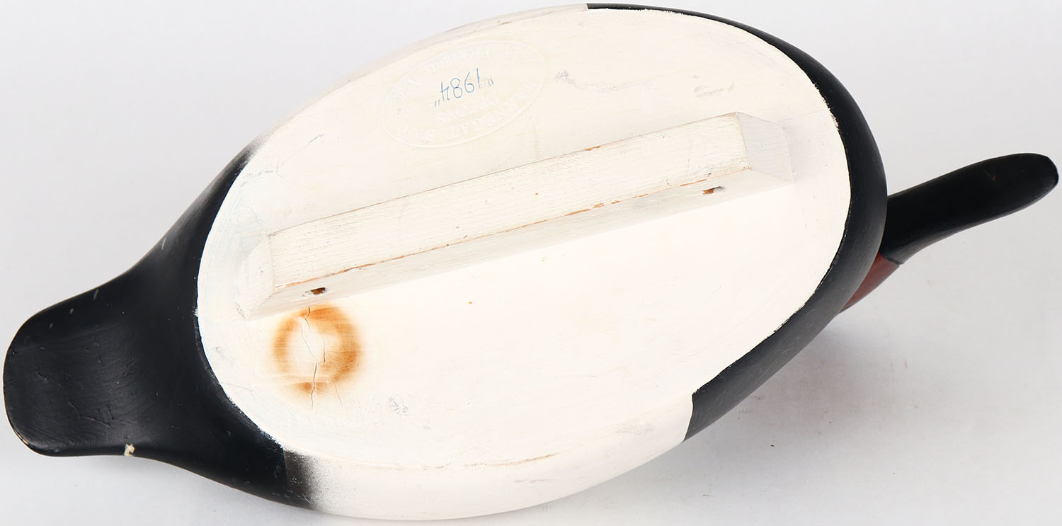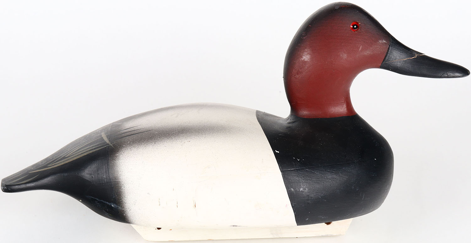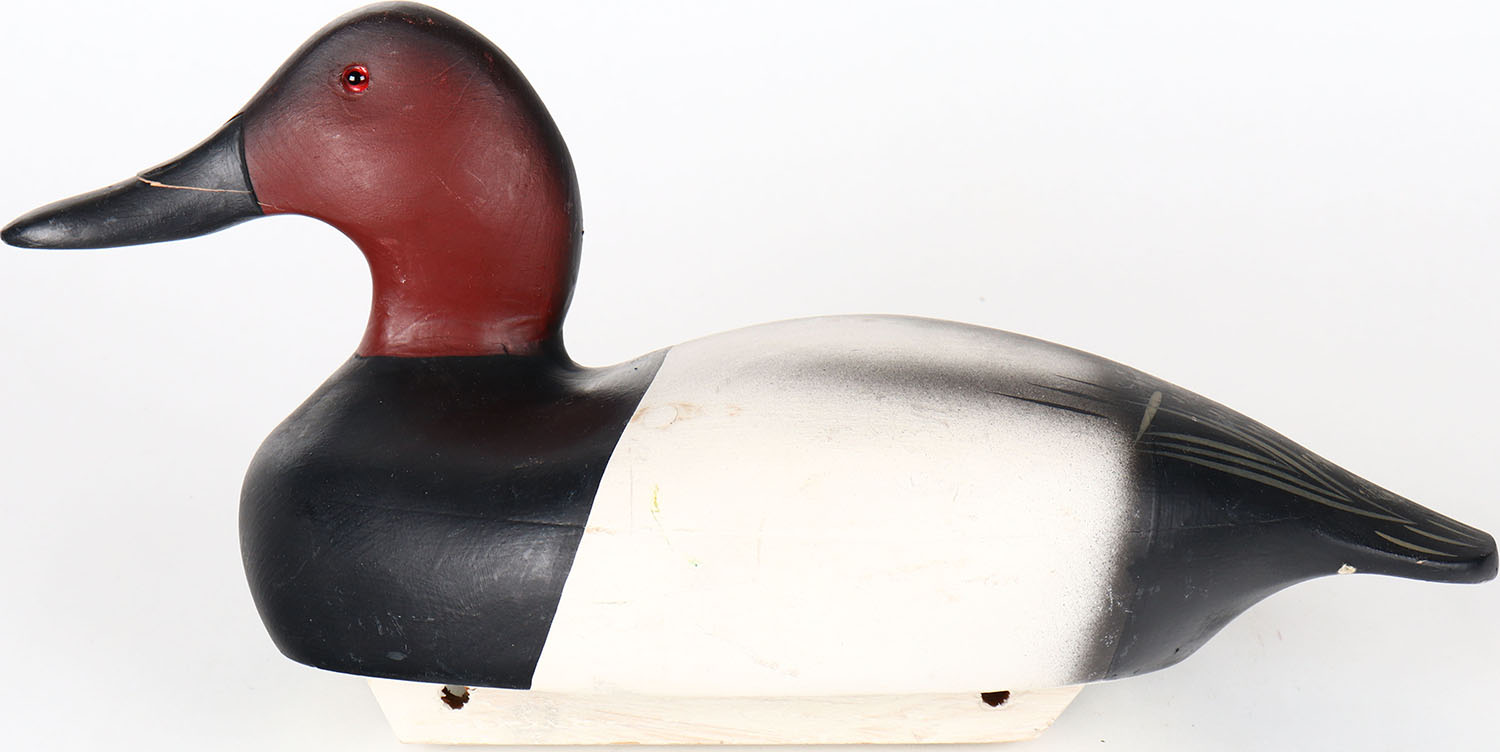 Canvasback Drake by Barnegat Bay Decoys, Pt. Pleasant N.J. glass eyes, hollow wood, bill is cracked, branded on bottom, original paint. Grade: Very Good ++ - Value: 50 to 100
