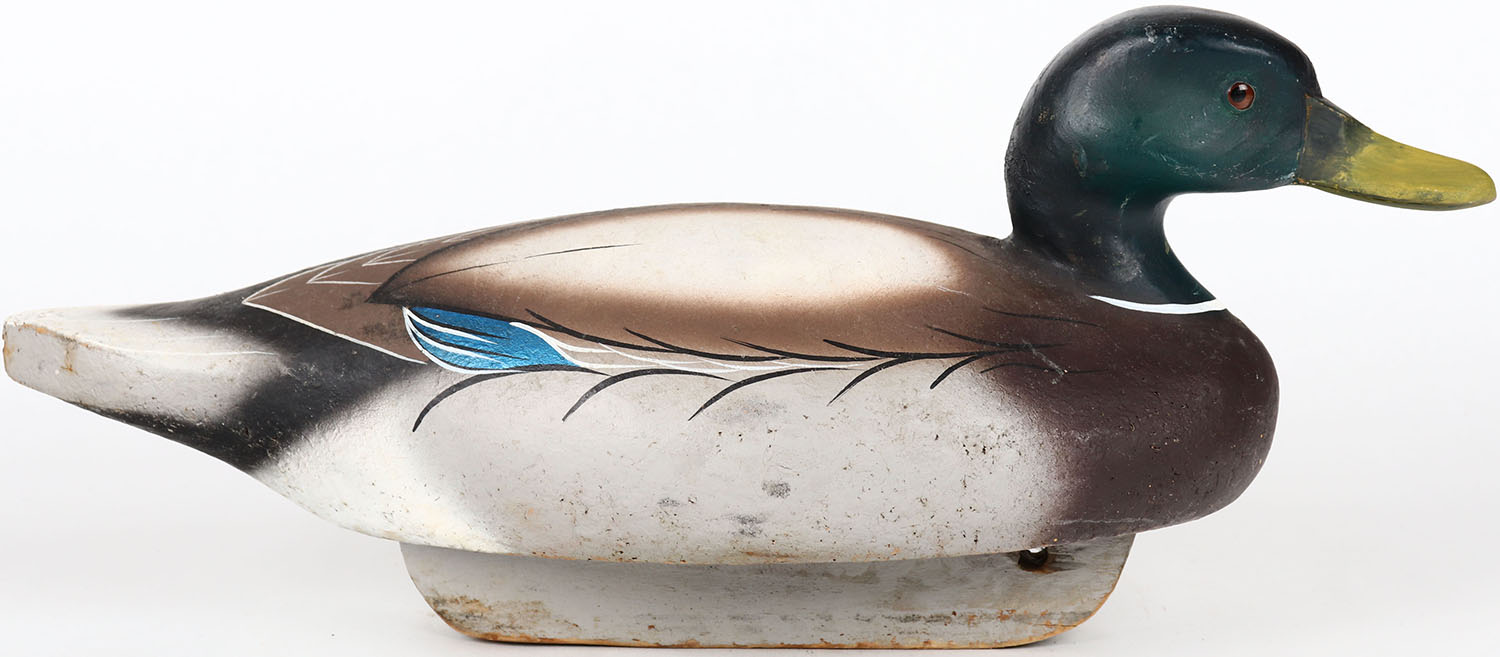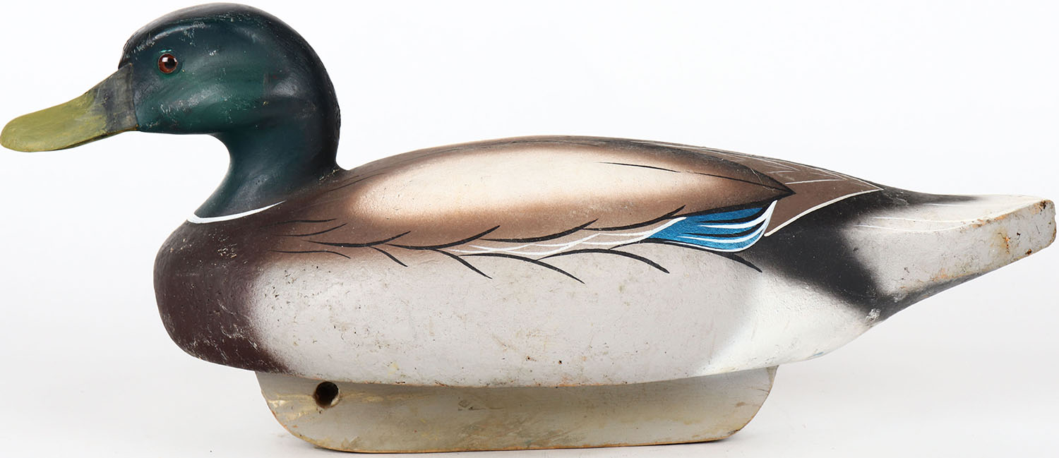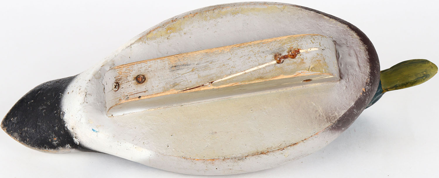Mallard Drake by unknown maker, glass eyes, solid balsa wood, structurally excellent, original paint. Grade: Excellent + - Value: 50 to 100