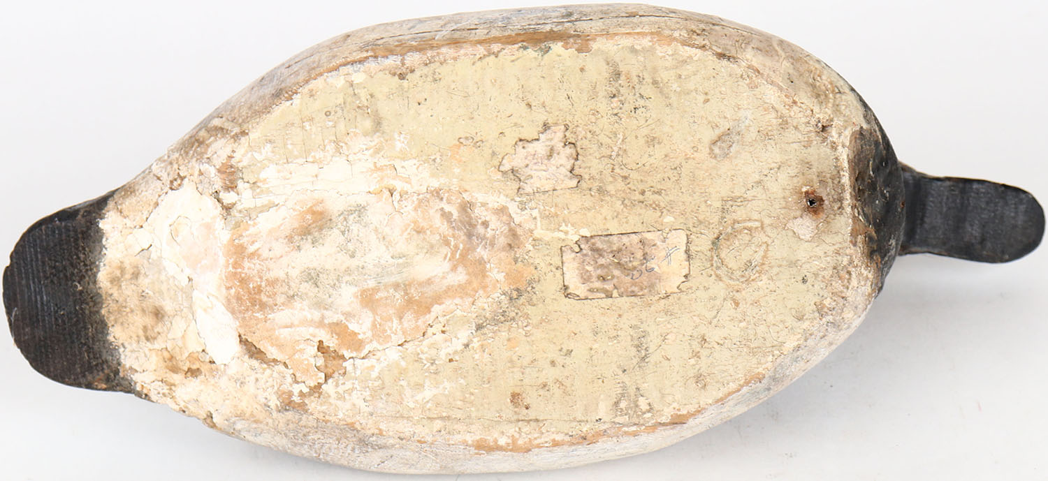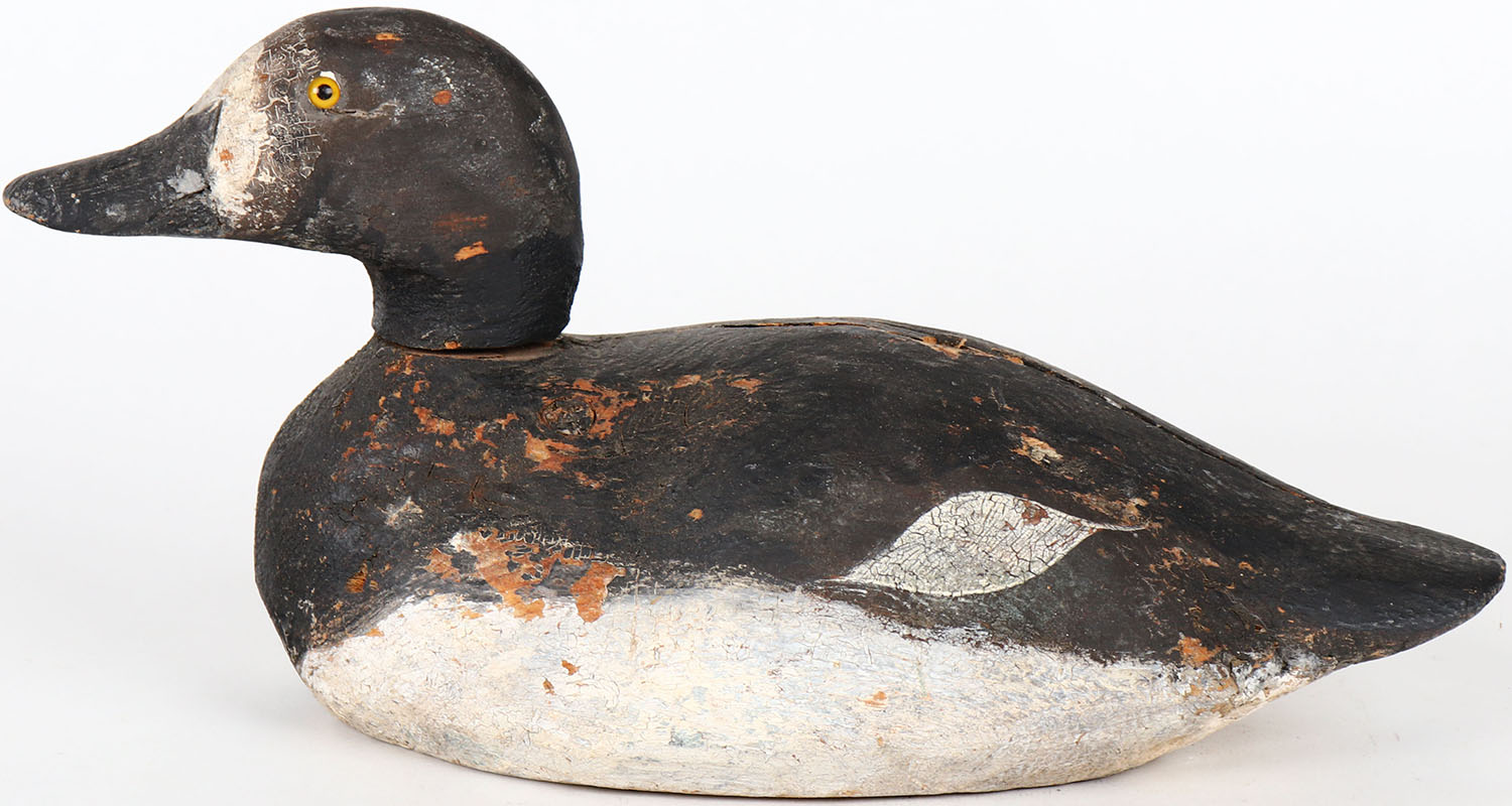 Bluebill Drake by unknown maker, glass eyes, solid wood, head is loose, has age crack on back and side, original paint. Grade: Very Good + - Value: 40 to 80