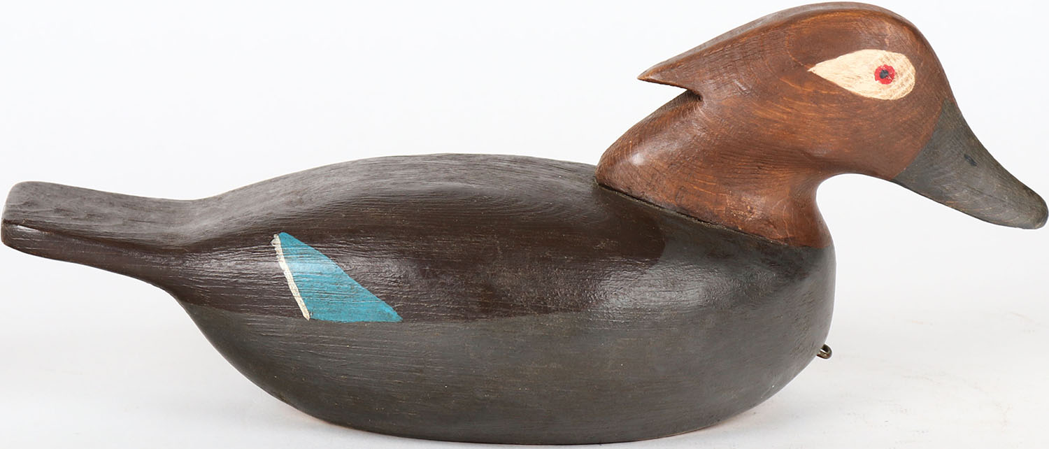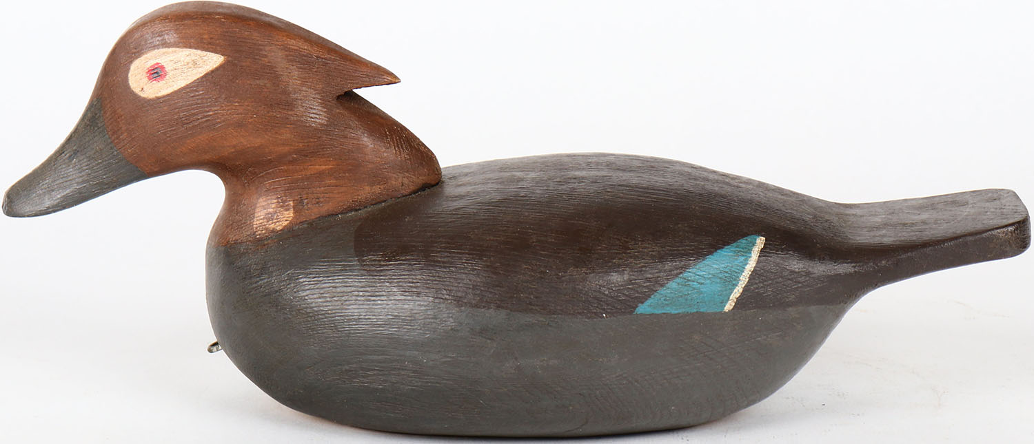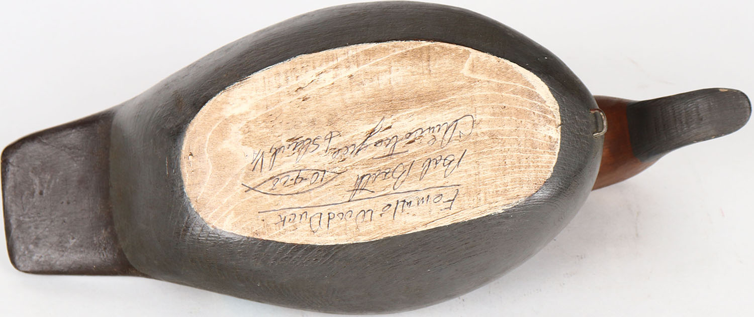 Wood Duck Hen by Bob Booth, Chincoteague, Virginia, painted eyes, hollow wood, structurally excellent, signed on bottom, original paint. Grade: MINT - Value: 40 to 80