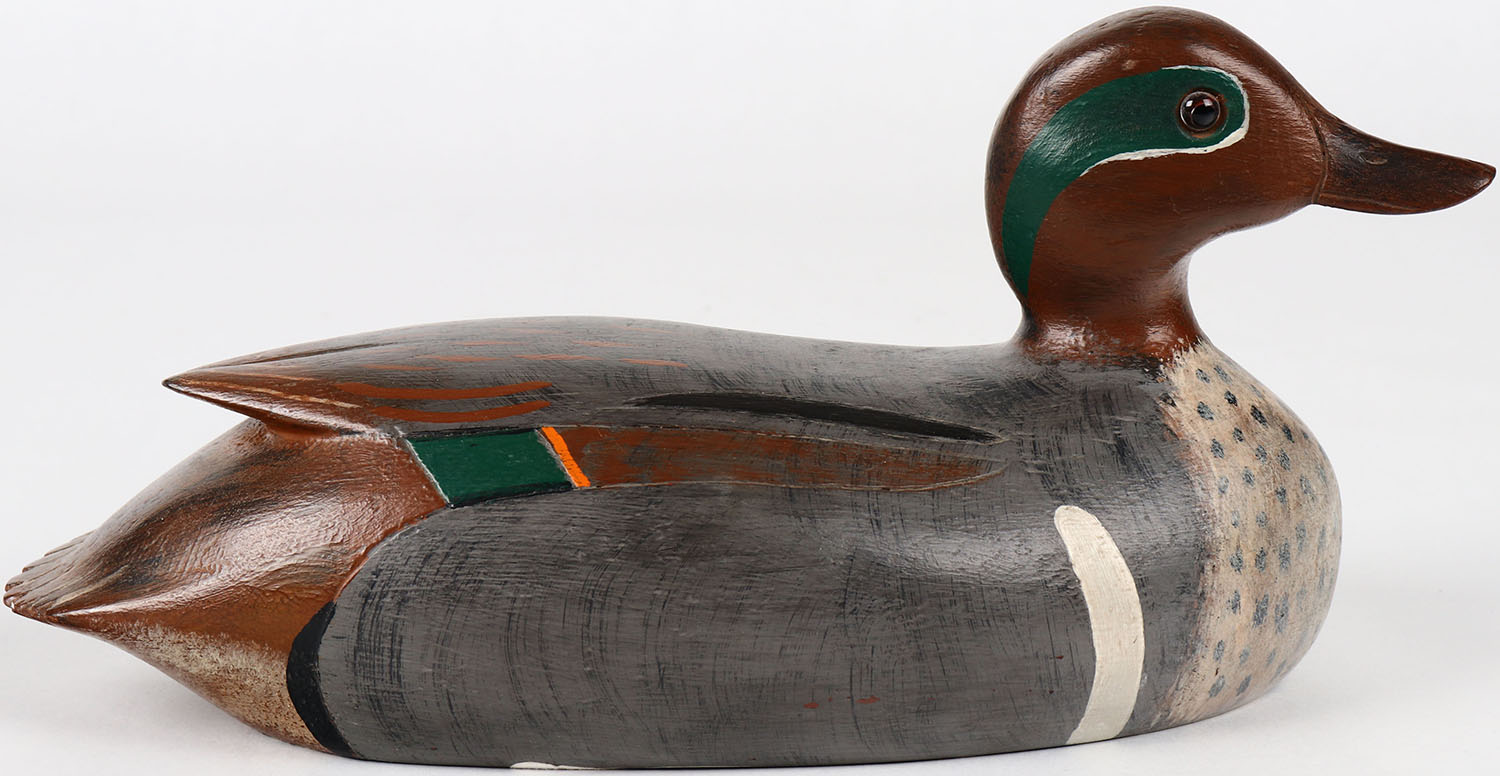 Green Wing Teal Drake by RT Harman, Morton, ONT, glass eyes, solid wood, structurally excellent, signed on bottom, original paint. Grade: MINT - Value: 150 to 300