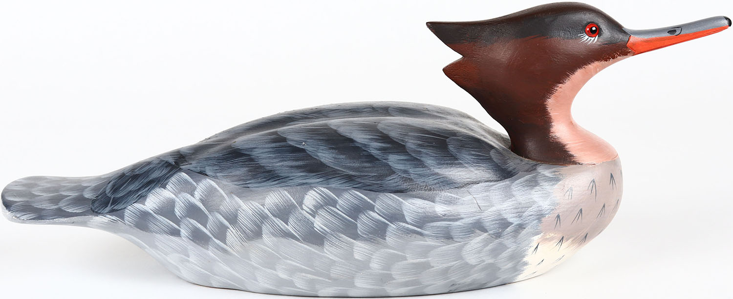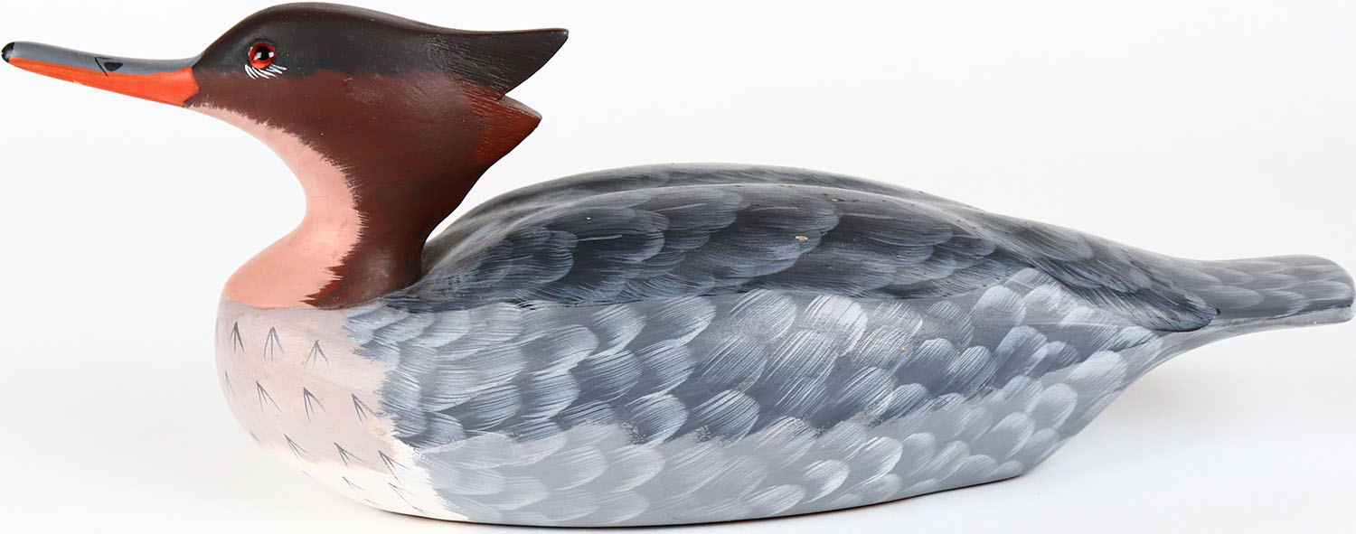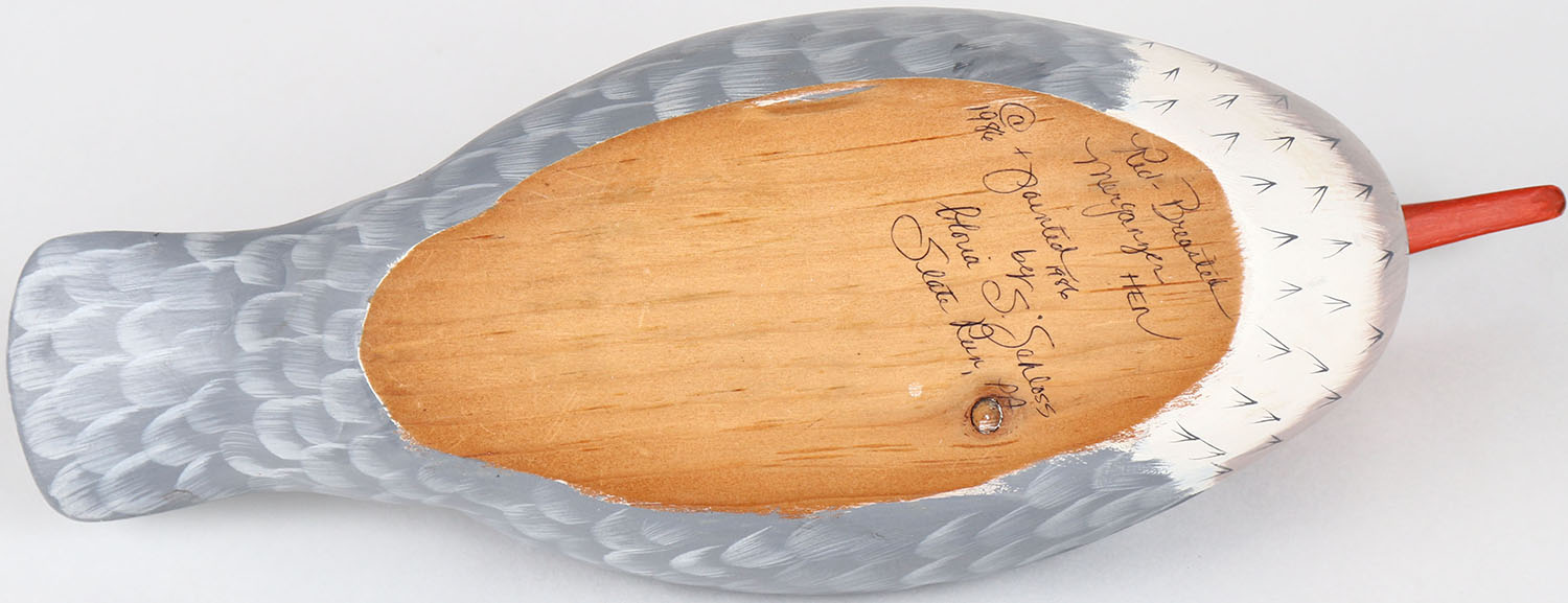 Red Breasted Merganser Hen by Gloria S. Schloss, Slate Run, PA, glass eyes, solid wood, structurally excellent, signed on bottom, original paint. Grade: MINT - Value: 40 to 80
