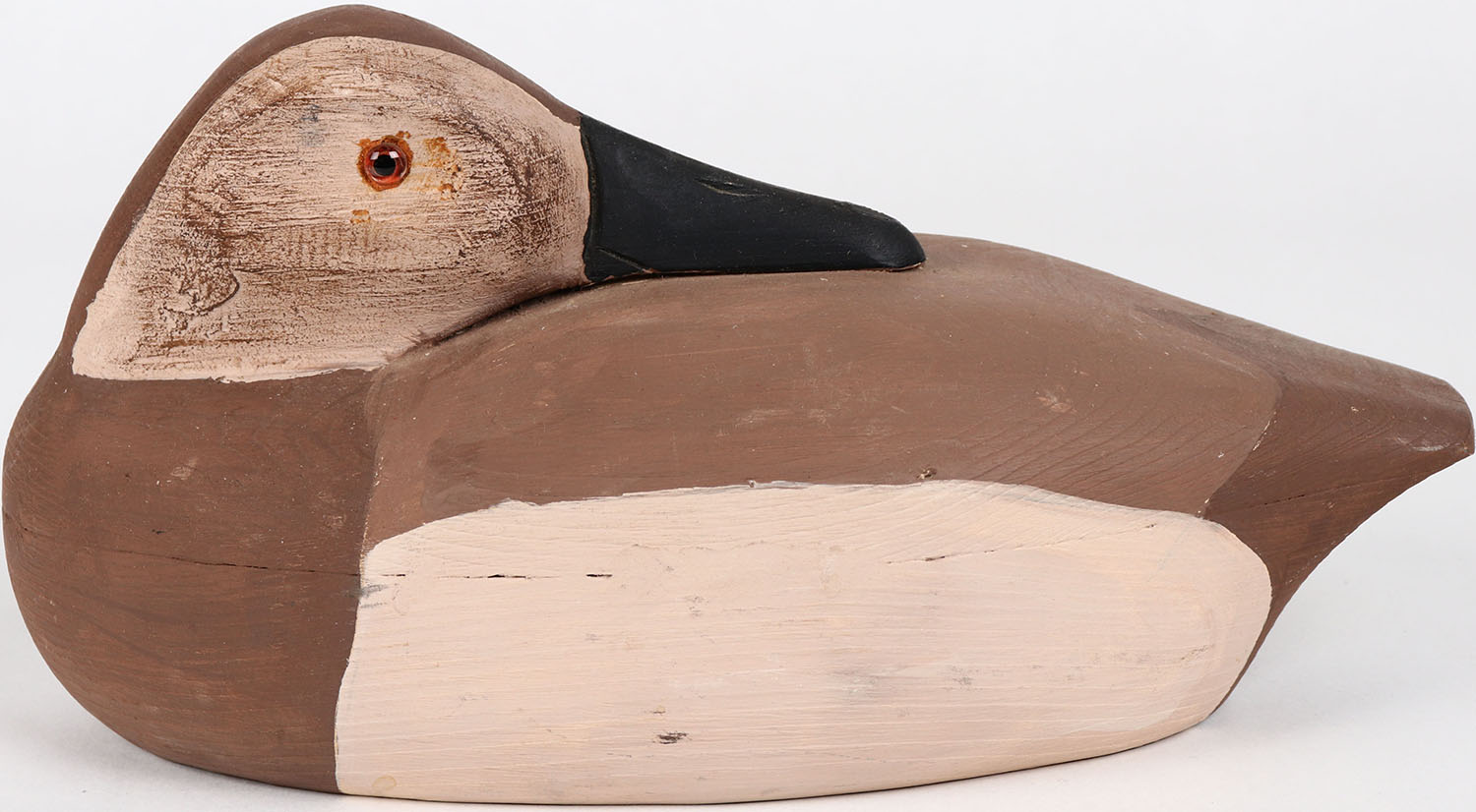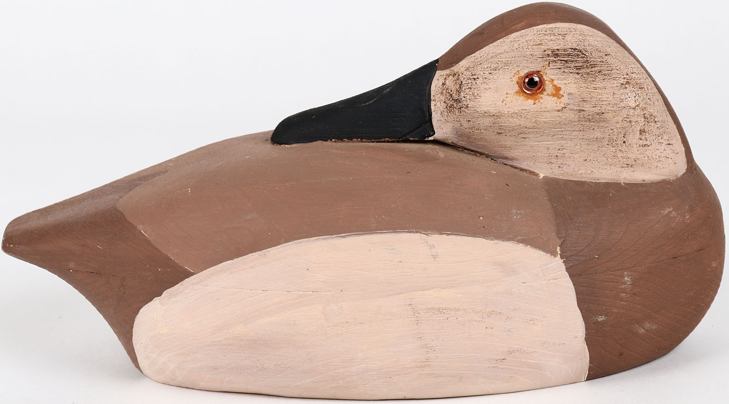 Sleeping Canvasback Hen by CW, glass eyes, hollow wood, structurally excellent, branded CW on bottom, original paint. Grade: MINT - Value: 30 to 60