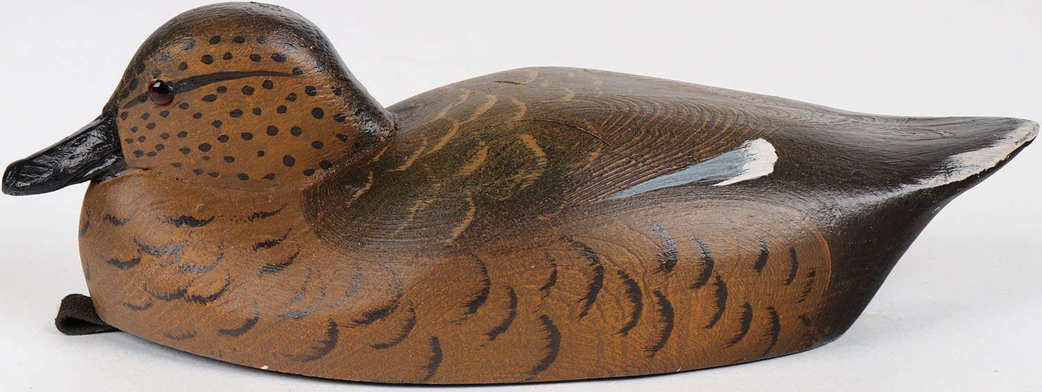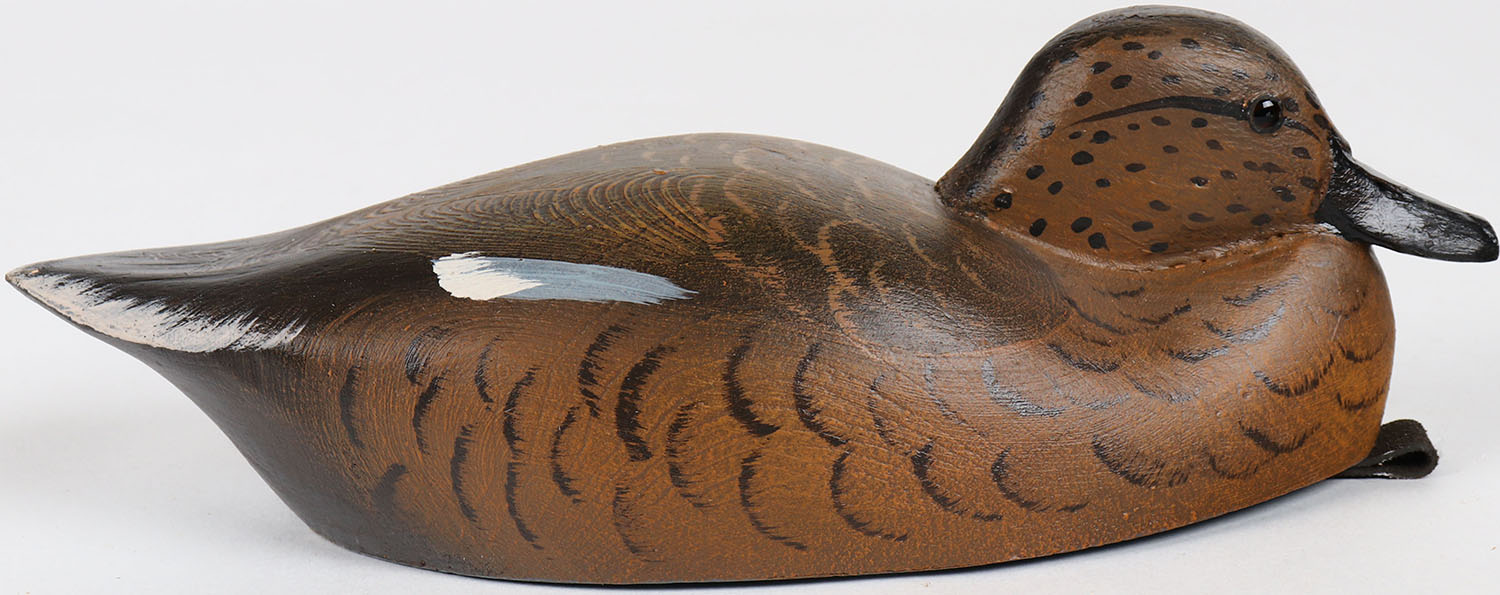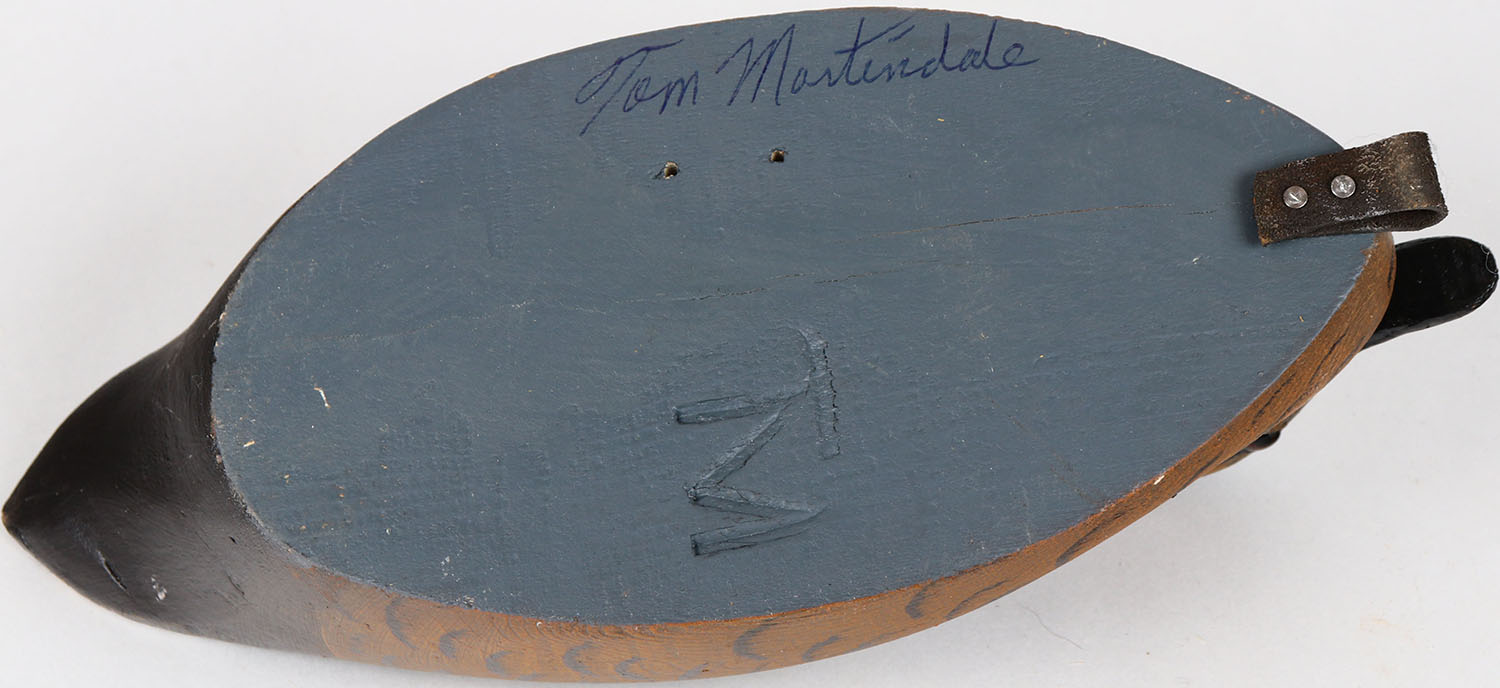 Gadwall Hen by Tom Martindale, glass eyes, solid wood, structurally excellent, signed and branded on bottom, original paint. Grade: MINT - Value: 50 to 100