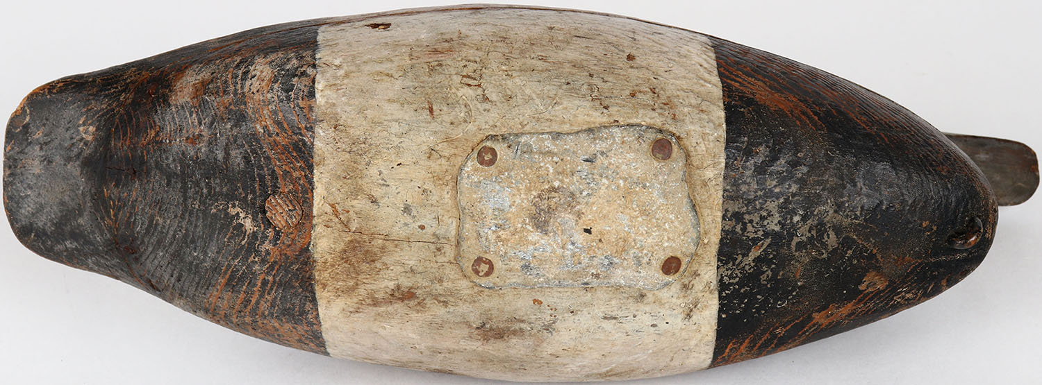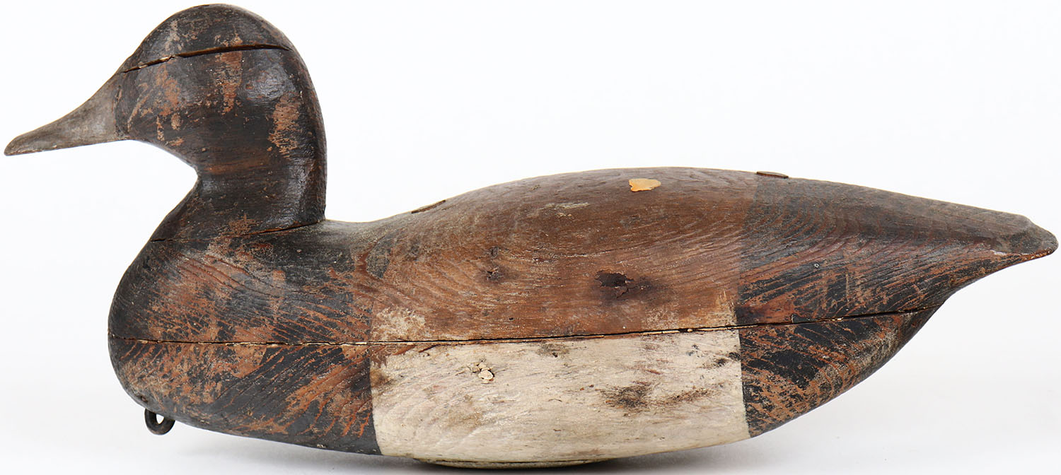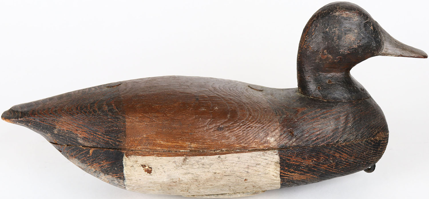 Bluebill Drake by unknown maker, NJ/DE, no eyes, hollow wood, has age crack on head, original paint. Grade: Very Good + - Value: 100 to 250
