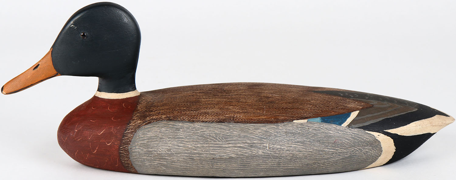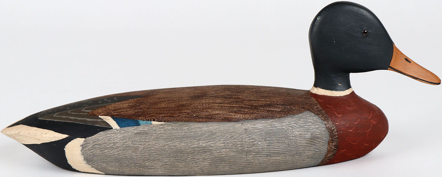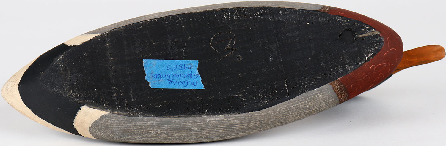 Mallard Drake by Maynard Caine, Ontario, glass eyes, solid wood, structurally excellent, branded M on bottom, original paint with comb painting. Grade: MINT - Value: 40 to 80