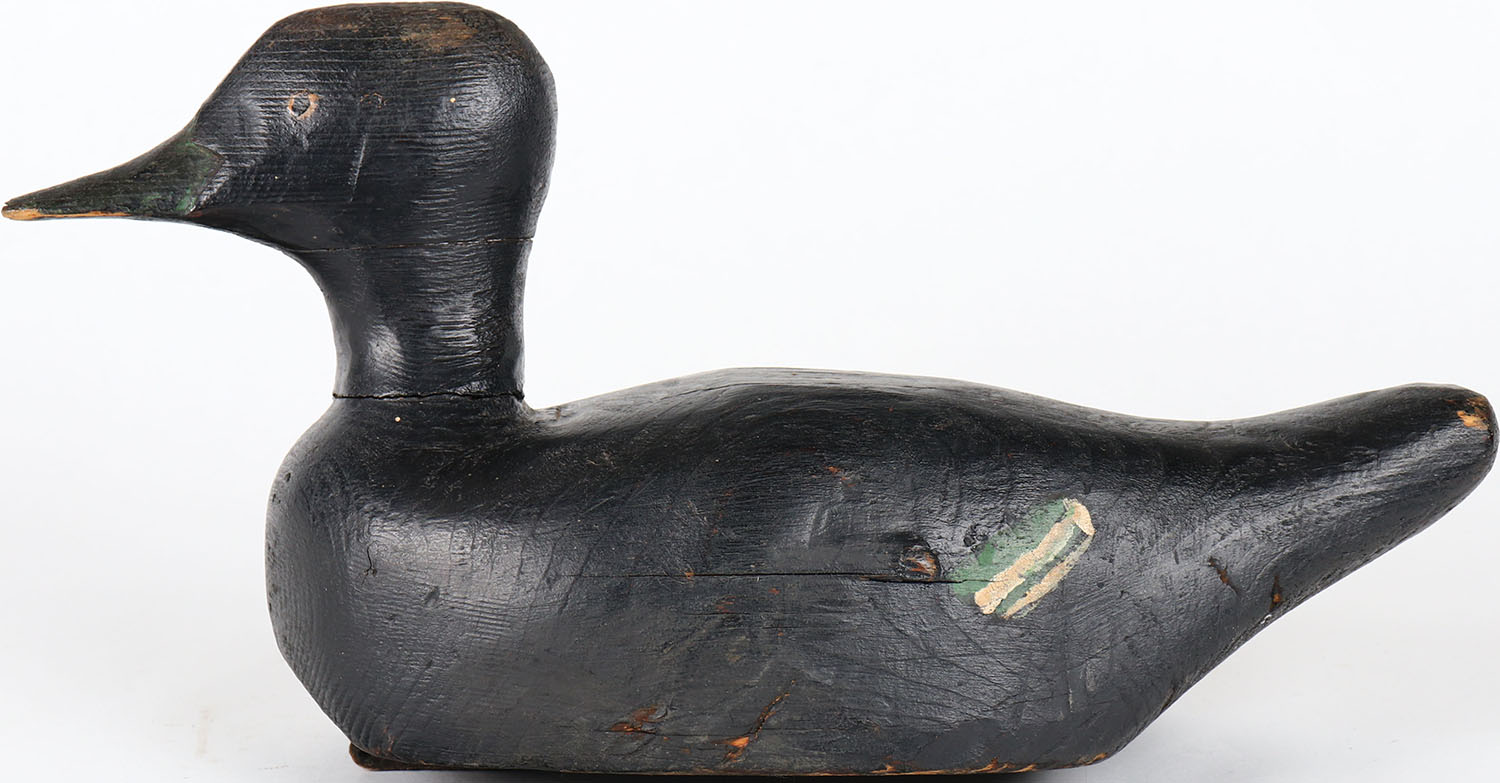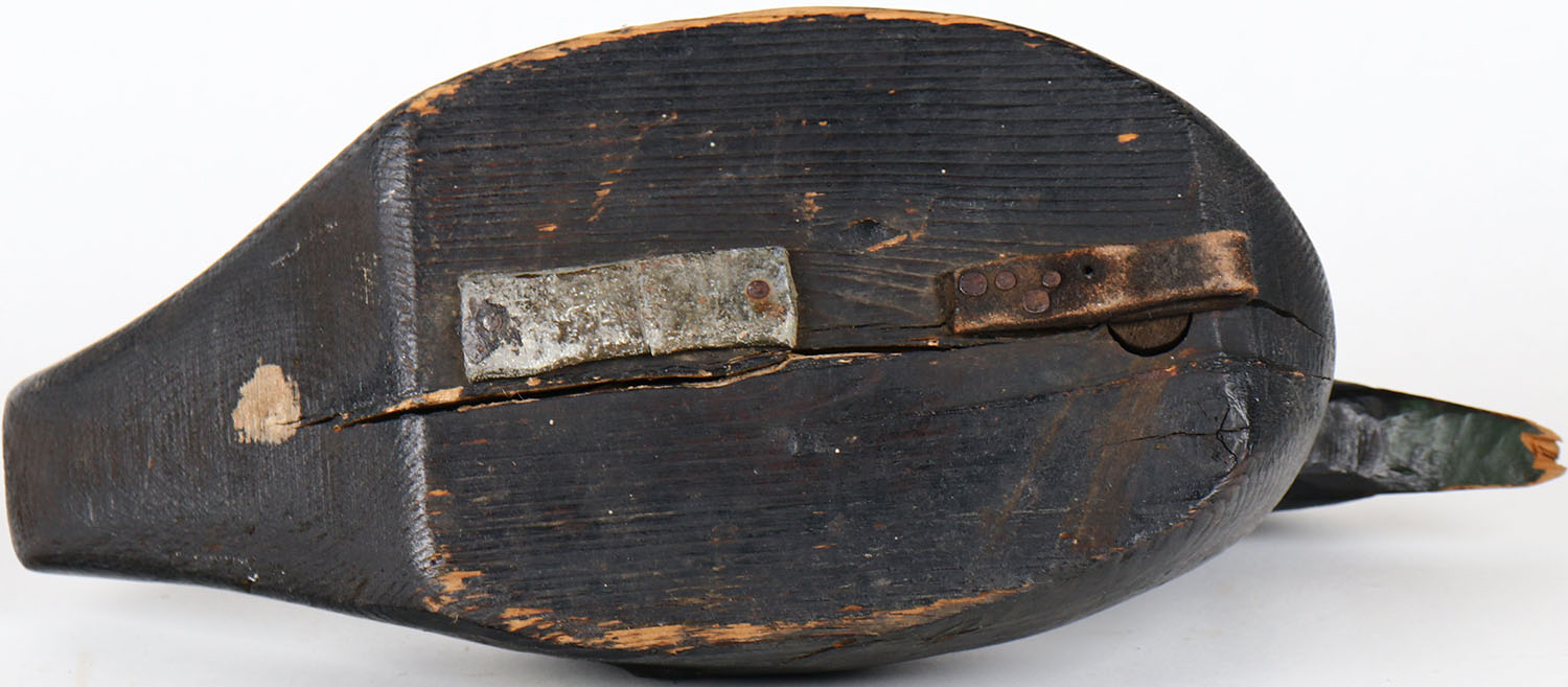 Whitewing Scoter by unknown maker, glass eyes, solid wood, has age crack on bottom, bill is chipped, original paint. Grade: Very Good ++ - Value: 40 to 80