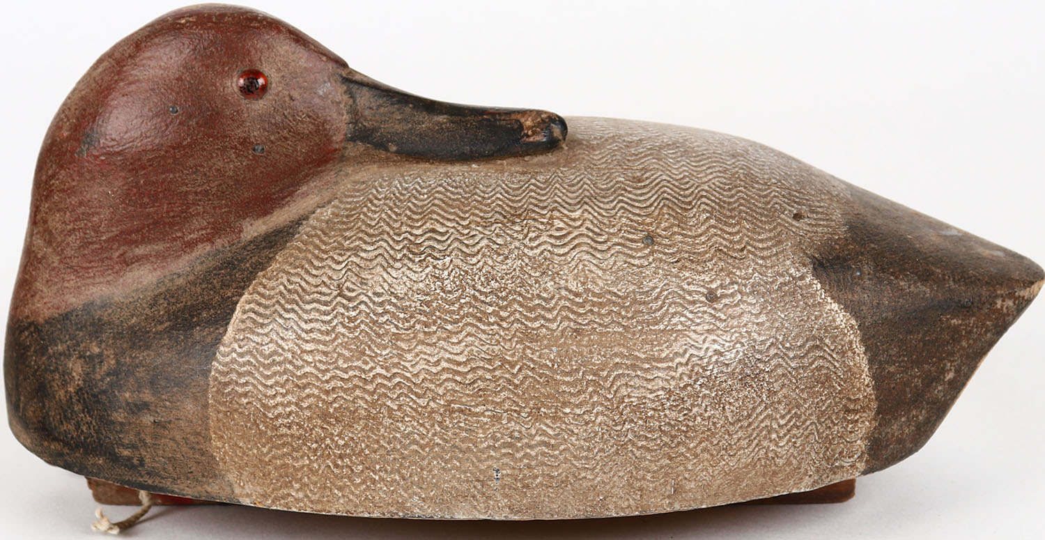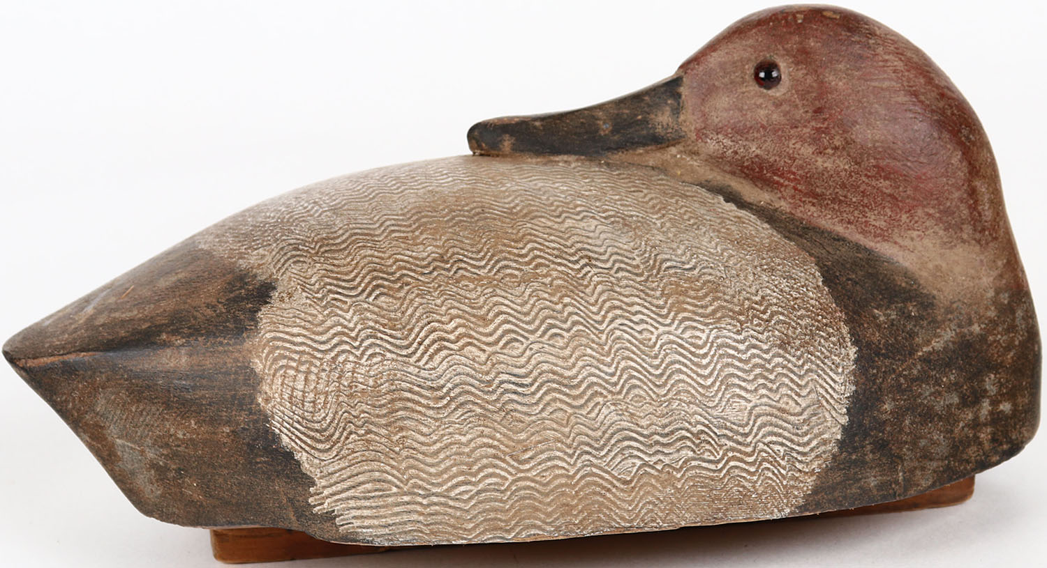 Preening Canvasback Hen by unknown maker, glass eyes, solid wood, structurally excellent, original paint with comb painting. Grade: MINT - Value: 100 to 200