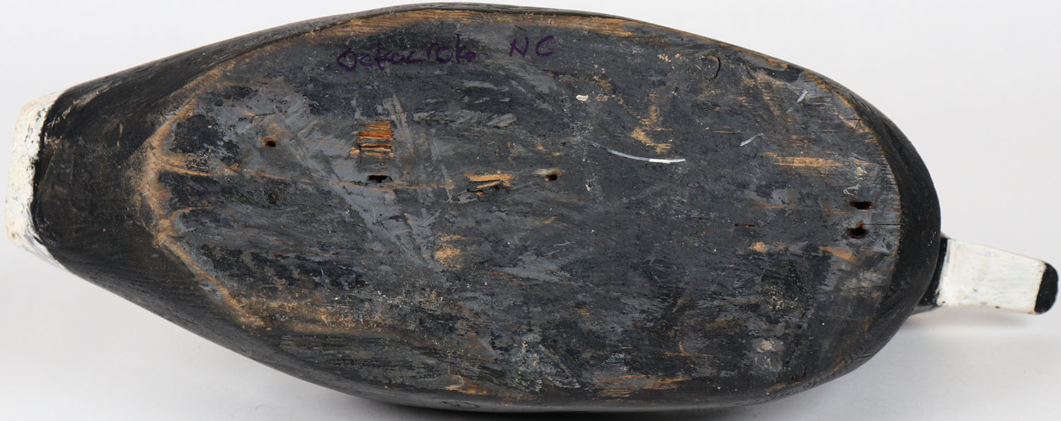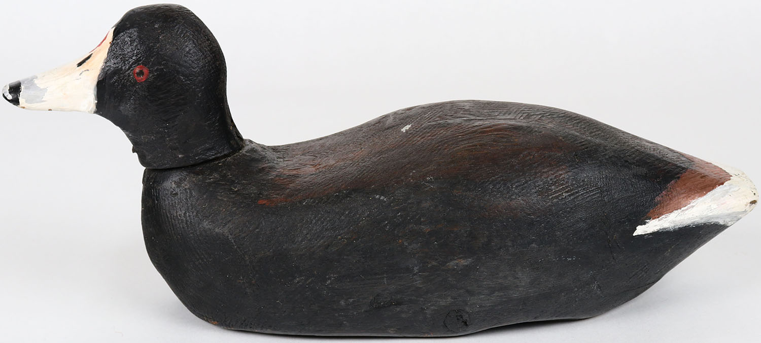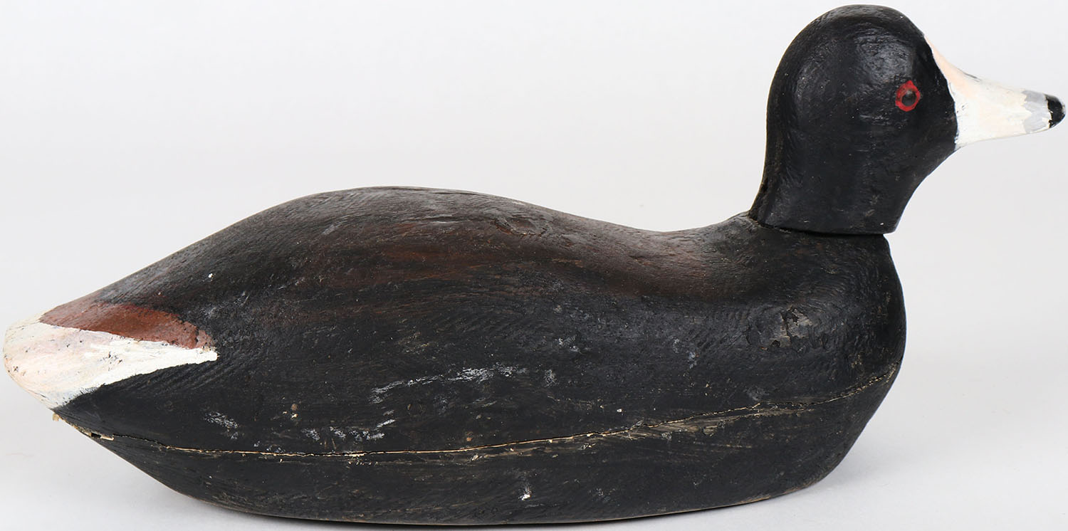 Coot by unknown maker, Ocracoke, NC, glass eyes, solid wood, structurally excellent, original paint. Grade: Excellent ++ - Value: 50 to 100