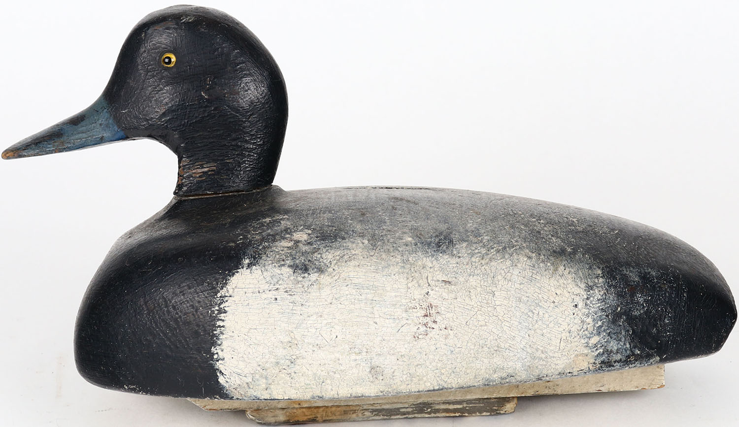 Bluebill Drake by unknown maker, glass eyes, solid wood, head is loose, original paint. Grade: Very Good ++ - Value: 30 to 60