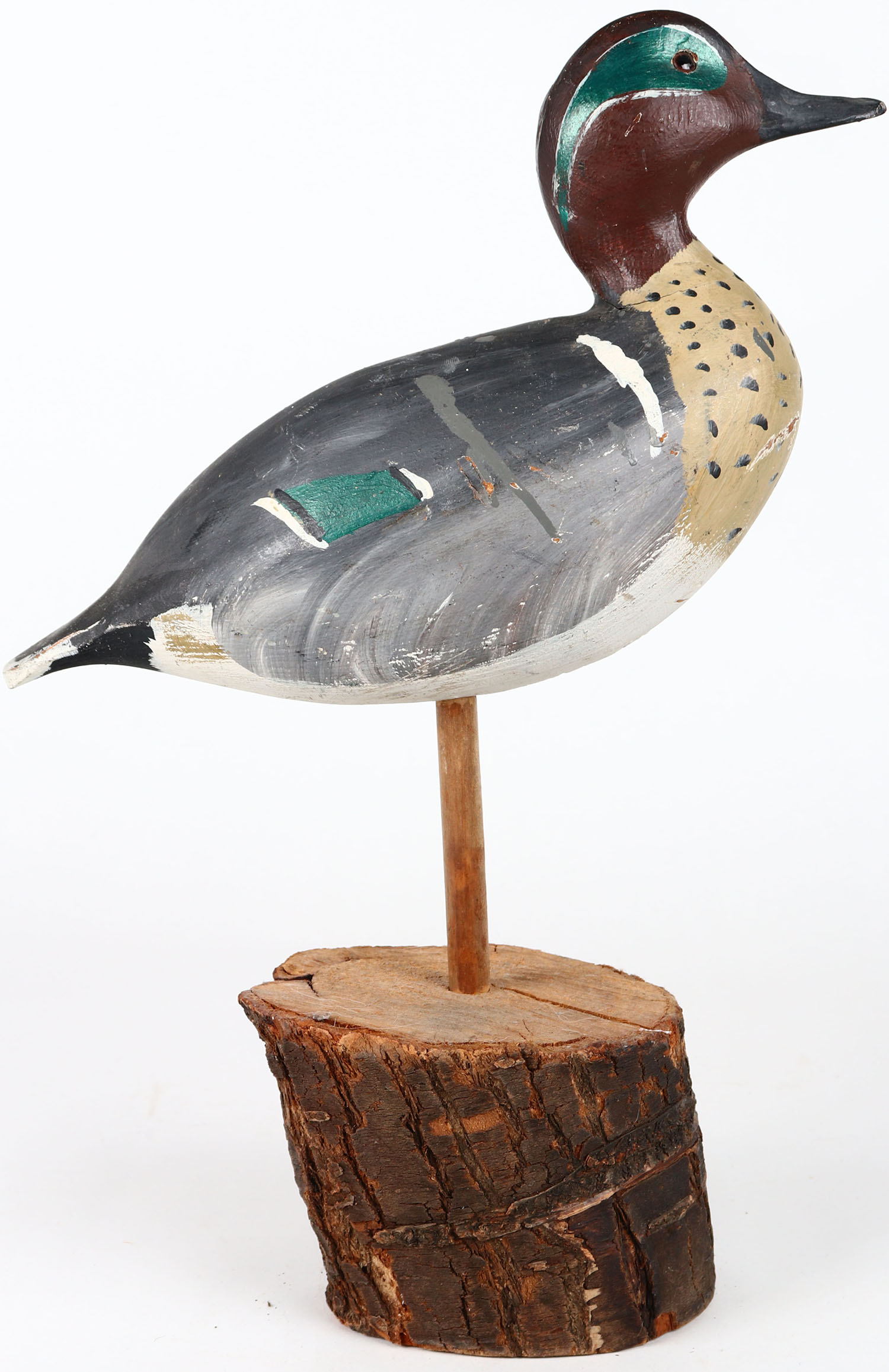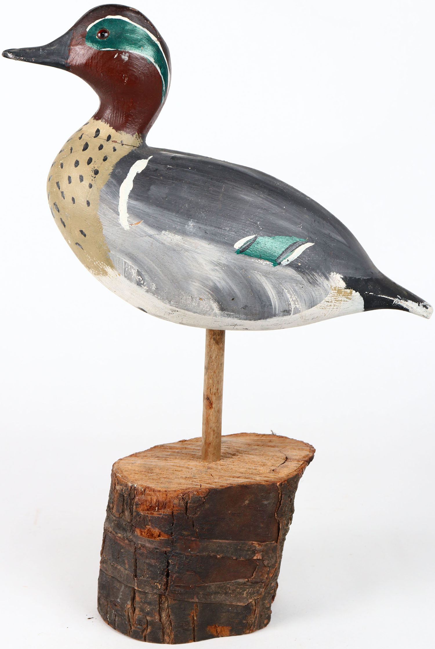 Green Wing Teal Drake by Bill Geonne, King City, CA, on wood stand, glass eyes, solid wood, structurally excellent, original paint. Grade: MINT - Value: 70 to 200