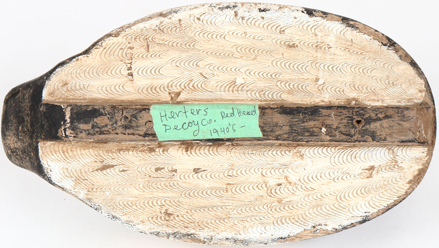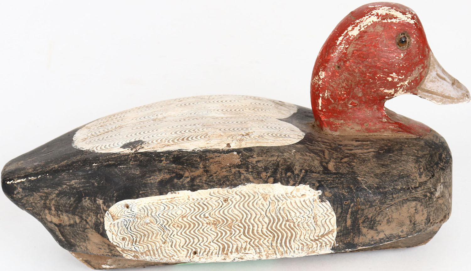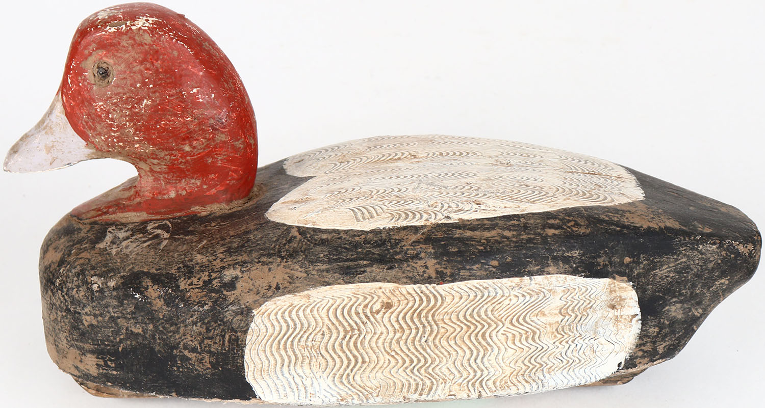 Redhead Drake by Herter's Decoy Co., glass eyes, solid wood, structurally excellent, signed on bottom with comb painting. Grade: Very Good + - Value: 40 to 80