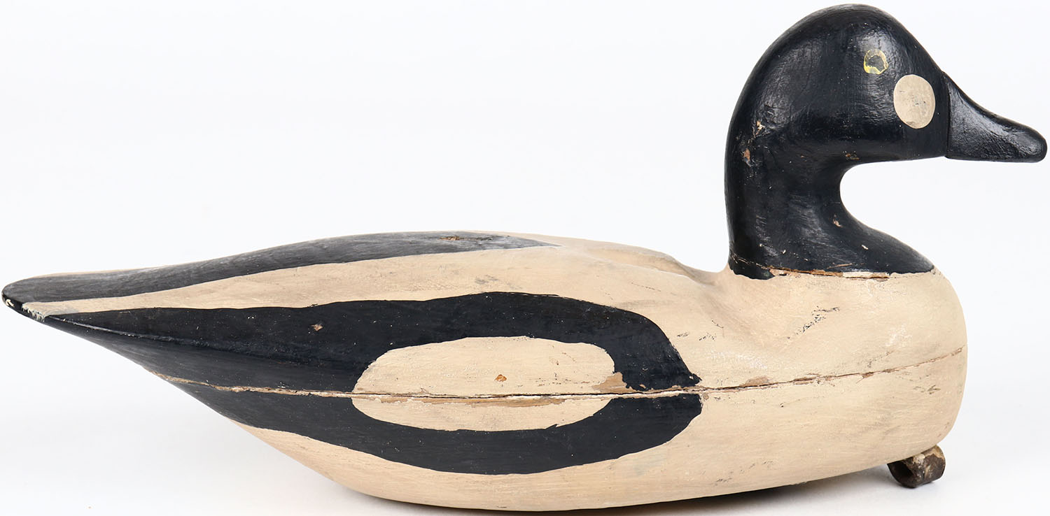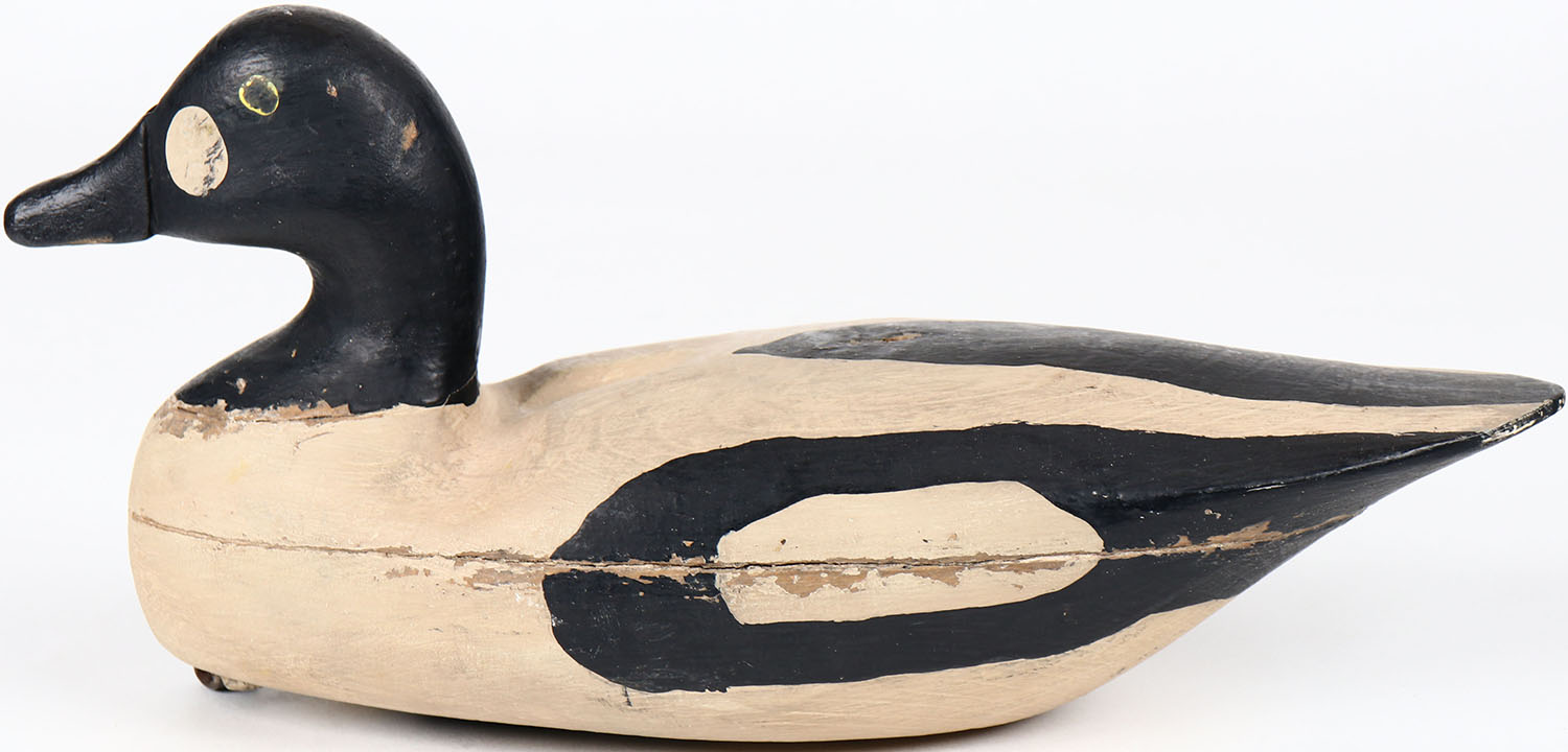 Goldeneye Drake by unknown maker, NJ/DE?, tack eyes, hollow wood, has age cracks on back and bottom, original paint. Grade: Excellent - Value: 100 to 200
