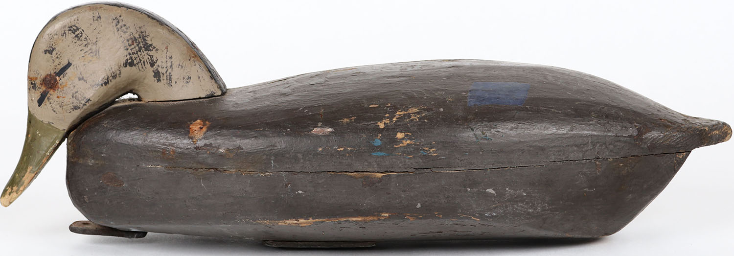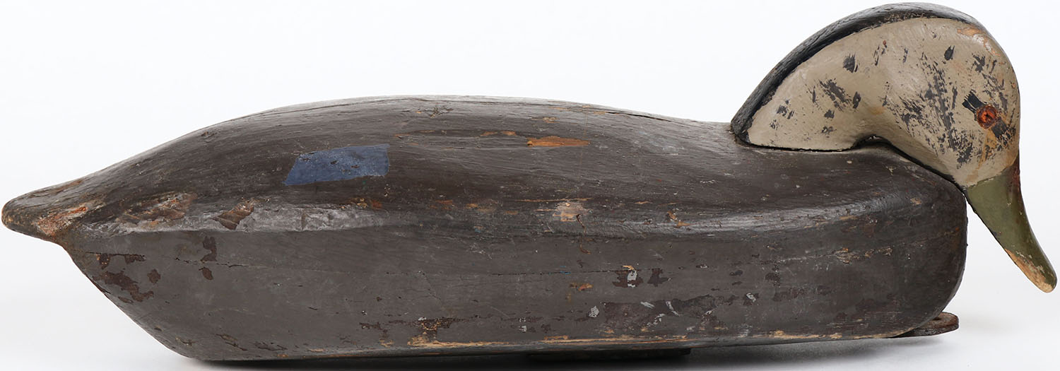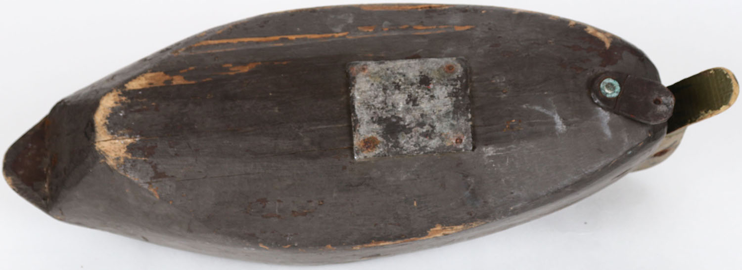 Black Duck by unknown maker, NJ?, tack eyes, hollow wood, has age cracks on back and bottom, original paint. Grade: Excellent - Value: 50 to 100