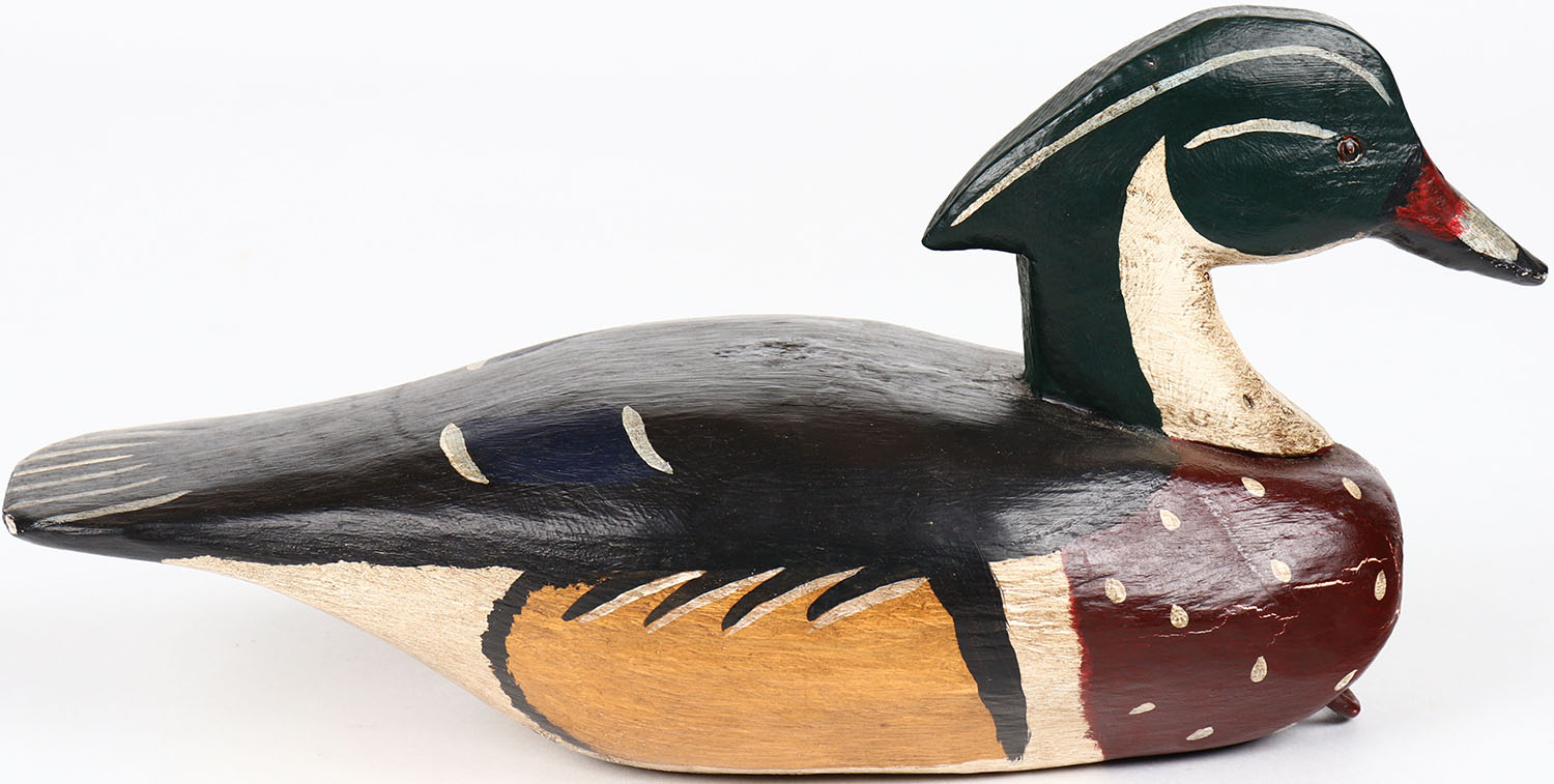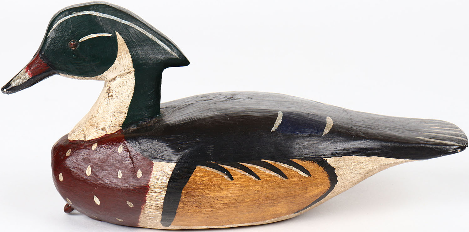Wood Duck Drake by RLW, glass eyes, solid wood, structurally excellent, branded RLW on bottom, original paint. Grade: Excellent + - Value: 40 to 80