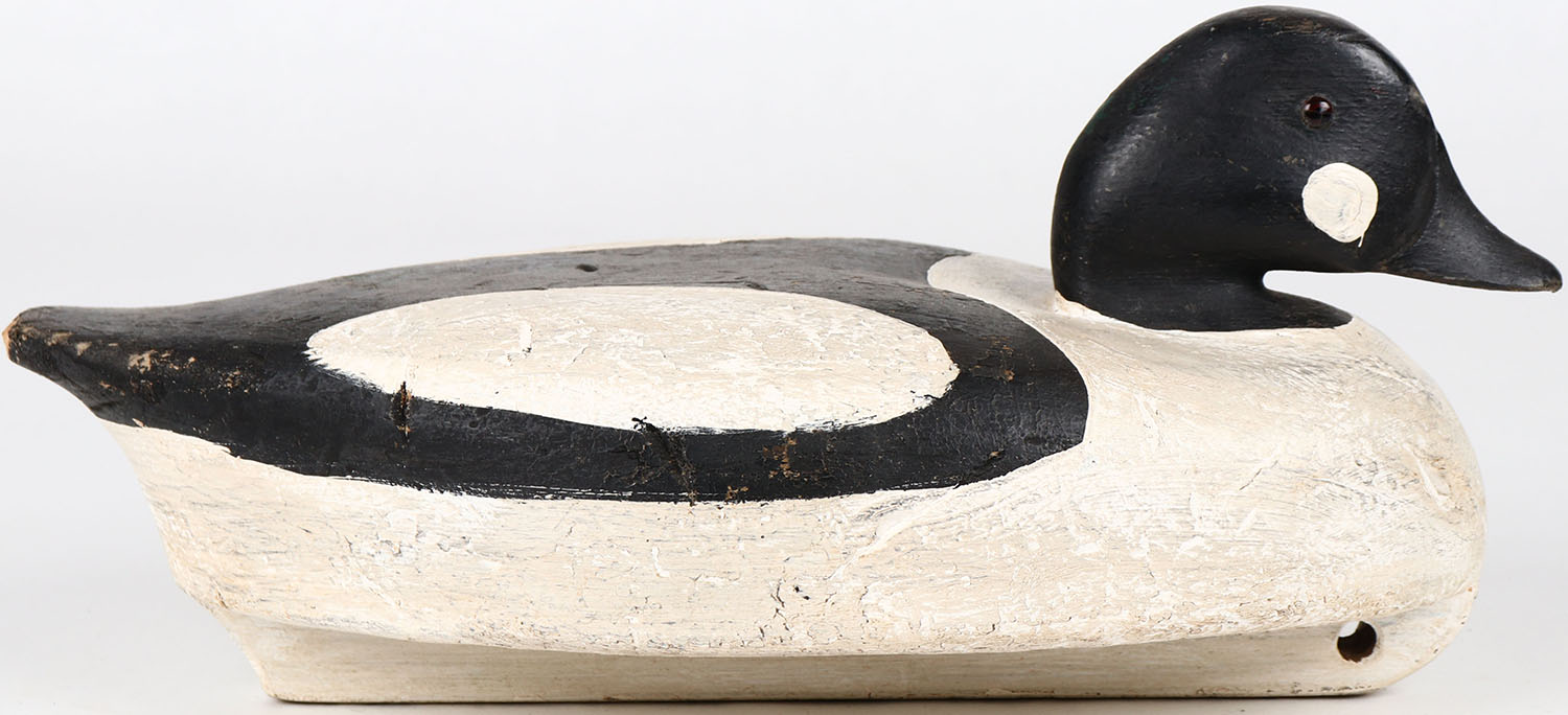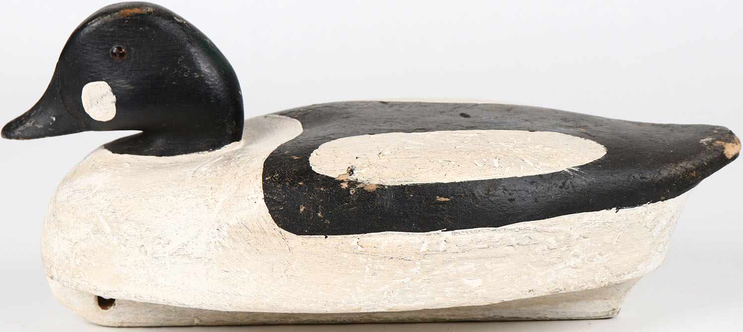 Goldeneye Drake by unknown maker, glass eyes, solid balsa wood, structurally excellent, original paint. Grade: Very Good ++ - Value: 40 to 80