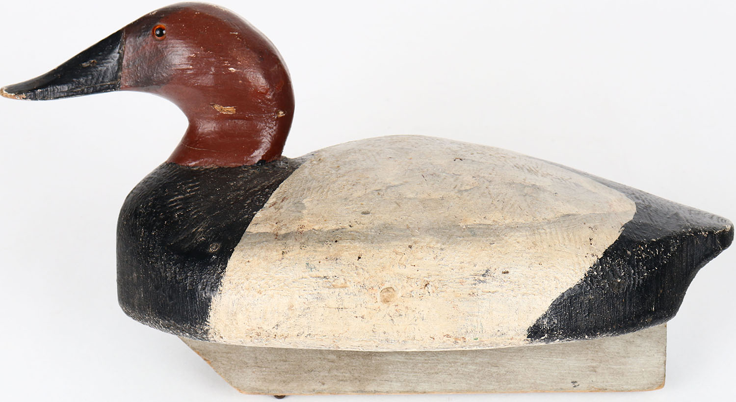Canvasback Drake by unknown maker, glass eyes, solid wood, structurally excellent, original paint. Grade: Excellent ++ - Value: 50 to 100