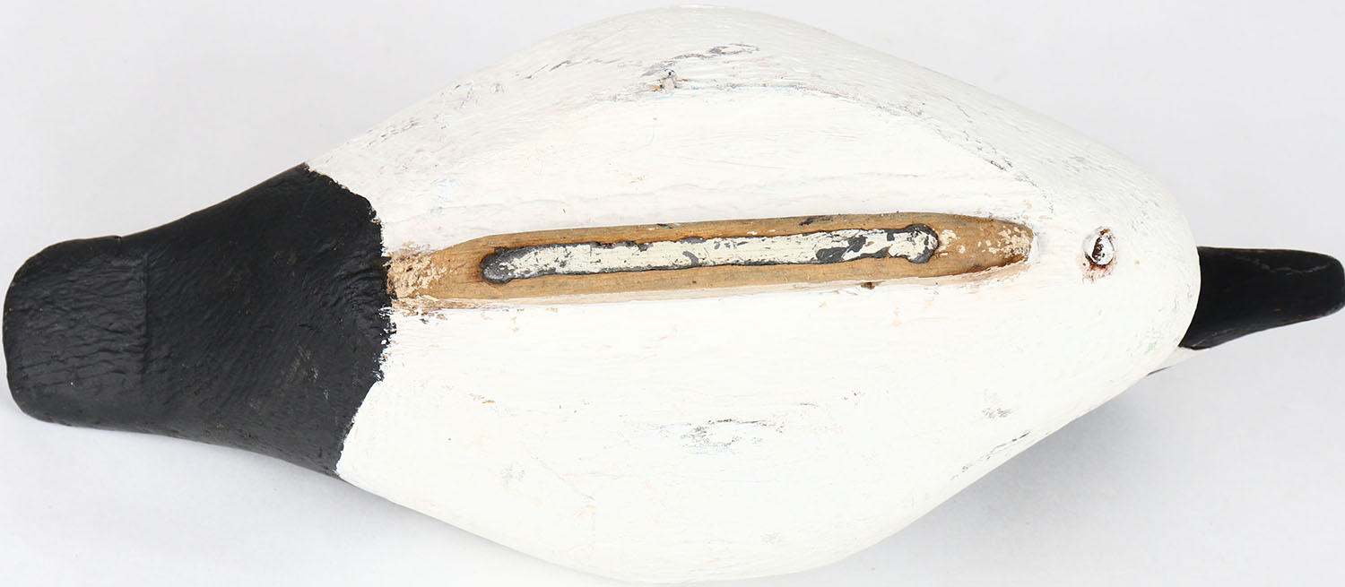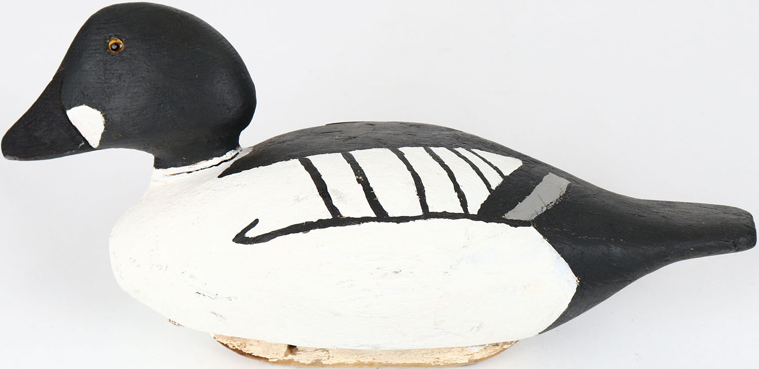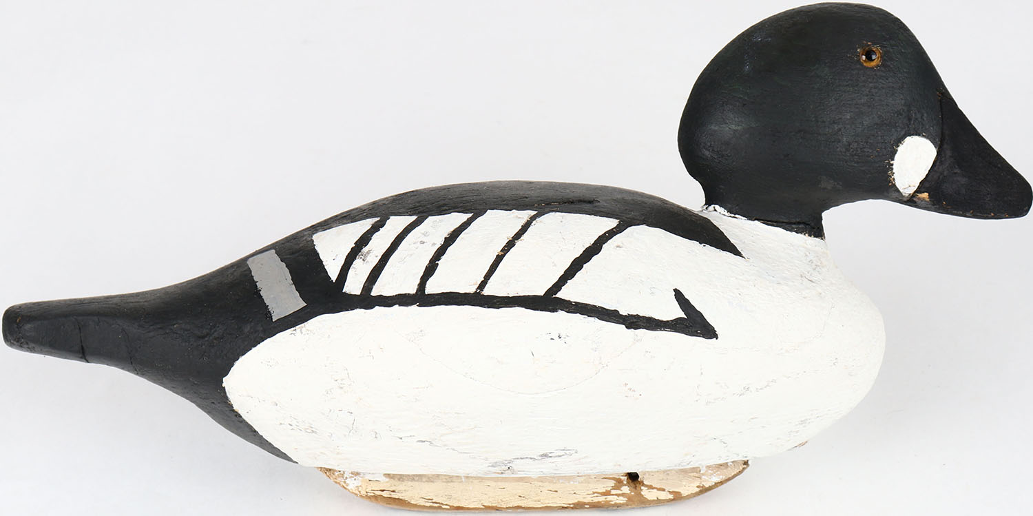 Goldeneye Drake by unknown maker, glass eyes, solid wood, has crack around neck, original paint. Grade: Very Good + - Value: 40 to 80