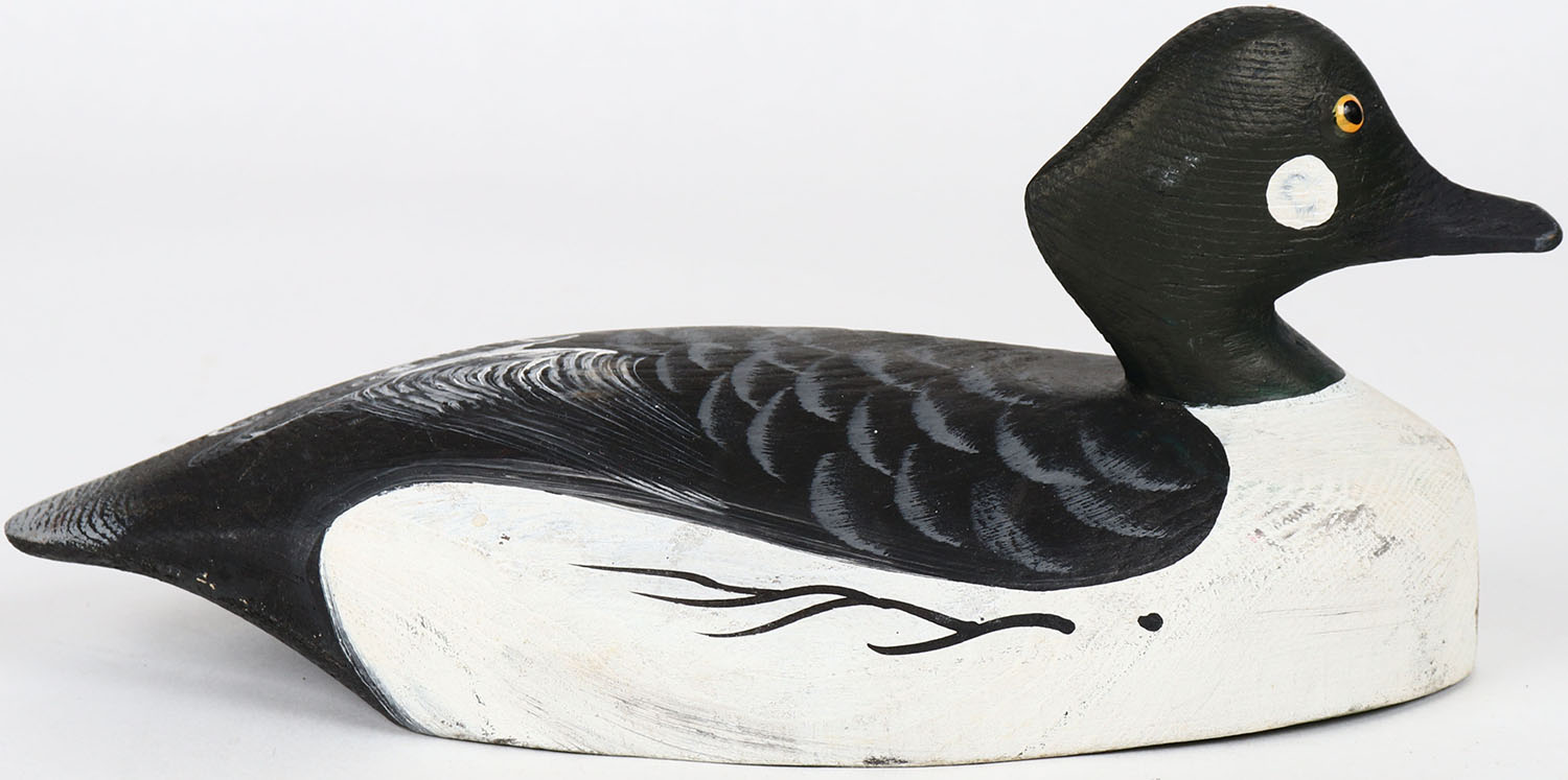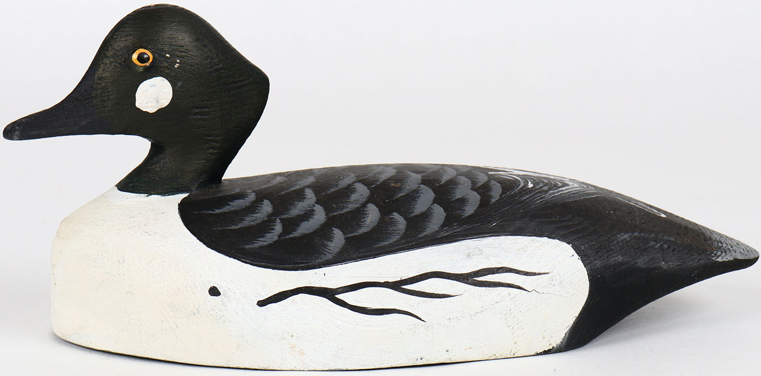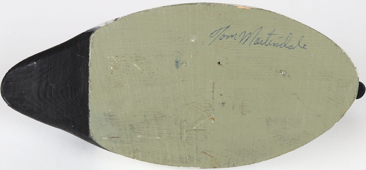 Goldeneye Drake by Tom Martindale, Ontario, CAN, painted eyes, solid wood, structurally excellent, signed and branded on bottom, original paint. Grade: Excellent ++ - Value: 70 to 150