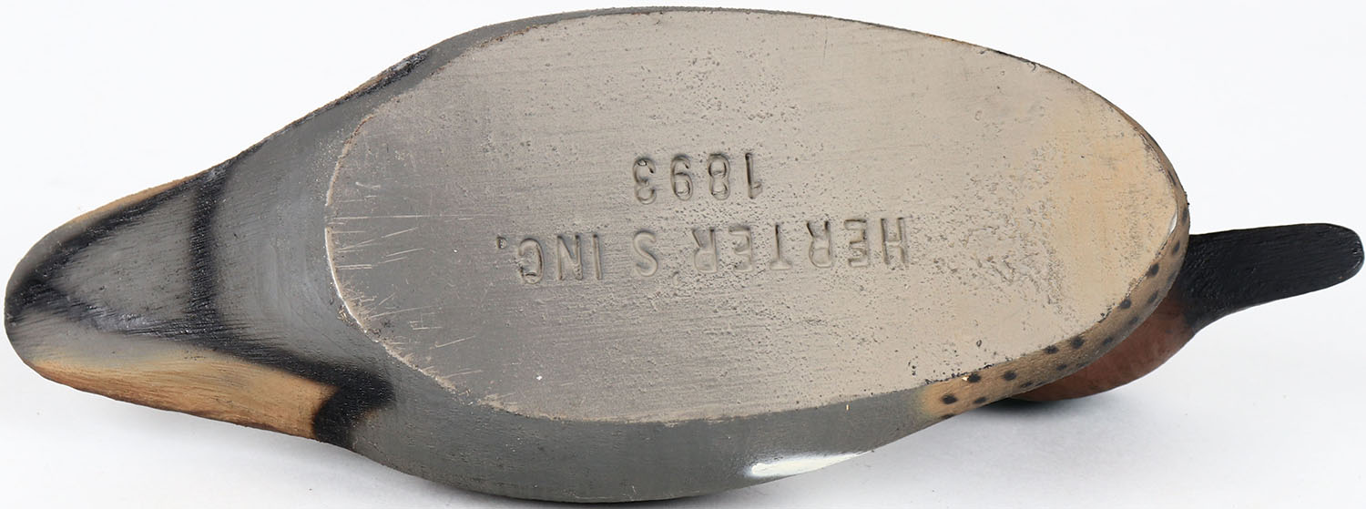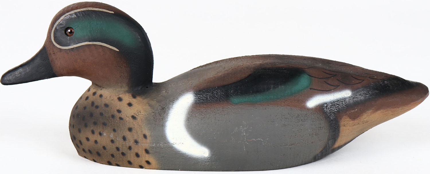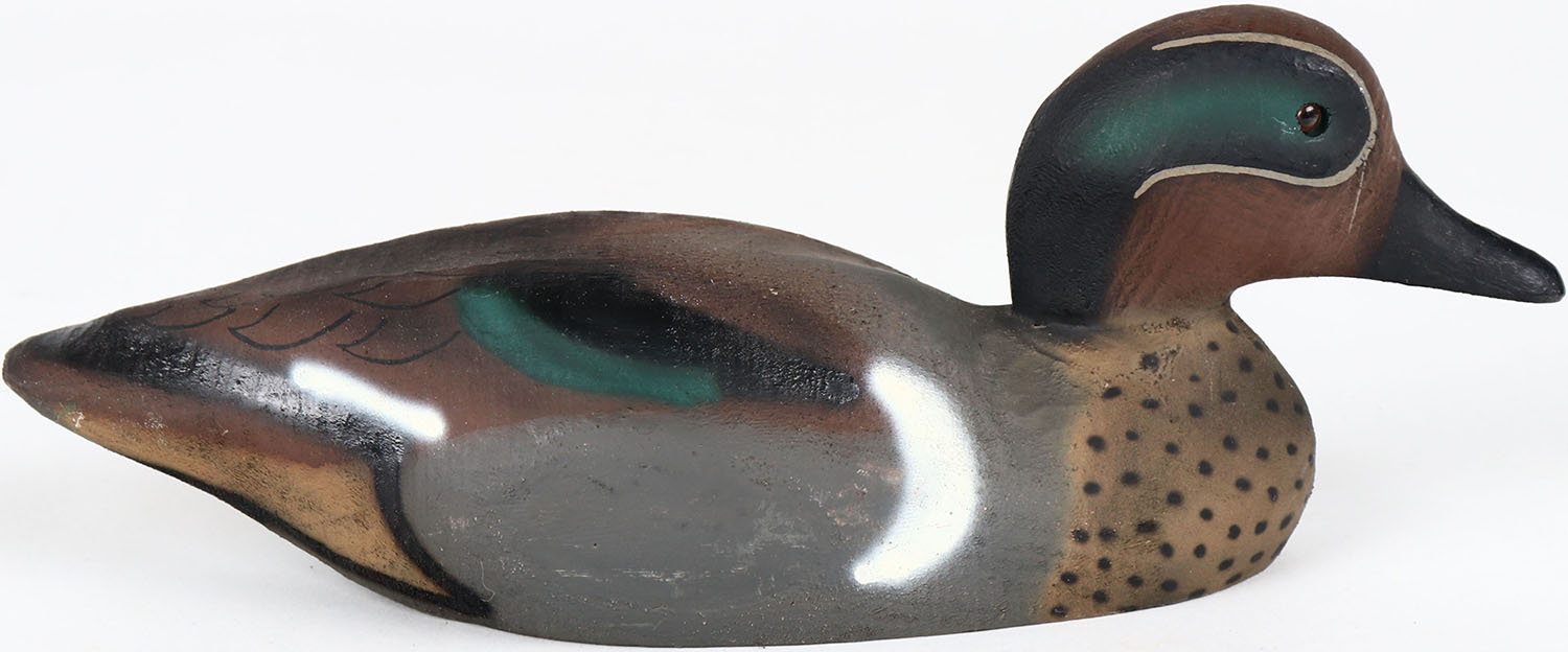 Green Wing Teal Drake by Herter's, Inc, glass eyes, solid wood, structurally excellent, original paint. Grade: MINT - Value: 80 to 160
