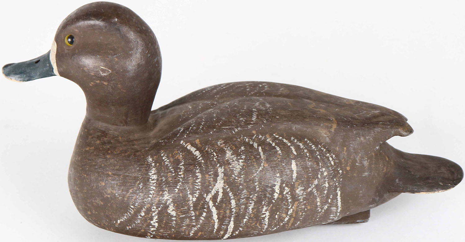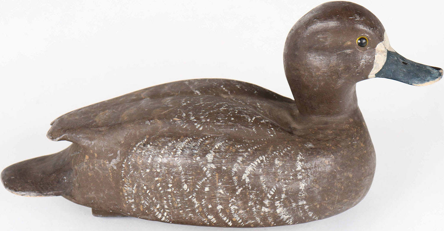 Bluebill Hen by unknown maker, glass eyes, hollow wood, structurally excellent, original paint. Grade: Excellent + - Value: 40 to 80