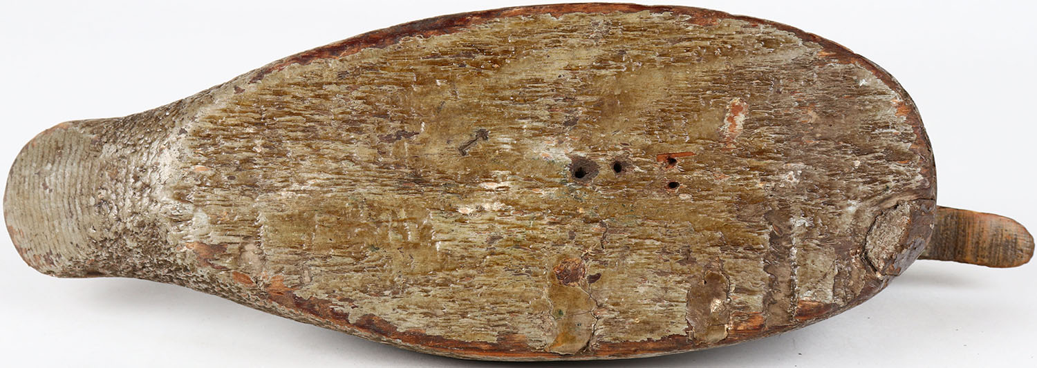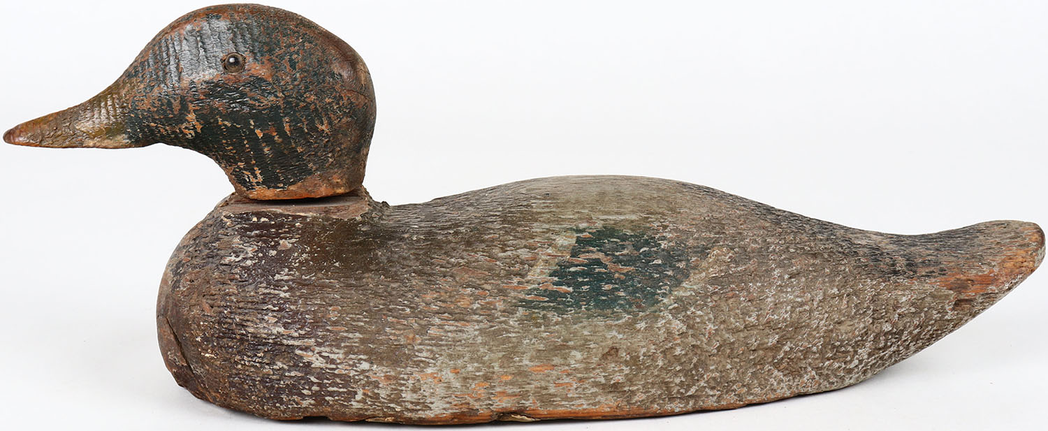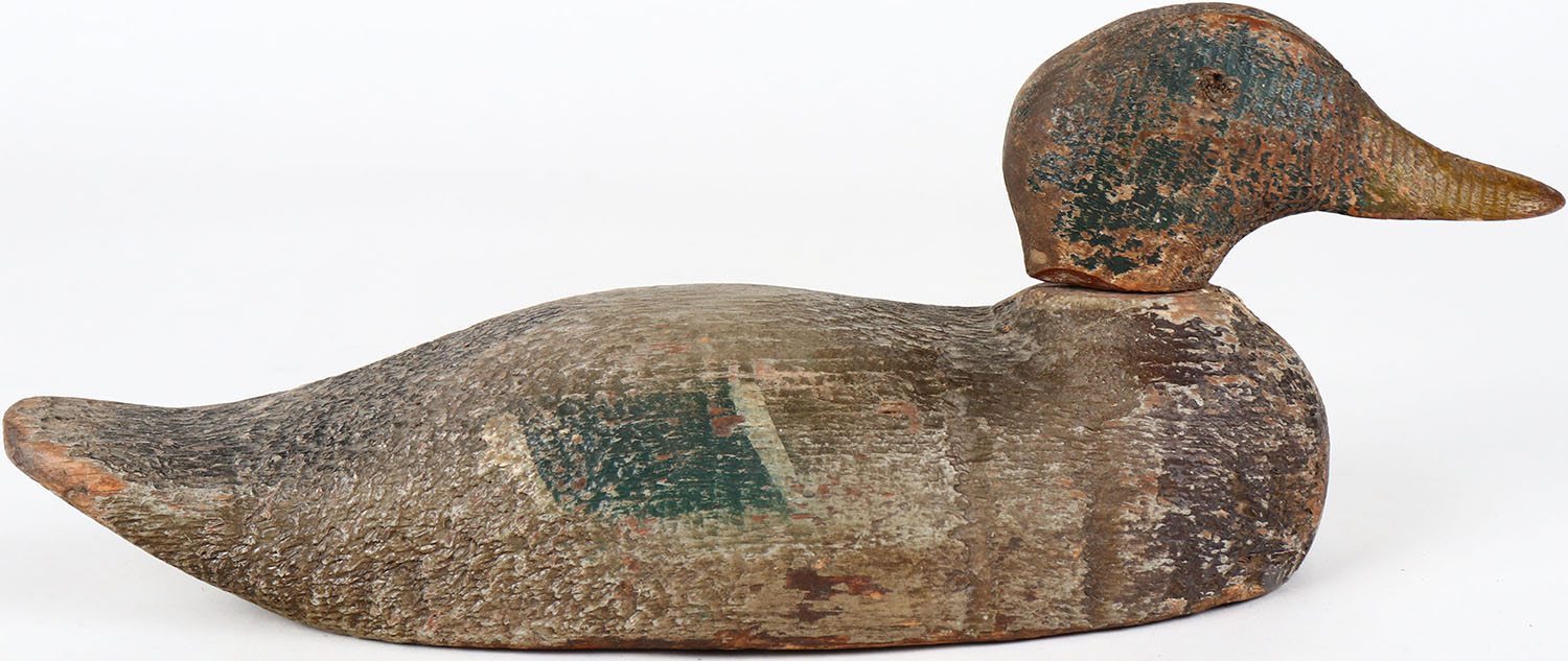 Mallard Drake by unknown maker, glass eyes, one eye is missing, solid wood, head is loose, original paint. Grade: Very Good + - Value: 30 to 60