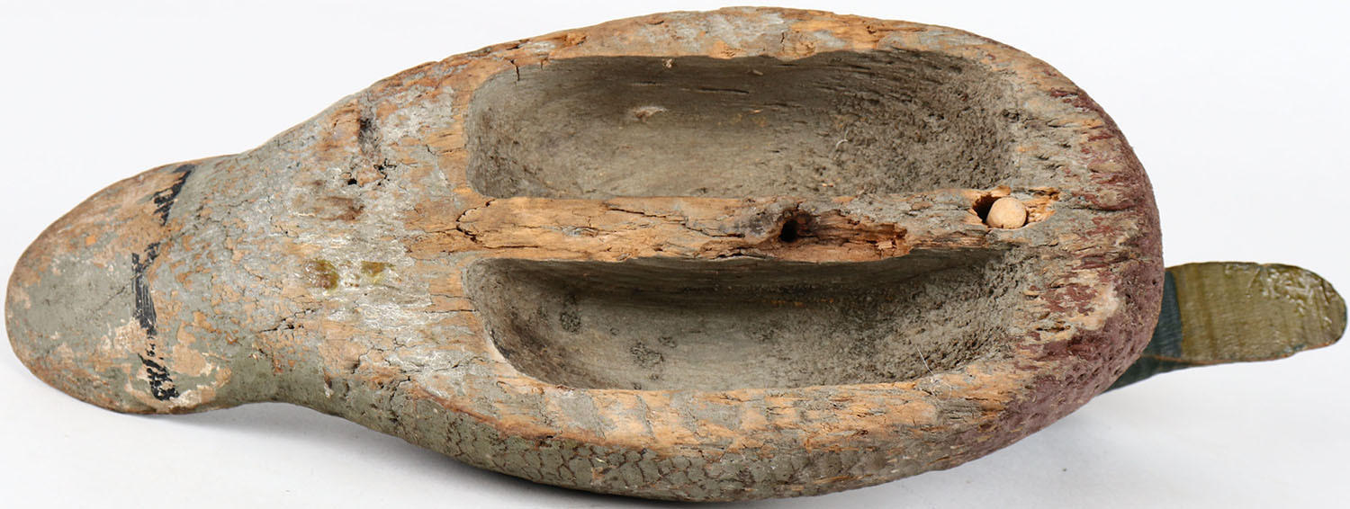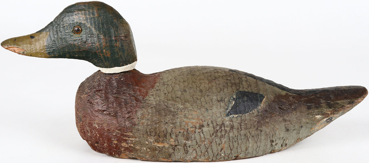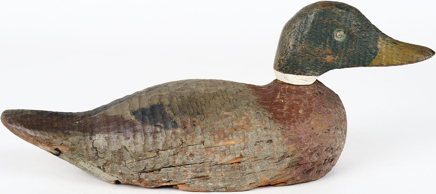 Mallard Drake by unknown maker, glass eyes, one eye is missing, head is loose, solid wood, original paint. Grade: Very Good + - Value: 30 to 60