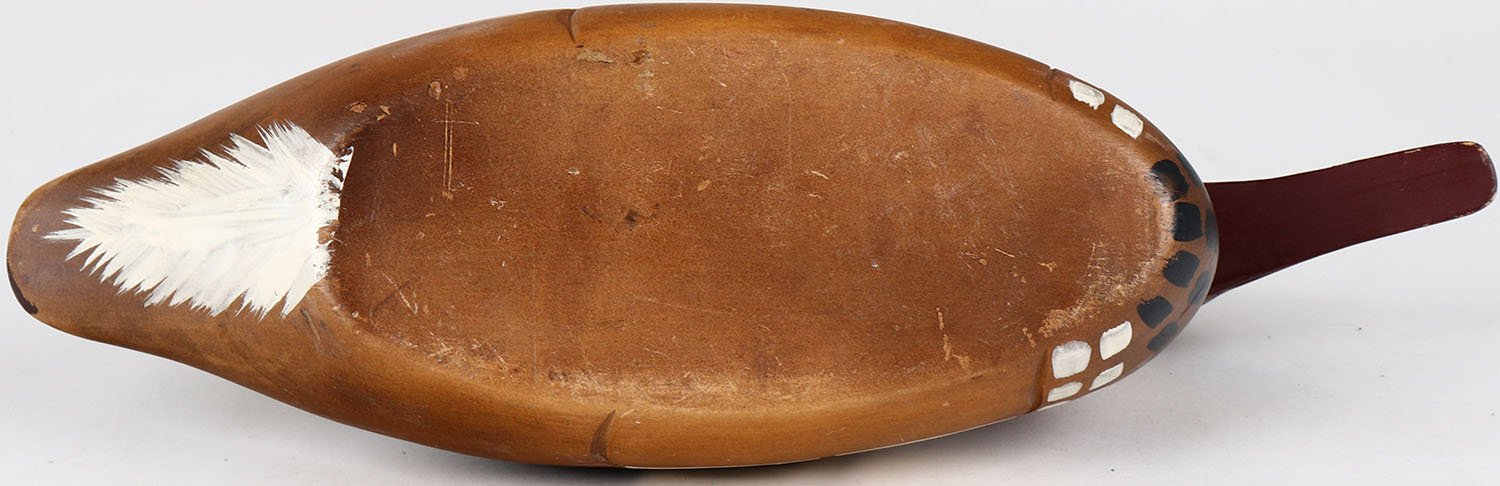 Hooded Merganser Hen by unknown maker, glass eyes, solid wood, structurally excellent, original paint. Grade: MINT - Value: 30 to 60