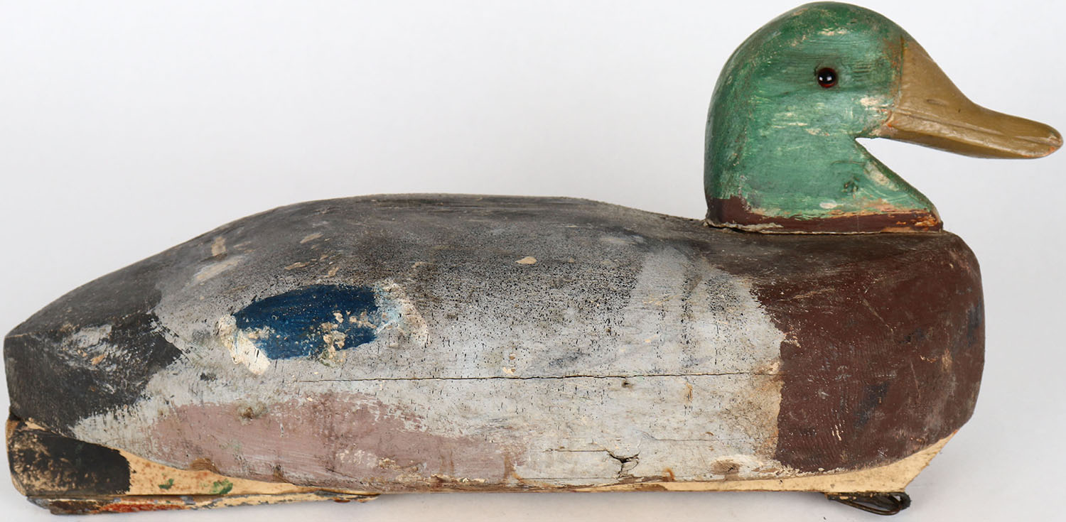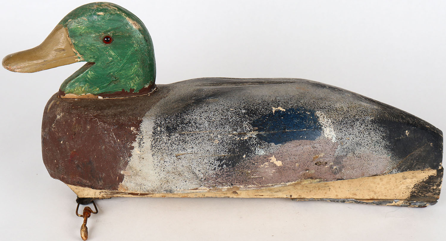 Mallard Drake by unknown maker, glass eyes, solid wood, has age cracks on bottom, head is loose, original paint. Grade: Very Good ++ - Value: 20 to 40