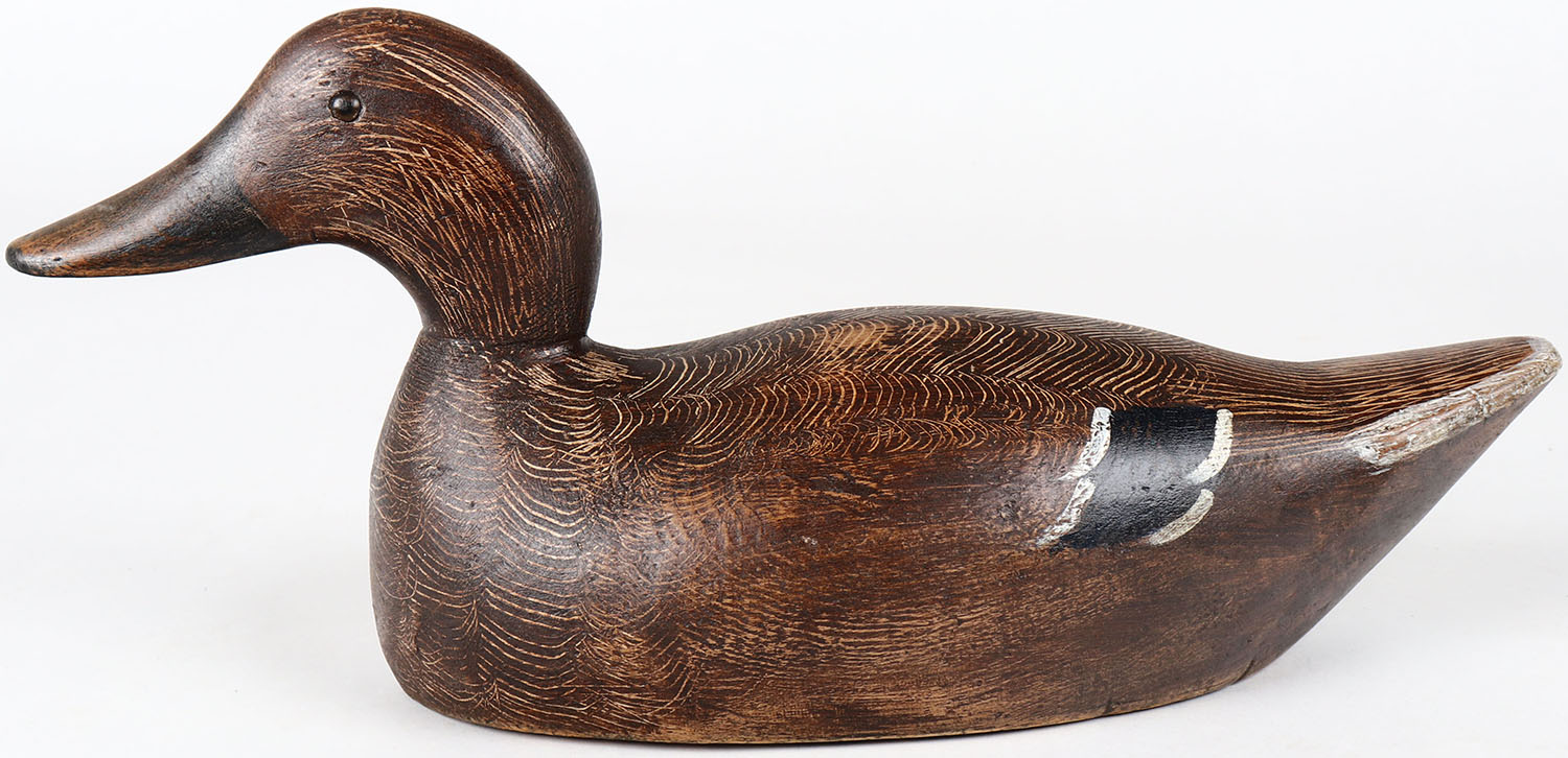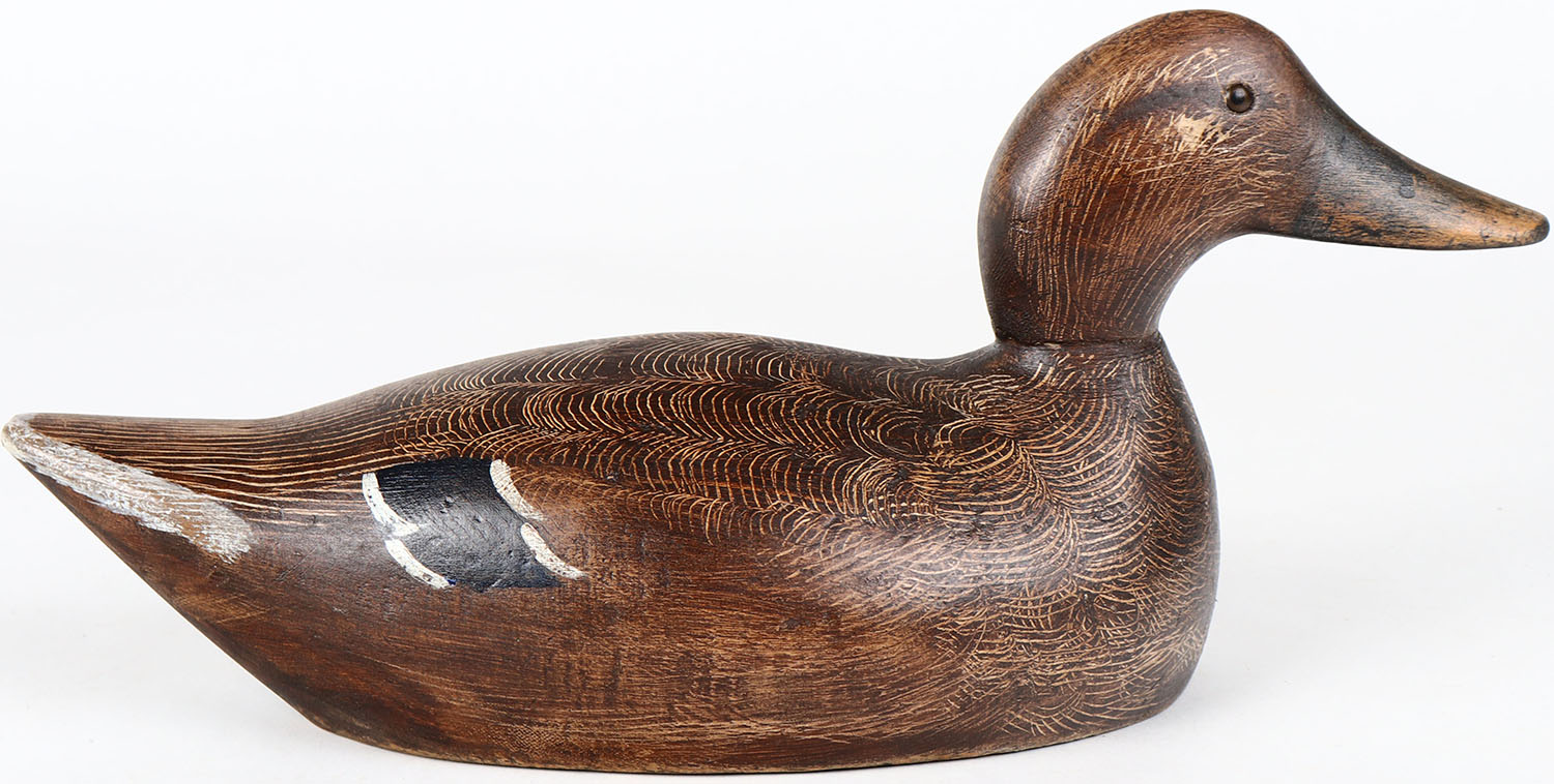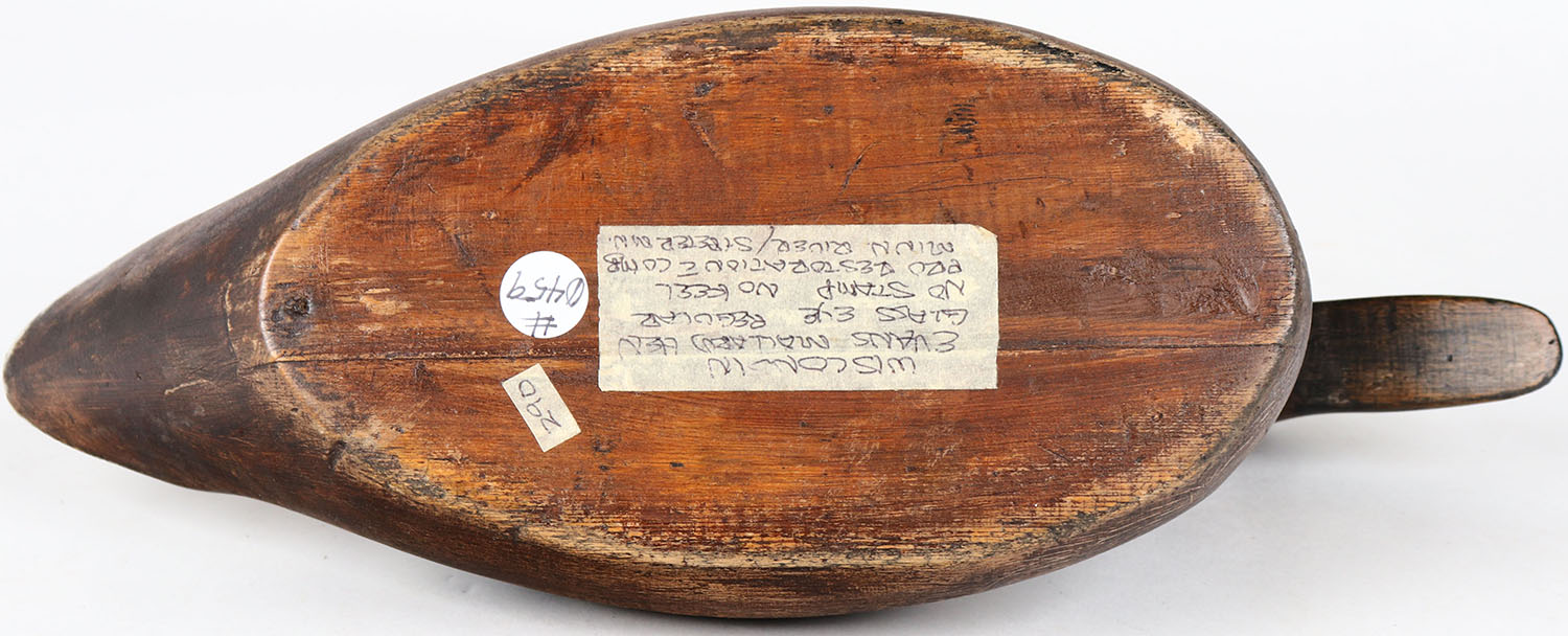 Mallard Hen by Evans Decoy Co., WI, glass eyes, solid wood, structurally excellent, signed on bottom, original paint with comb painting. Grade: Excellent - Value: 120 to 500