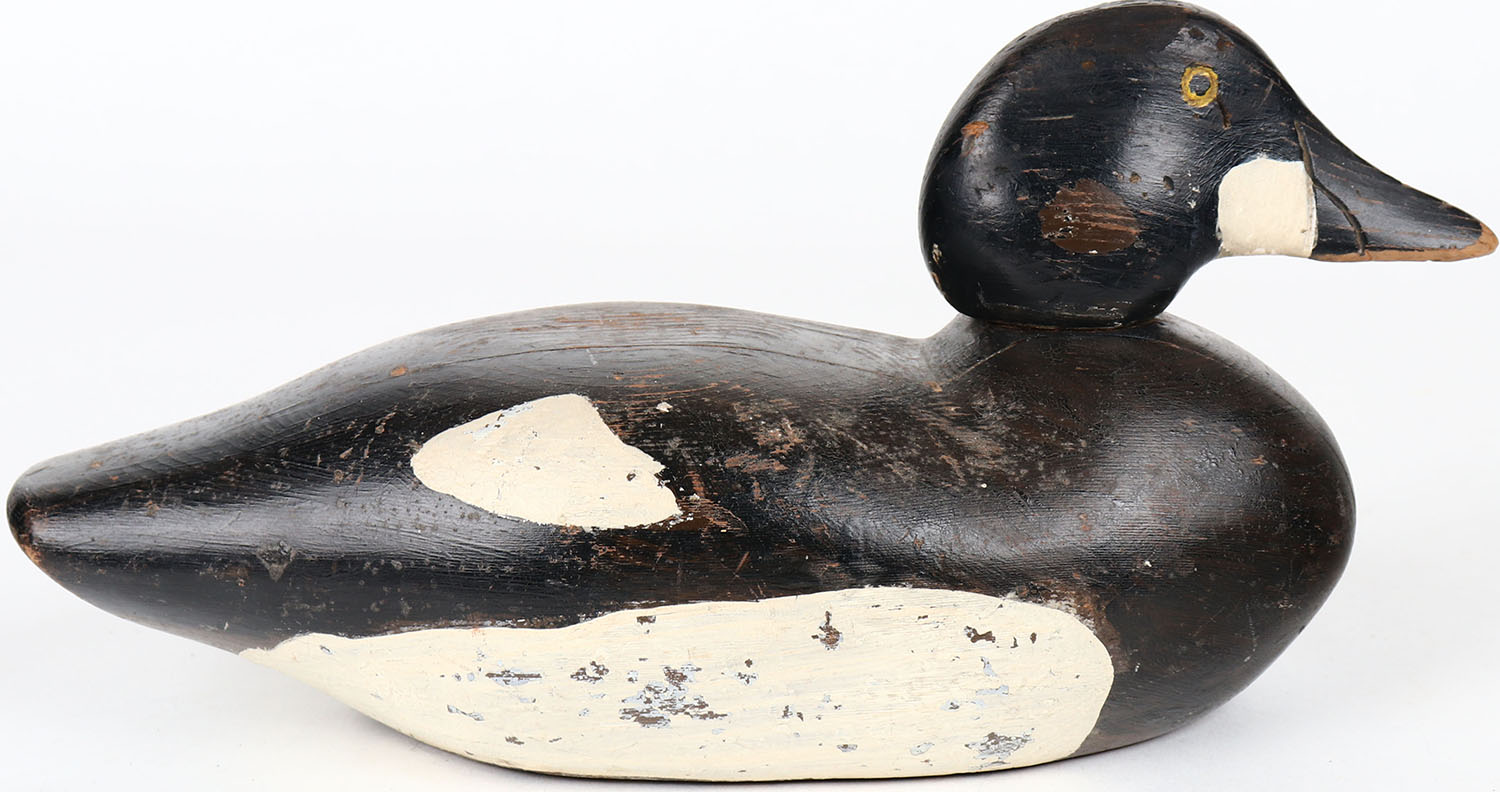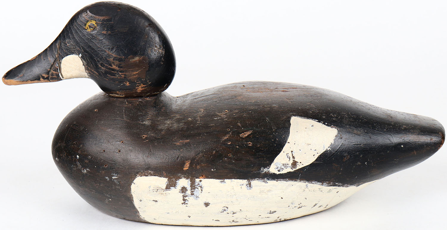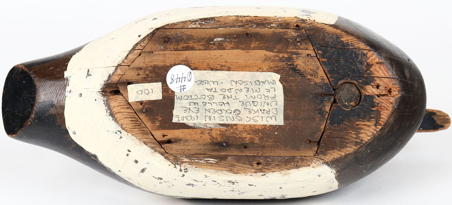 Goldeneye Drake by unknown maker, Lk Minnesota, Madison WI, tack eyes, hollow wood, has age crack on back, signed on bottom, original paint. Grade: Very Good ++ - Value: 50 to 100