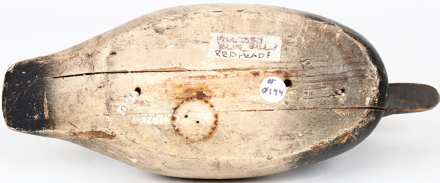 Bluebill or Redhead Drake by unknown maker, glass eyes, solid wood, head is loose, original paint. Grade: Very Good ++ - Value: 30 to 60