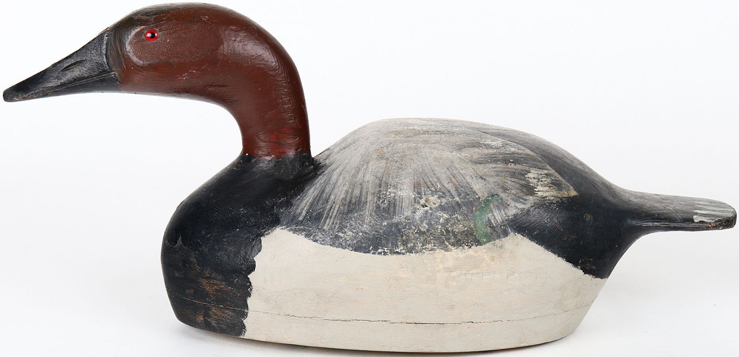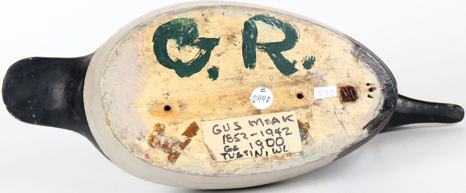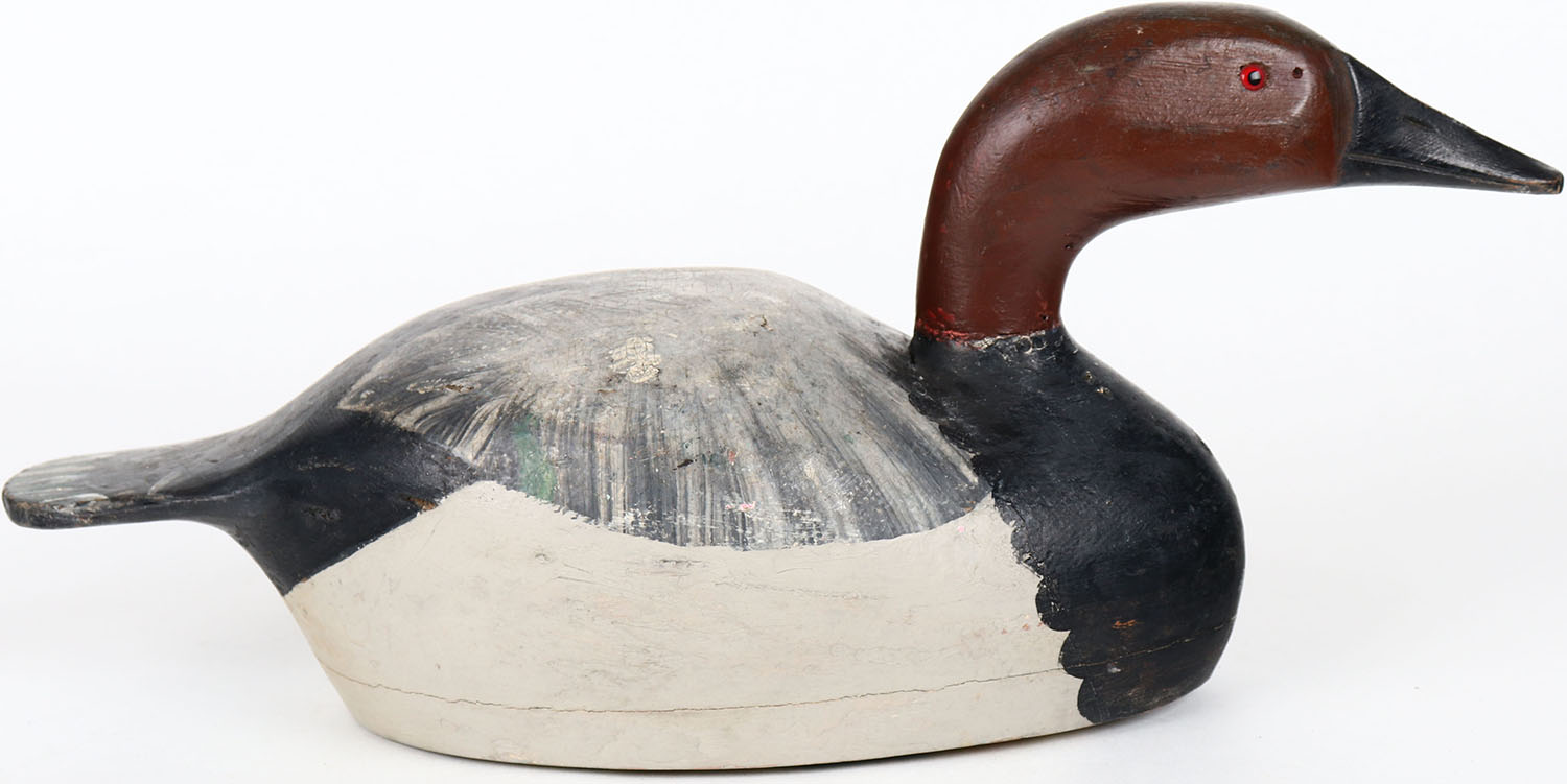 Canvasback Drake by Gus Moak, Tustin, WI, glass eyes, solid wood, structurally excellent, signed on bottom, repaint. Grade: Excellent + - Value: 60 to 150