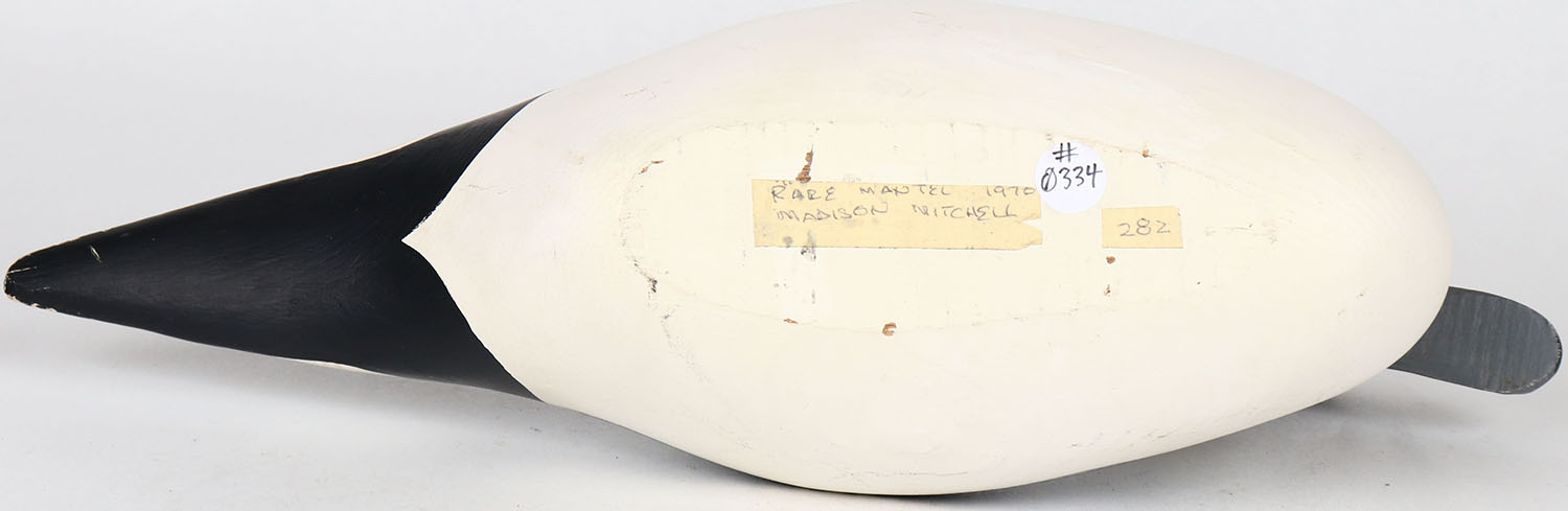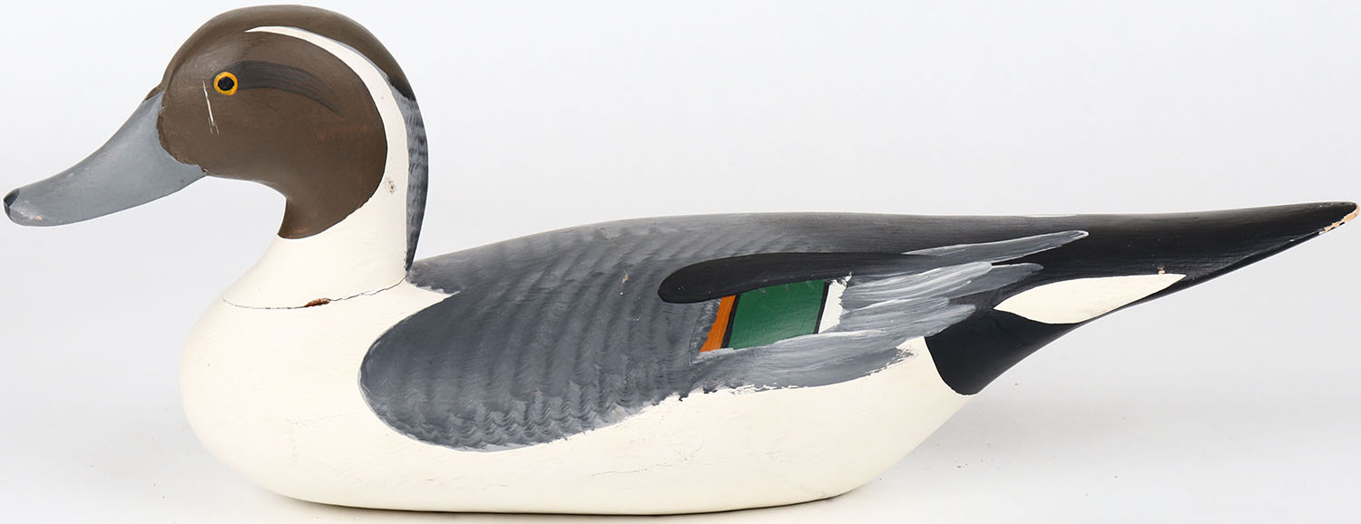 Pintail Drake by Madison Mitchell, painted eyes, solid wood, has age crack around neck, signed on bottom, original paint. Grade: Very Good ++ - Value: 150 to 300