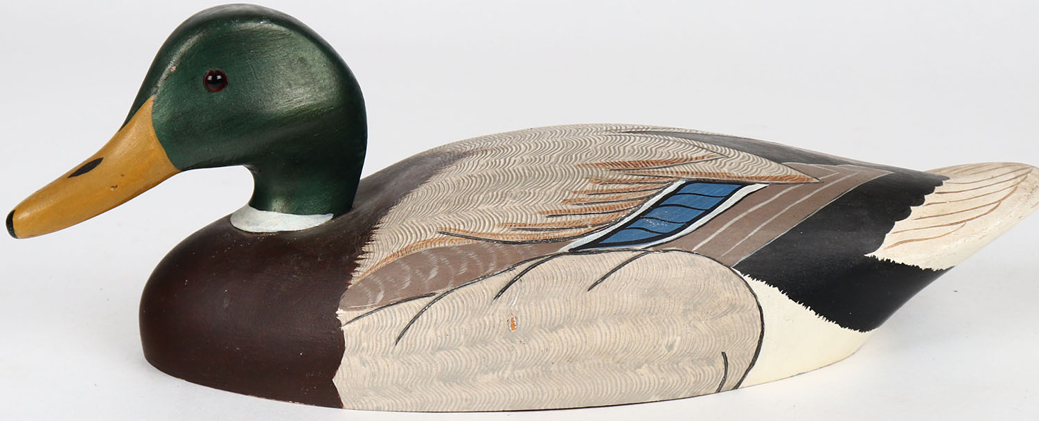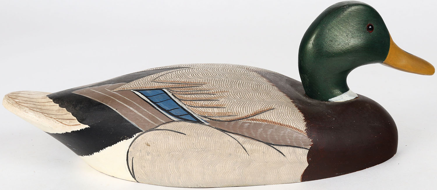 Mallard Drake by Wildfowler Decoys Babylon, N.Y. glass eyes, solid wood, structurally excellent, branded by WILDFOWLER DECOYS on bottom, original paint with comb painting. Grade: MINT - Value: 60 to 150
