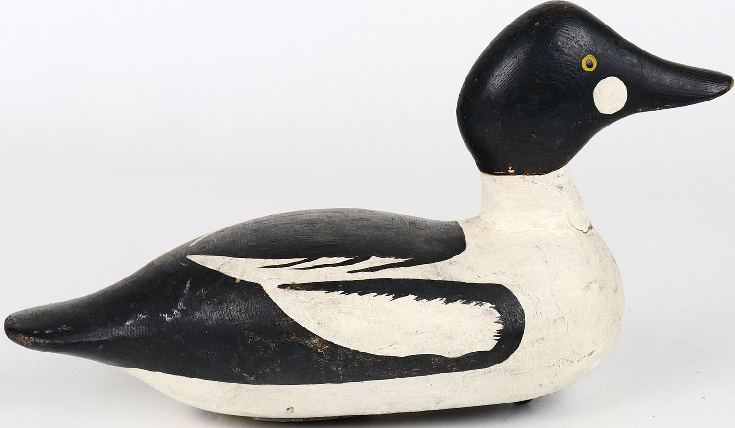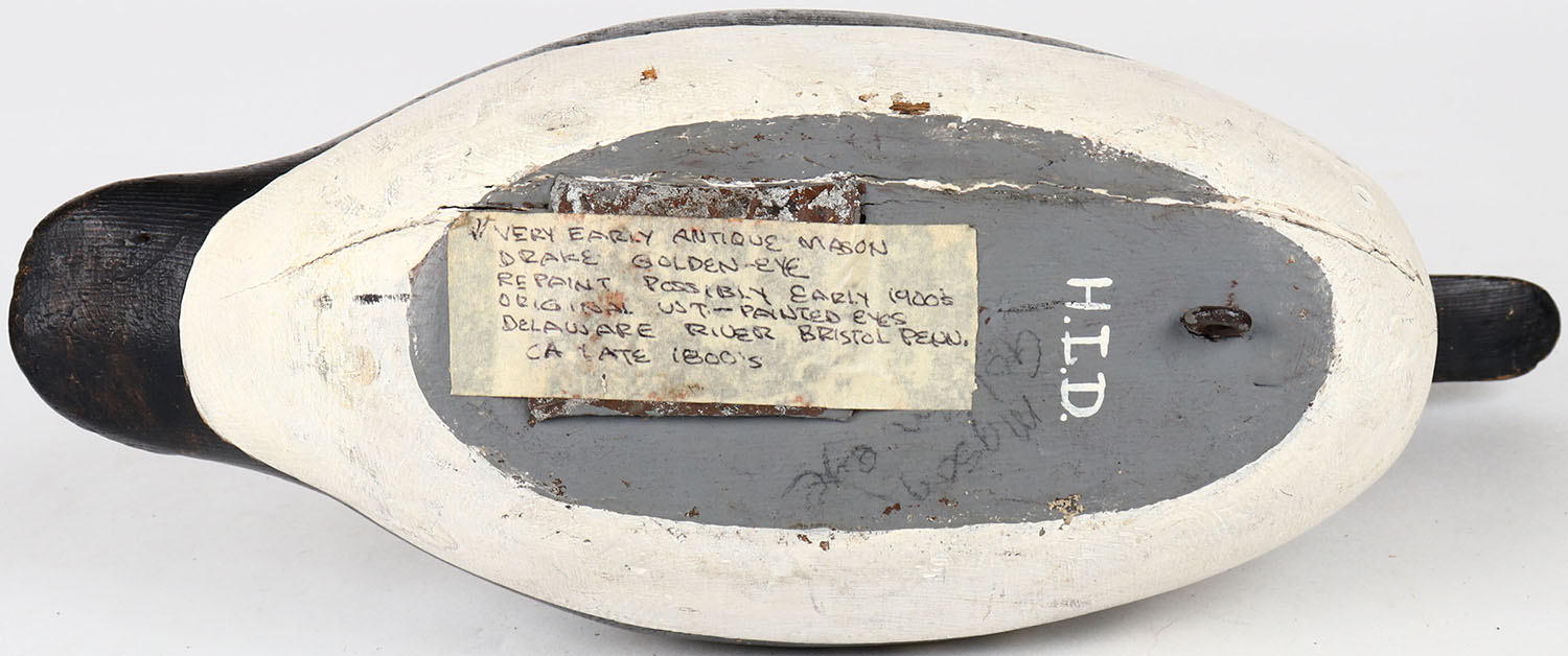 Goldeneye Drake by unknown maker, painted eyes, solid wood, has age cracks on body and around neck, branded on bottom, repainted. Grade: Very Good ++ - Value: 30 to 60