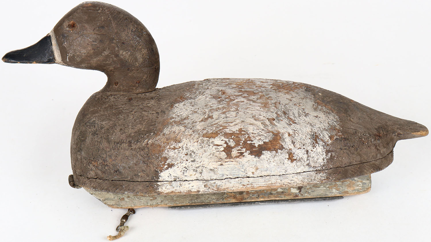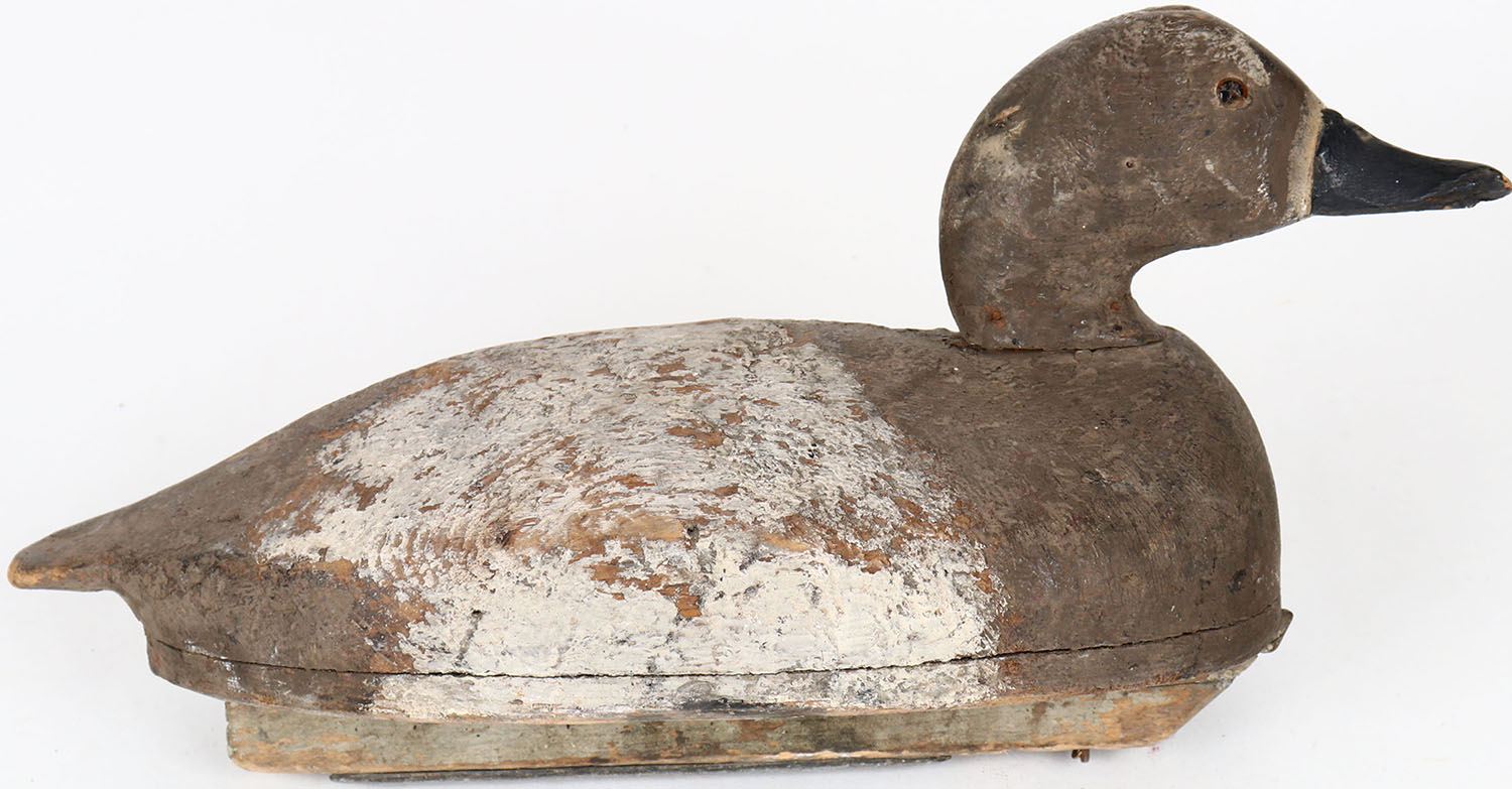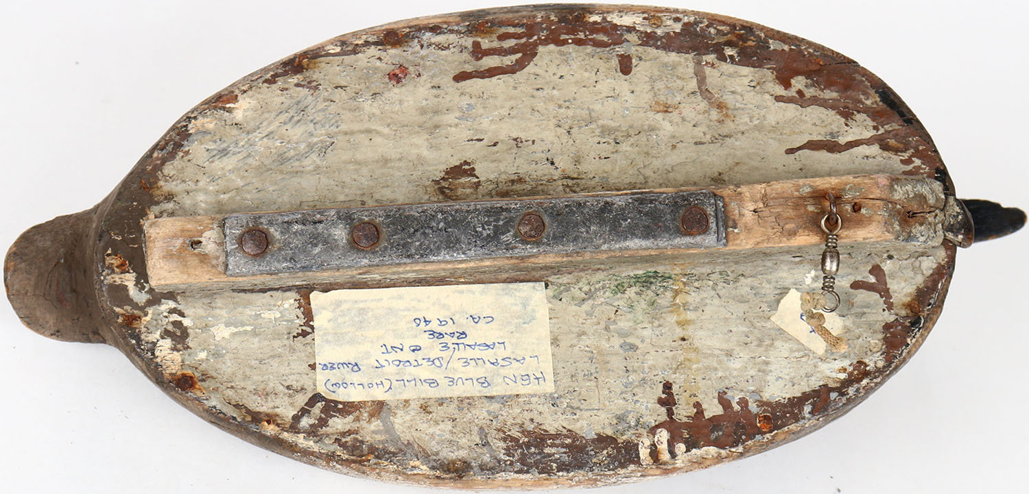 Bluebill Hen by unknown maker, Lasalle / Detroit River, ONT. glass eyes, one eye is missing, has age cracks on body and head, hollow wood, structurally excellent, original paint. Grade: Very Good + - Value: 30 to 60