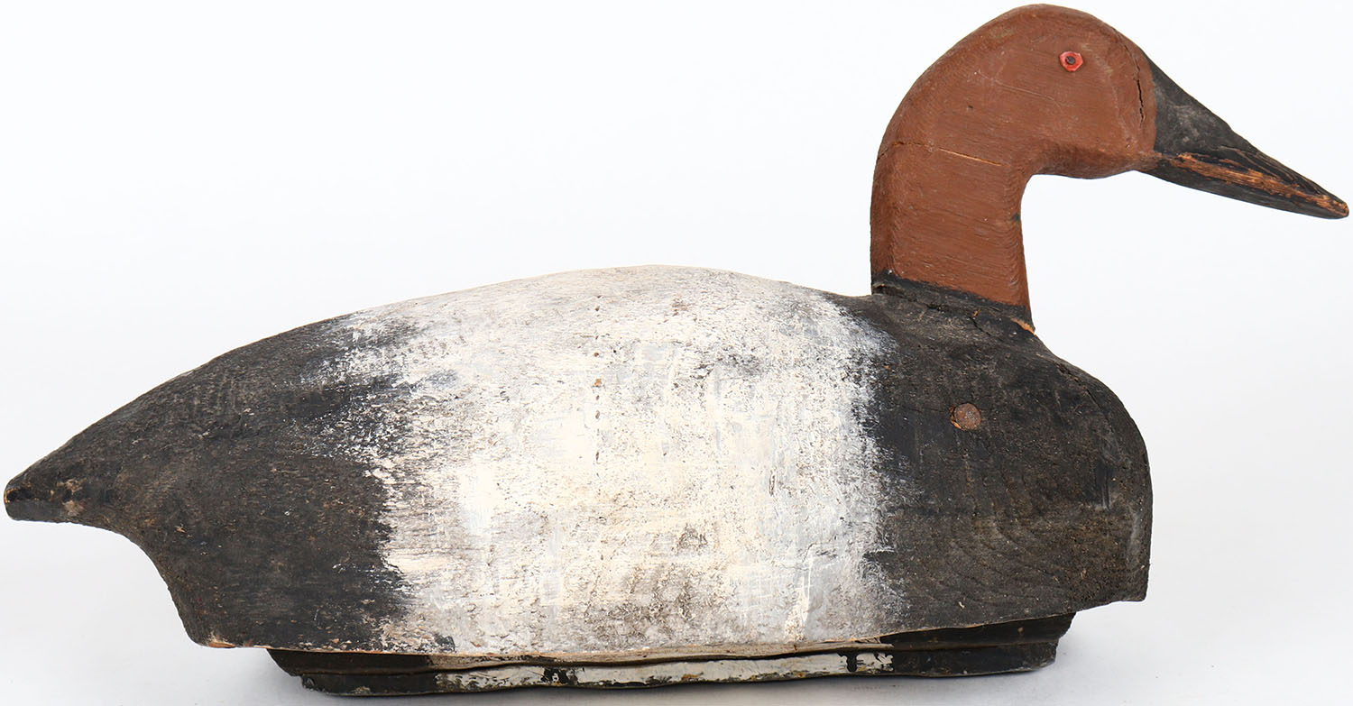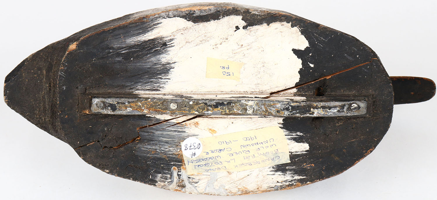 Canvasback Drake by unknown maker, Lk Poygan, Wolf River WI, nailed eyes, solid wood, has age cracks on body, head is loose, original paint. Grade: Very Good + - Value: 30 to 60