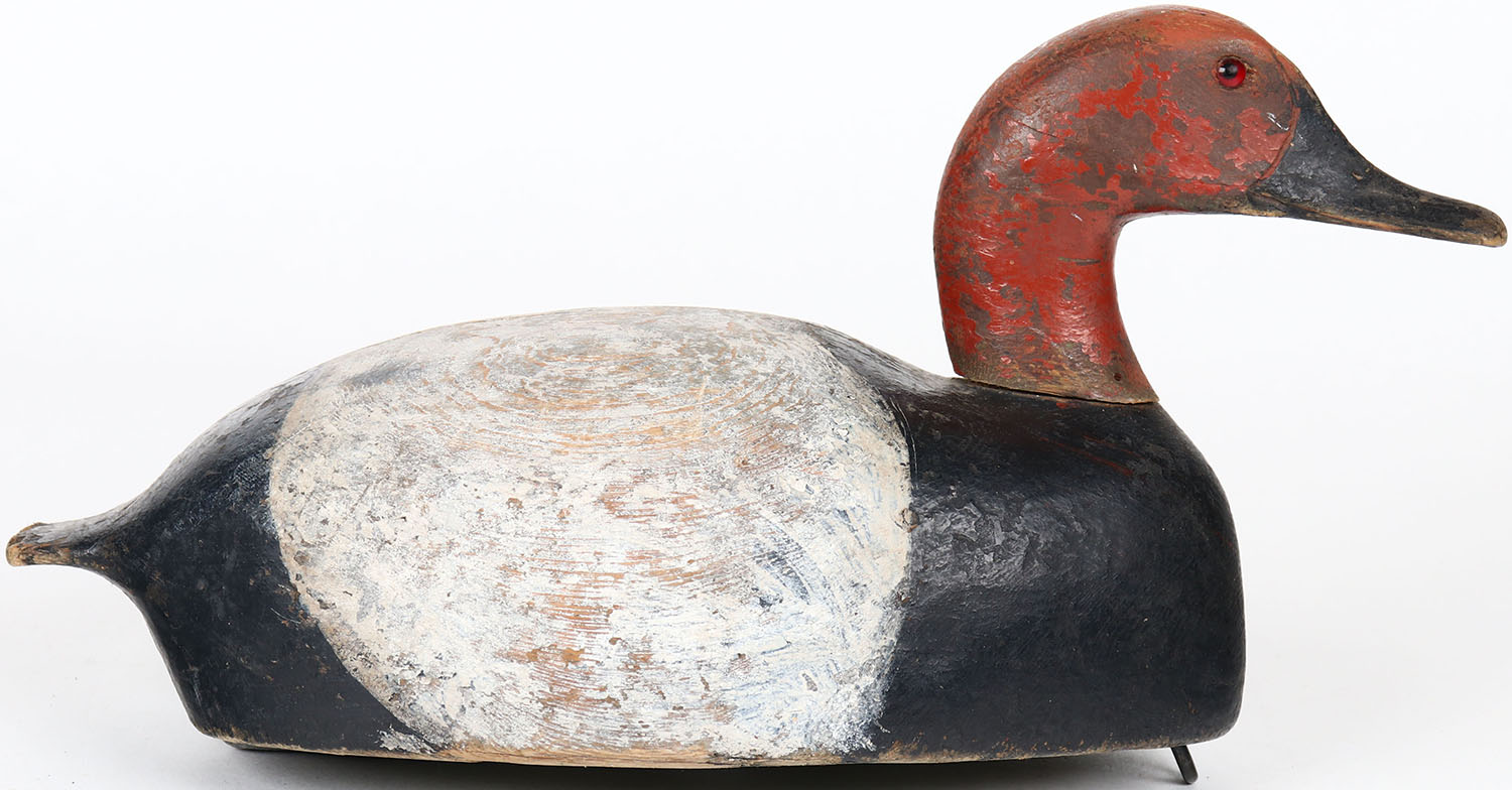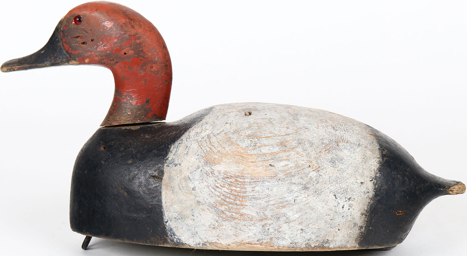 Canvasback Drake by WT, glass eyes, solid wood, head is loose, has age crack on back, branded WT on bottom, original paint. Grade: Very Good ++ - Value: 30 to 60