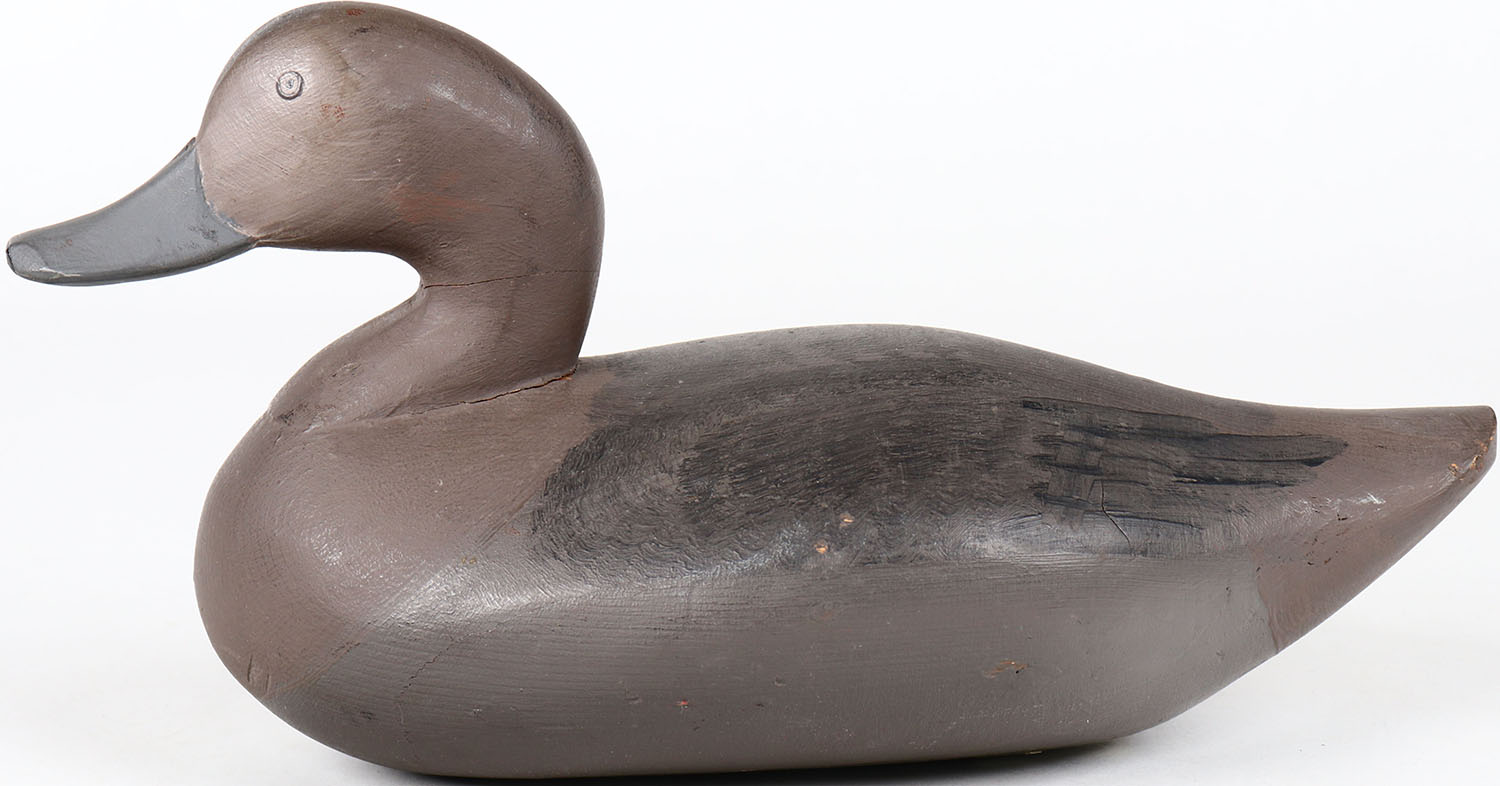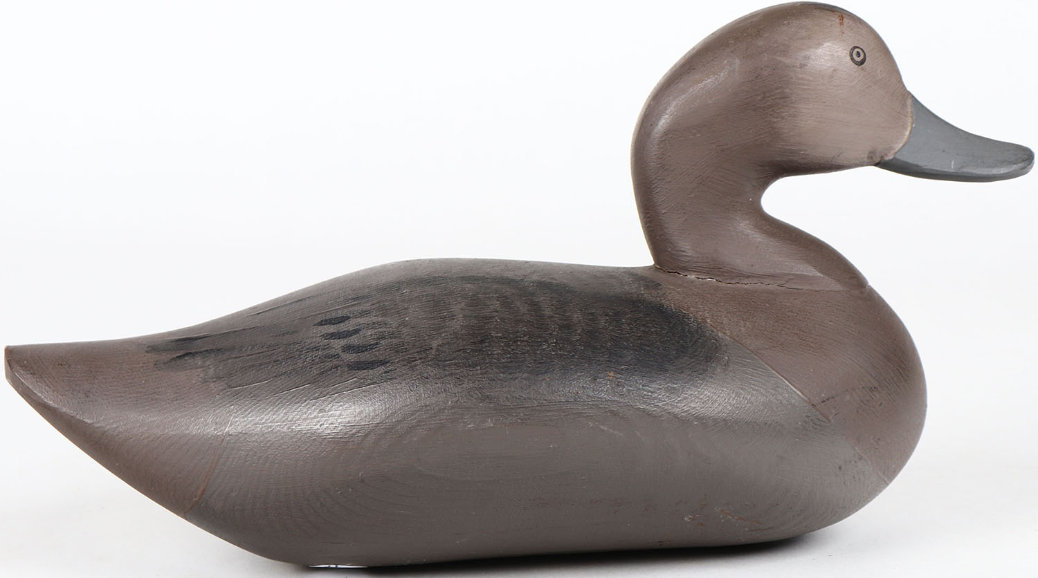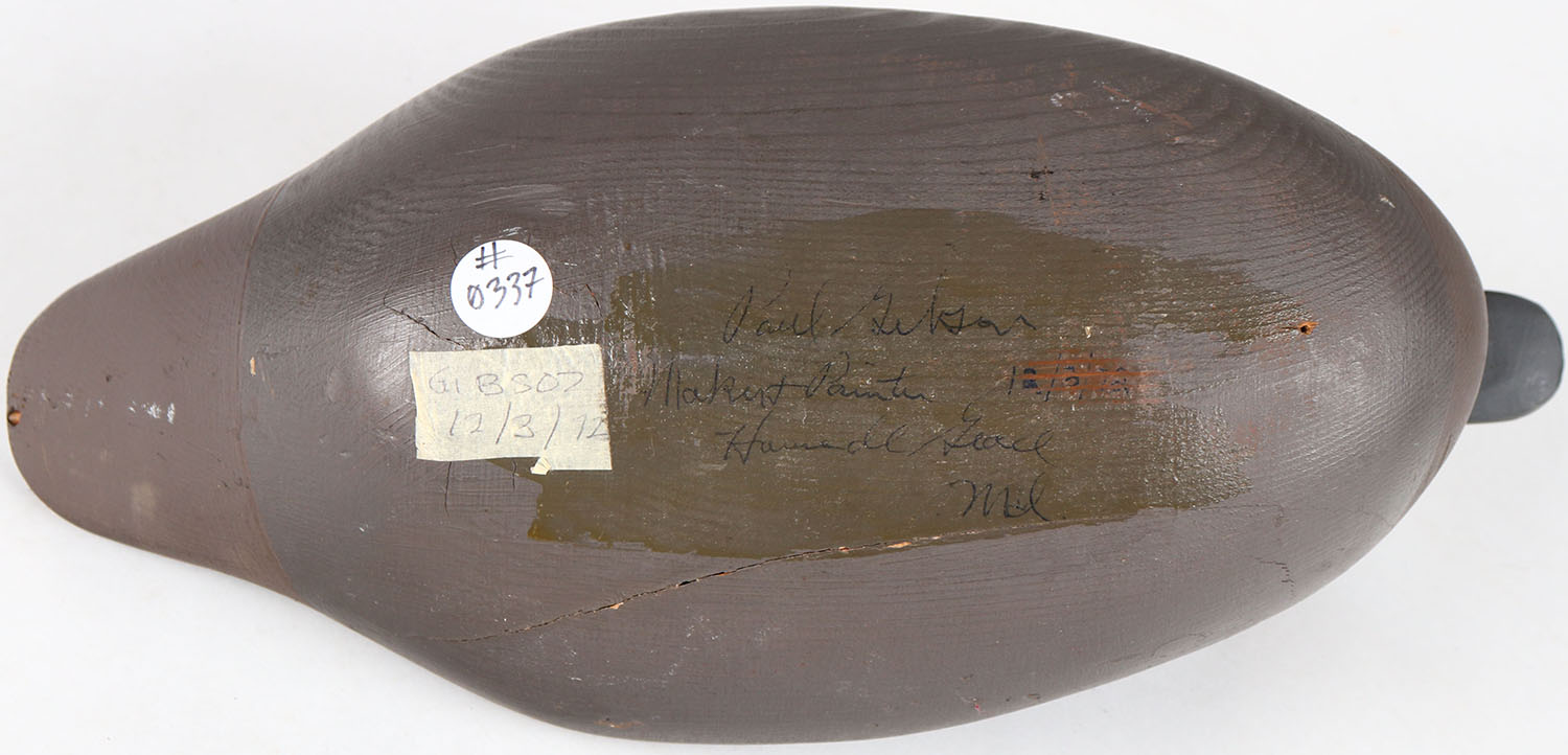 Bluebill Hen by Paul Gibson, Havre de Grace, MD, painted eyes, solid wood, has age crack on bottom, signed on bottom, original paint. Grade: Very Good ++ - Value: 70 to 200