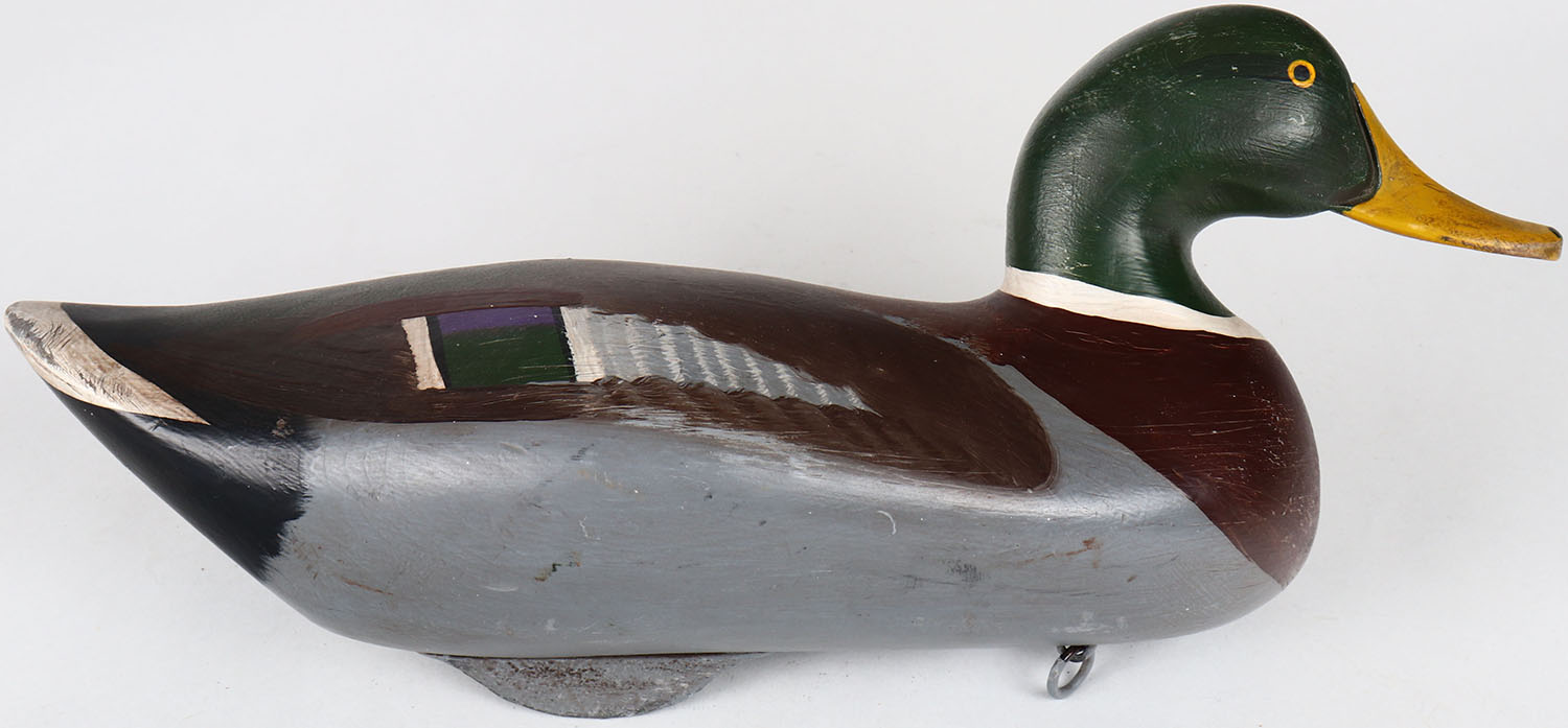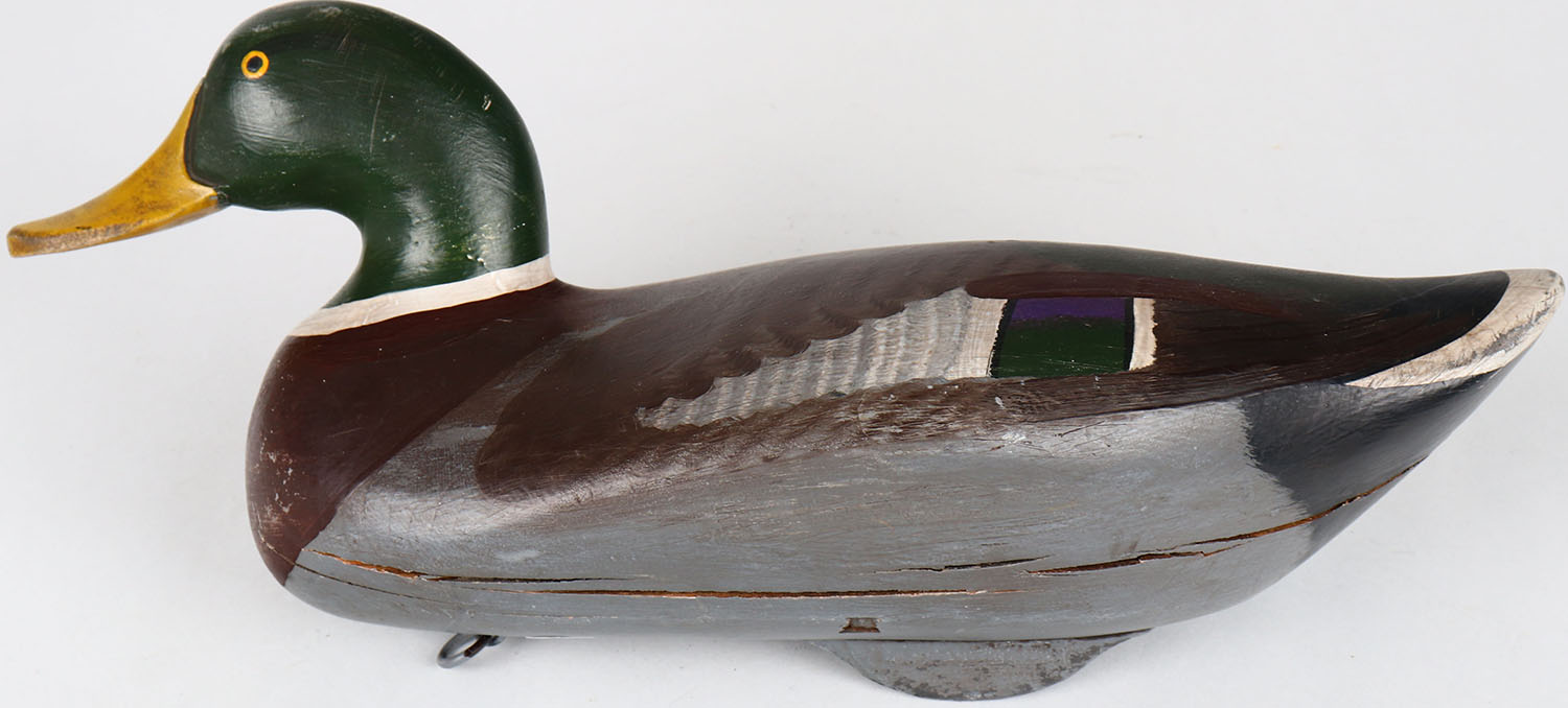 Mallard Drake by Harry Jobes, Harve De Grace, MD. painted eyes, solid wood, has age cracks on bottom, signed on bottom, repainted. Grade: Very Good ++ - Value: 60 to 150