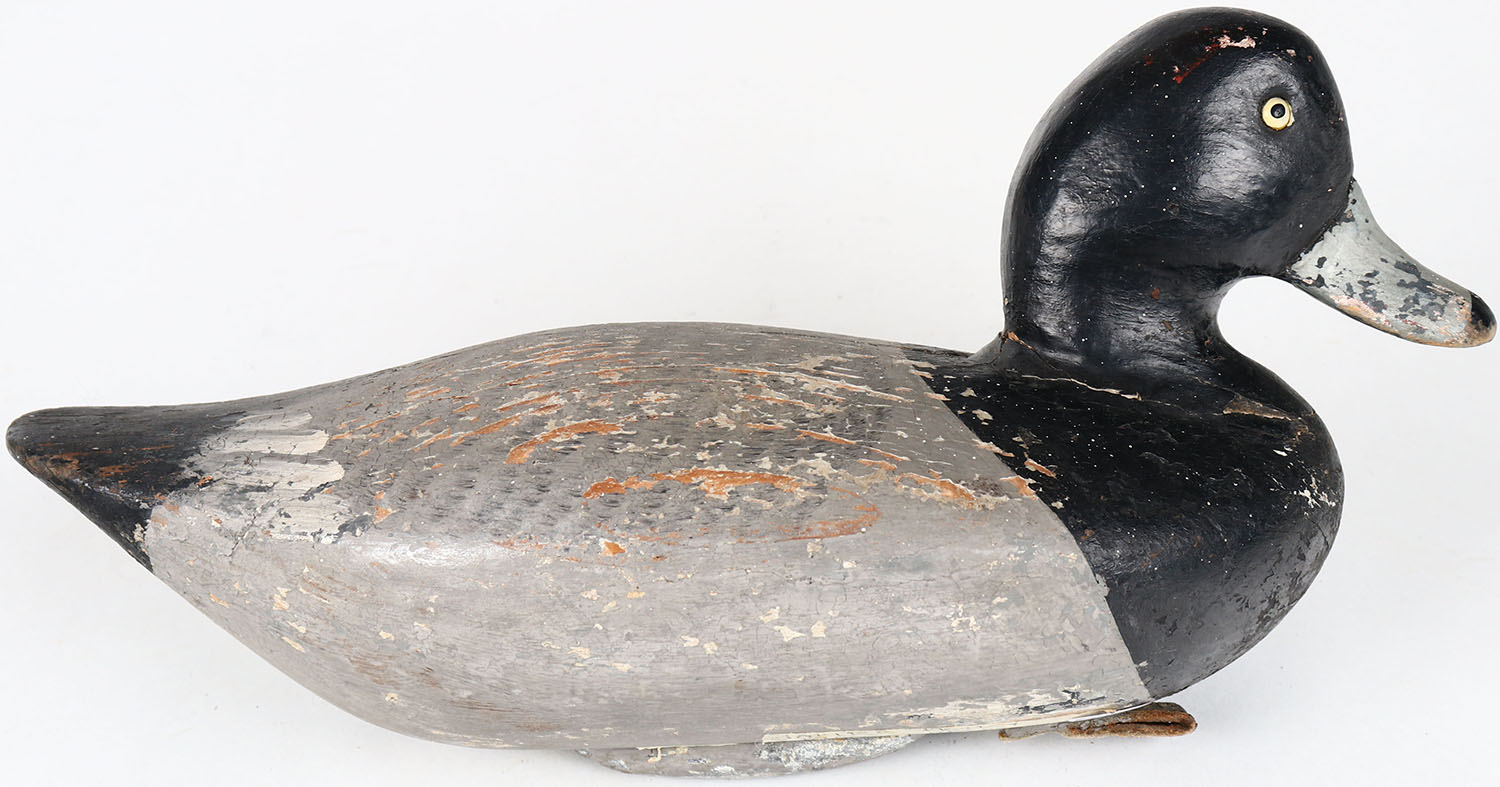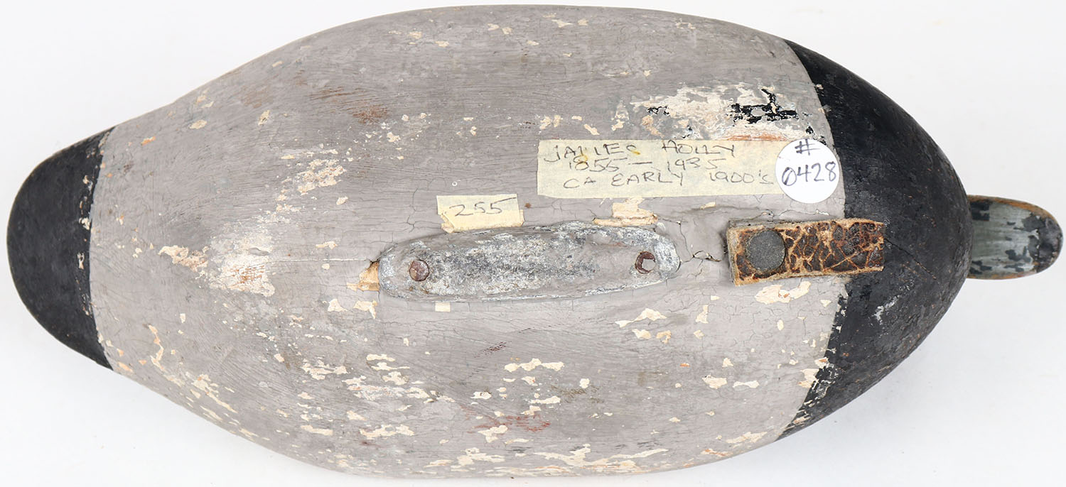 Bluebill Drake by James Holly, Havre de Grace, MD, painted eyes, solid wood, has age cracks on bottom and around neck, signed on bottom, original paint. Grade: Very Good ++ - Value: 60 to 150