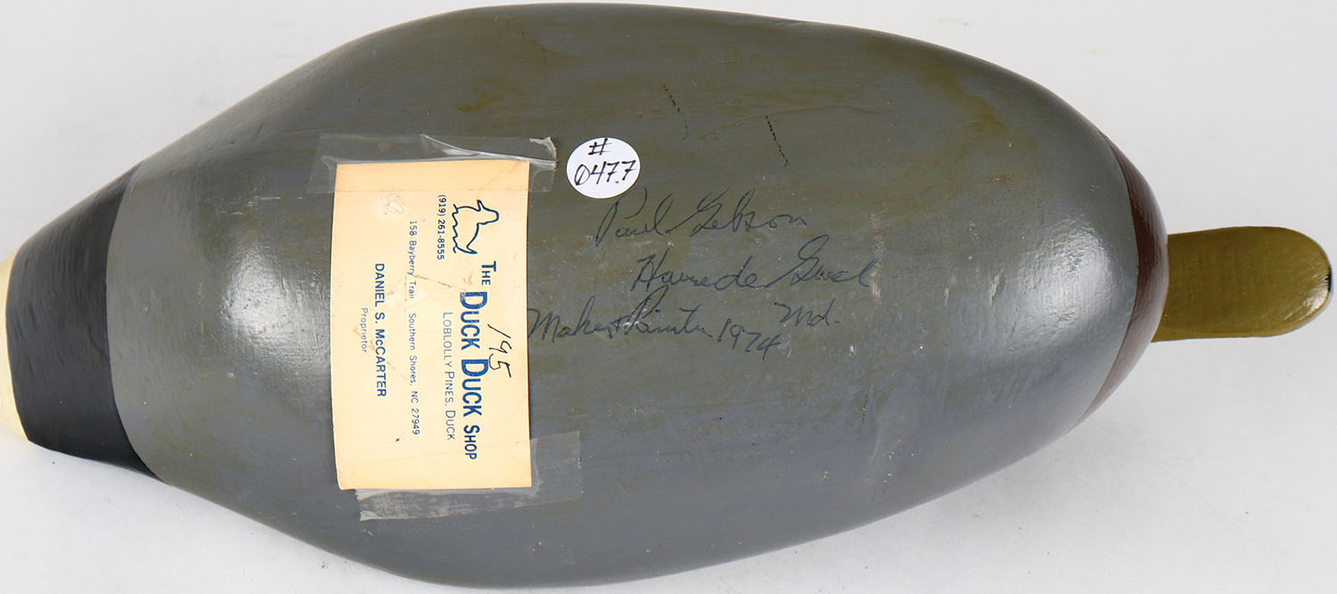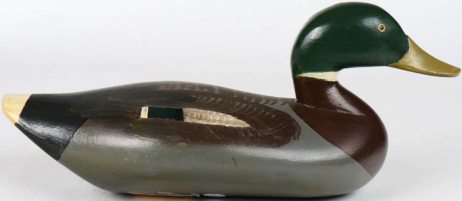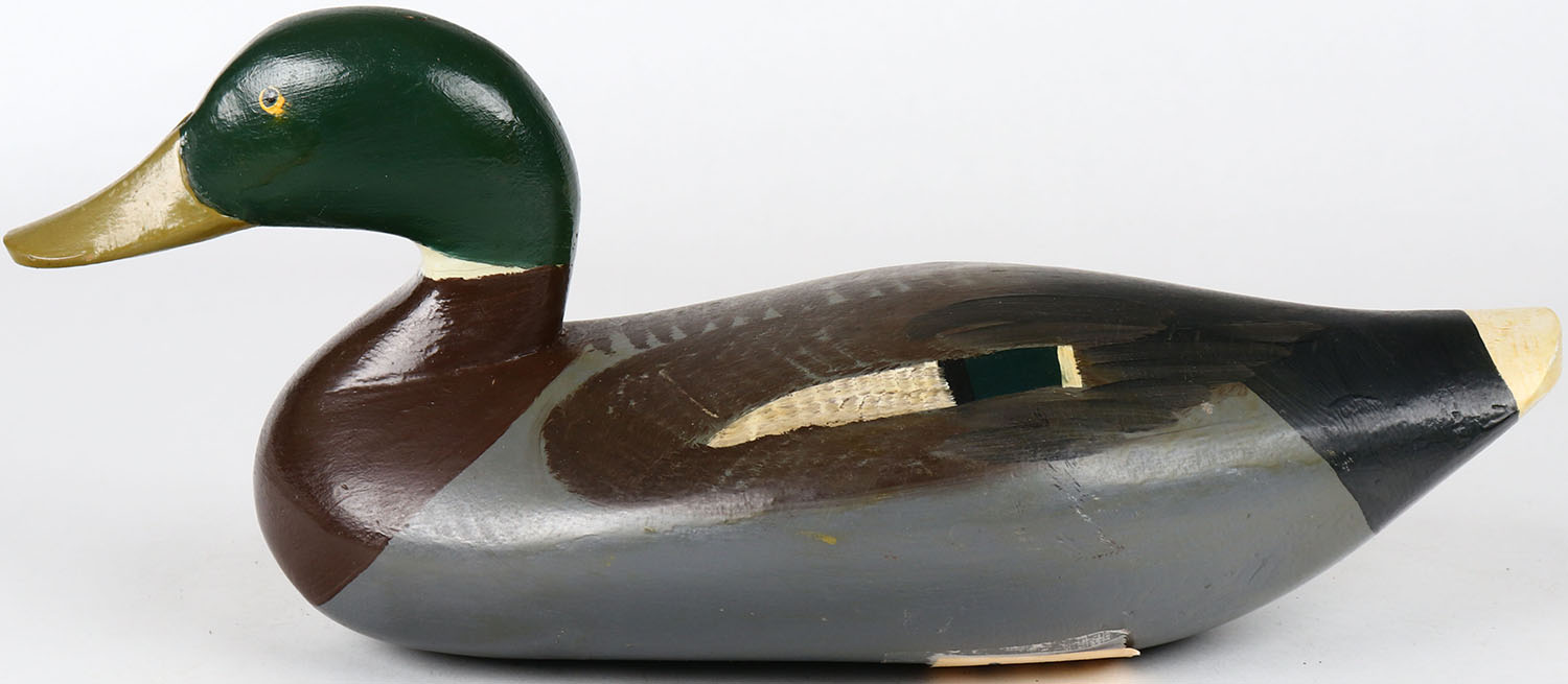 Mallard Drake by Paul Gibson, Havre de Grace, MD, painted eyes, solid wood, structurally excellent, signed on bottom, original paint. Grade: MINT - Value: 60 to 150