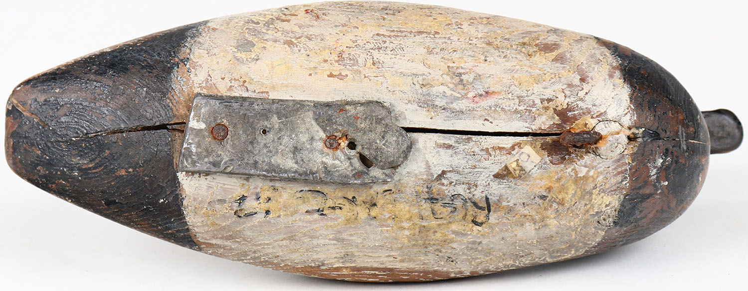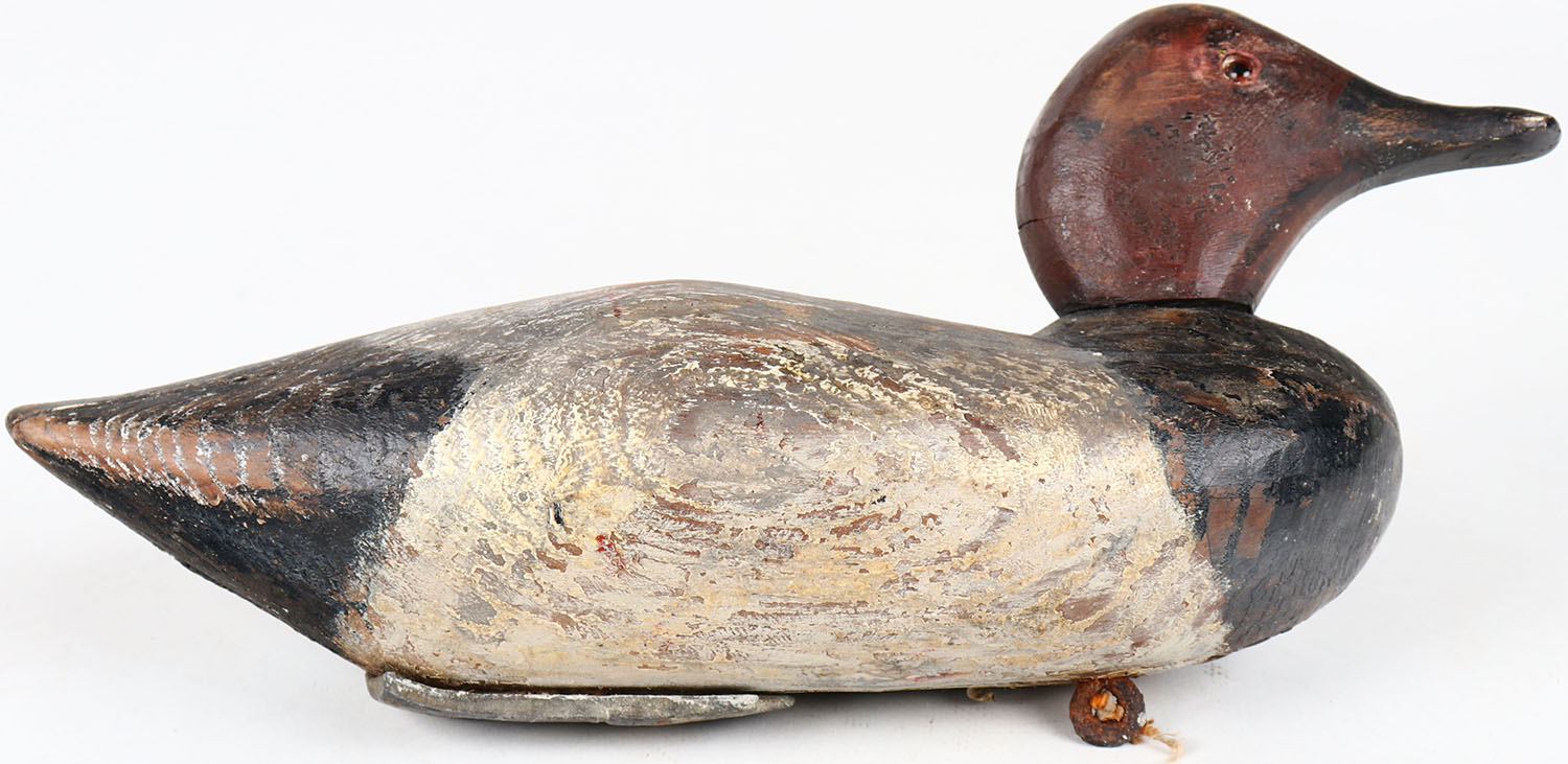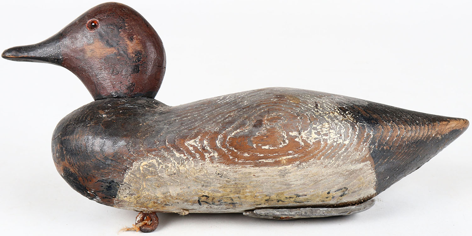 Redhead Drake by Peterson Decoy Co.?, glass eyes, solid wood, structurally excellent, signed on bottom, original paint. Grade: Very Good ++ - Value: 30 to 60