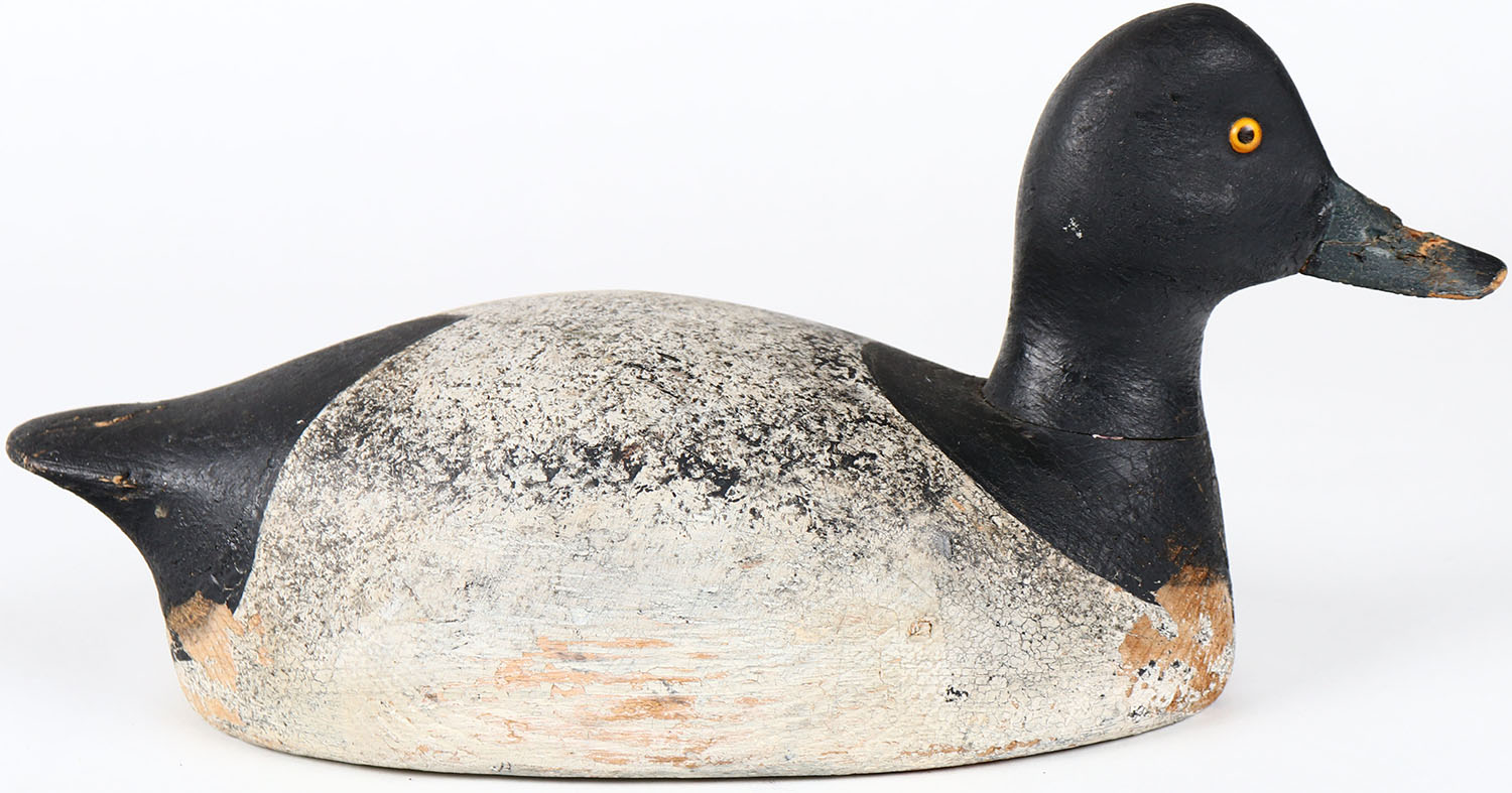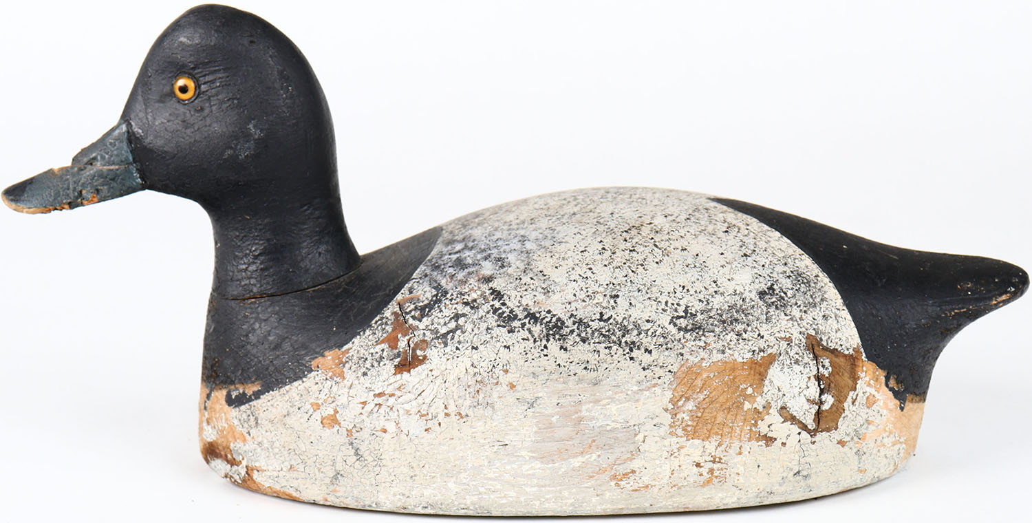 Bluebill Drake by Harold E. Wieckert, glass eyes, solid wood, bill is chipped on top, signed on bottom, original paint. Grade: Very Good ++ - Value: 70 to 200