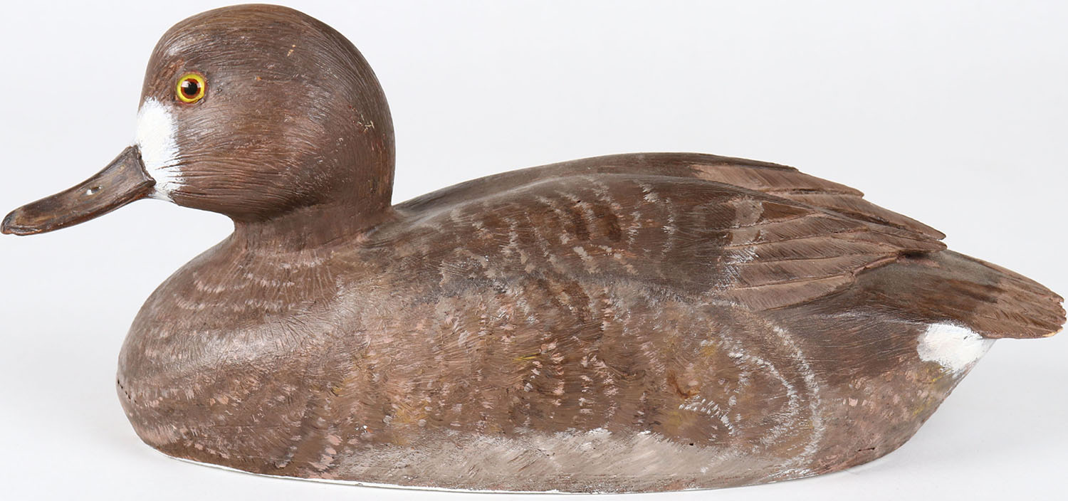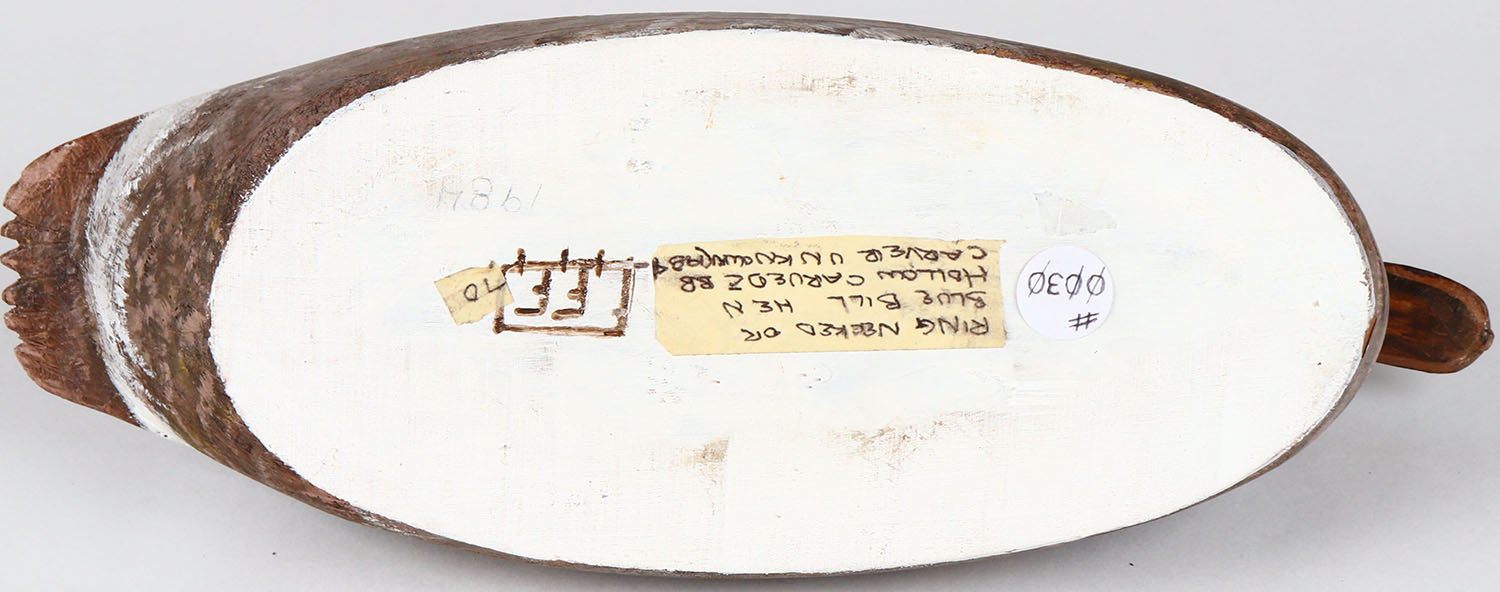 Bluebill Hen by unknown maker, glass eyes, hollow wood, structurally excellent, original paint. Grade: MINT - Value: 70 to 200